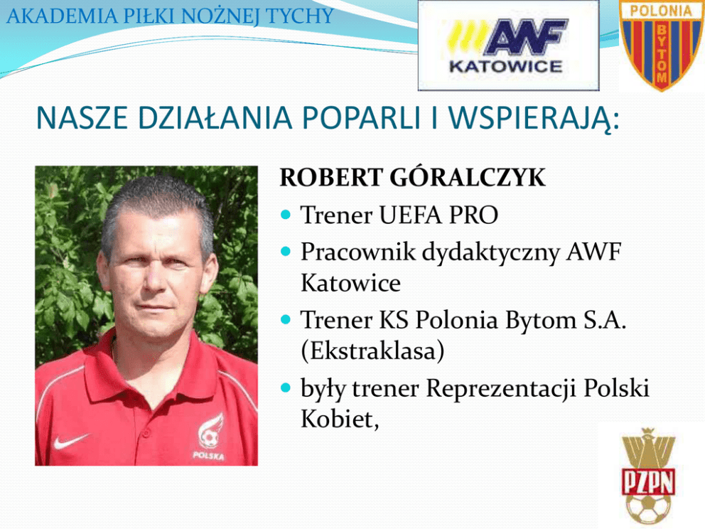 AKADEMIA PIŁKI NOŻNEJ TYCHY NASZE DZIAŁANIA POPARLI I WSPIERAJĄ: ROBERT GÓRALCZYK Trener UEFA PRO Pracownik dydaktyczny AWF Katowice Trener KS Polonia Bytom S.A. (Ekstraklasa) były trener Reprezentacji Polski Kobiet, „ Po zapoznaniu się z materiałami informującymi o inicjatywie utworzenia nowego miejskiego klubu piłkarskiego i systemu szkolenia sportowego dzieci i młodzieży w piłce nożnej w Tychach wyrażam pozytywną opinię o tym przedsięwzięciu. Przyjęte założenia wydają się dawać nadzieję na usystematyzowanie procesu szkolenia, co powinno zaowocować osiąganiem lepszych efektów szkoleniowych, a tym samym podniesieniem poziomu piłki nożnej w Tychach i miejscowościach ościennych. Po wdrożeniu planowanego systemu należy pamiętać, że jako wymierny cel weryfikacji powyższej inicjatywy należy stawiać wprowadzanie w przyszłości jak największej ilości wychowanków do zespołów seniorskich różnych szczebli rozgrywkowych na terenie miasta i w okolicach. Cele w zakresie piłki dziecięcej i młodzieżowej należy traktować jedynie jako etapowe, mające utwierdzać w słuszności obranej drogi i mobilizujące do dalszej pracy. Po wdrożeniu opracowywanego systemu, w trakcie jego funkcjonowania, życzę wielu sukcesów i realizacji przyjętych założeń.” Ze sportowym pozdrowieniem Robert Góralczyk Cały tekst listu na www.apntychy.futbolowo.pl AKADEMIA PIŁKI NOŻNEJ TYCHY NASZE DZIAŁANIA WSPIERAJĄ: MARCIN DORNA – trener UEFA A, Trener I Klasy, trener reprezentacji Polski U-15 i U-16, Wykładowca w szkole trenerów PZPN AKADEMIA PIŁKI NOŻNEJ TYCHY NASZE DZIAŁANIA WSPIERAJĄ: MAREK ŚLEDŹ członek Wydziału Piłkarstwa Młodzieżowego PZPN, trener koordynator Lecha Poznań, Trener Kadry Polski U-11 Trener Koordynator i Trener Grup Młodzieżowych. Mistrzostwo Polski Juniorów Starszych – 2007 r. III Miejsce Mistrzostw Polski Juniorów Młodszych – 2006 r. Wice Mistrzostwo Juniorów Młodszych – 2005 r. 2003 - MKS Polonia Słubice – Trener I zespołu seniorów (III liga) Koordynator sekcji młodzieżowej. 1997 – 2003 - Stowarzyszenie Edukacji Młodych Piłkarzy w Warszawie – Dyrektor. 1996 – 2003 - Stowarzyszenie Edukacji Młodych Piłkarzy w Warszawie – Trener Grup Młodzieżowych. 1998 – 2002 - Mazowiecki Związek Piłki Nożnej – Trener Reprezentacji Warszawy, Makroregionu Warszawsko – Mazurskiego, Województwa Mazowieckiego. Mistrzostwo Polski (Puchar W. Kuchara) – 2000 r. III Miejsce Mistrzostw Polski (Puchar K. Deyny) – 2001 r. Przekazany mi do konsultacji Program Organizacji Szkolenia Dzieci i Młodzieży w Tychach jest w pełni zbieżny z ogólnopolskim projektem organizacji szkolenia proponowanym przez WPM PZPN. Przyjęta w projekcie etapizacja szkoleniowa oraz rozwiązania korelujące nauczanie ogólne z piłkarskim umiejscowione w klasach sportowych są dostosowane do jedynie zwiększającego efektywność szkolenia systemowego ujęcia problemu. Jednakże nie ten aspekt budzi moje uznanie. Myślę iż macie Państwo możliwość bycia prekursorami ujednolicenia edukacji szkolnej, piłkarskiej i wychowania dzieci i młodzieży ku wartościom w pełni aprobowanym społecznie ponad lokalnymi podziałami, tak popularnymi w wielu innych ośrodkach sportowych kraju. Wielokrotnie publikowane doświadczenia związane z funkcjonowaniem opartym o chorą rywalizację oraz lokalne animozje pomiędzy podmiotami biorącymi udział w szeroko pojętym sportowym procesie edukacji dzieci i młodzieży przynosiły z reguły jedynie negatywne wyniki. Taka próba „miejskiego” usystematyzowania opartego o jednolitą programowość, piłkarskiego kształcenia uzdolnionej młodzieży jest zbliżona do obowiązującej w wielu znamienitych klubach Europy konsekwentnie realizowanej strategii szkoleniowej. Myślę iż takie zunifikowanie szkolenia w kilku klubach dotychczas pracujących w oderwanych od siebie „systemach okazjonalnych” jest podstawą do dalszego rozwojowego ujęcia całości problematyki dotyczącej organizacji szkolenia dzieci i młodzieży w Państwa środowisku. Dziś stajecie Państwo przed szansą rozpoczęcia pogoni za piłkarską Europą oraz wysokokwalifikowanymi klubami Polski, i choć należy mieć świadomość wielu trudów, problemów, konfliktów, które będą udziałem rozpoczętego procesu, to moim skromnym zdaniem warto i jeszcze raz warto w sposób uczciwy i etycznie pożądany realizować rozpoczęte zamierzenia, bo jak mawiał Profesor Bartoszewski, zapytany „czy opłaca się być uczciwym?” odpowiadał „ Nie opłaca się, ale warto”! Powodzenia Marek Śledź AKADEMIA PIŁKI NOŻNEJ TYCHY NASZE DZIAŁANIA WSPIERAJĄ: MAREK WLECIAŁOWSKI Obecnie II trener Śląska Wrocław, Członek Rady Trenerów Śląskiego ZPN II trener Cracovii Kraków, I trener Piasta Gliwice, 249 występów w ekstraklasie w barwach Ruchu Chorzów. AKADEMIA PIŁKI NOŻNEJ TYCHY NASZE DZIAŁANIA WSPIERAJĄ: DARIUSZ GĘSIOR TRENER UEFA A były reprezentant Polski we wszystkich kategoriach wiekowych, zawodnik Ruchu Chorzów, Widzewa Łódź, Amica Wronki, Obecnie Koordynator ds. młodzieży KS RUCH Chorzów, członek Wydziału Piłkarstwa Młodzieżowego PZPN, „Wyrażam pełną akceptację Waszego projektu. Uważam, że szkolenie młodzieży w naszym kraju potrzebuje dużych zmian. W Polsce brakuje profesjonalnie działających szkółek młodzieżowych, dla których liczy się jakość a nie ilość. Najlepsi muszą trenować z najlepszymi wtedy robią postępy, dlatego stworzenie klubu, który będzie zrzeszał najzdolniejszych daje im większe szanse na rozwój i osiągnięcie sukcesu sportowego. Pozdrawiam i życzę powodzenia w realizacji wspaniałego pomysłu, który wychowa w Tychach wielu wspaniałych piłkarzy.” Dariusz Gęsior „NA ŚWIECIE WSPANIAŁE JEST NIE TO, W KTÓRYM MIEJSCU STOIMY, LECZ TO, W JAKIM KIERUNKU PODĄŻAMY” OLIVIER WENDELL HOLMES DZIĘKUJEMY ZA UWAGĘ ZAPRASZAMY DO DYSKUSJI 