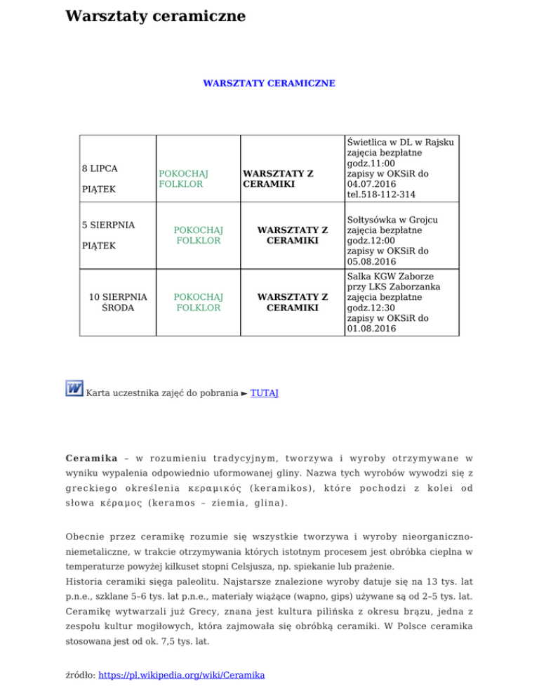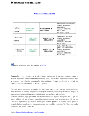 Warsztaty ceramiczne WARSZTATY CERAMICZNE 8 LIPCA PIĄTEK 5 SIERPNIA PIĄTEK 10 SIERPNIA ŚRODA POKOCHAJ FOLKLOR POKOCHAJ FOLKLOR POKOCHAJ FOLKLOR WARSZTATY Z CERAMIKI WARSZTATY Z CERAMIKI WARSZTATY Z CERAMIKI Świetlica w DL w Rajsku zajęcia bezpłatne godz.11:00 zapisy w OKSiR do 04.07.2016 tel.518-112-314 Sołtysówka w Grojcu zajęcia bezpłatne godz.12:00 zapisy w OKSiR do 05.08.2016 Salka KGW Zaborze przy LKS Zaborzanka zajęcia bezpłatne godz.12:30 zapisy w OKSiR do 01.08.2016 Karta uczestnika zajęć do pobrania ► TUTAJ Ceramika – w rozumieniu tradycyjnym, tworzywa i wyroby otrzymywane w wyniku wypalenia odpowiednio uformowanej gliny. Nazwa tych wyrobów wywodzi się z greckiego określenia κεραμικός (keramikos), które pochodzi z kolei od słowa κέραμος (keramos – ziemia, glina). Obecnie przez ceramikę rozumie się wszystkie tworzywa i wyroby nieorganicznoniemetaliczne, w trakcie otrzymywania których istotnym procesem jest obróbka cieplna w temperaturze powyżej kilkuset stopni Celsjusza, np. spiekanie lub prażenie. Historia ceramiki sięga paleolitu. Najstarsze znalezione wyroby datuje się na 13 tys. lat p.n.e., szklane 5–6 tys. lat p.n.e., materiały wiążące (wapno, gips) używane są od 2–5 tys. lat. Ceramikę wytwarzali już Grecy, znana jest kultura pilińska z okresu brązu, jedna z zespołu kultur mogiłowych, która zajmowała się obróbką ceramiki. W Polsce ceramika stosowana jest od ok. 7,5 tys. lat. źródło: https://pl.wikipedia.org/wiki/Ceramika