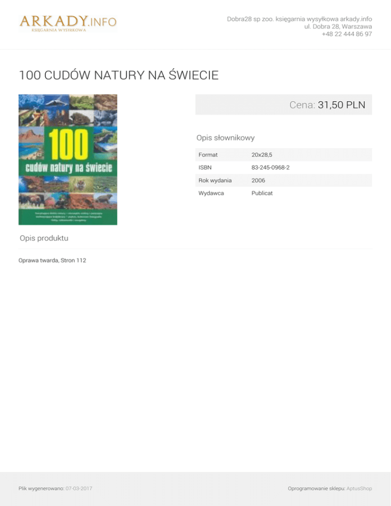 Dobra28 sp zoo. księgarnia wysyłkowa arkady.info ul. Dobra 28, Warszawa +48 22 444 86 97 100 CUDÓW NATURY NA ŚWIECIE Cena: 31,50 PLN Opis słownikowy Format 20x28,5 ISBN 83-245-0968-2 Rok wydania 2006 Wydawca Publicat Opis produktu Oprawa twarda, Stron 112 Plik wygenerowano: 07-03-2017 Powered by TCPDF (www.tcpdf.org) Oprogramowanie sklepu: AptusShop