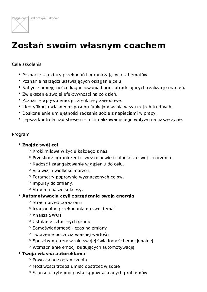 Image not found or type unknown Zostań swoim własnym coachem Cele szkolenia Poznanie struktury przekonań i ograniczających schematów. Poznanie narzędzi ułatwiających osiąganie celu. Nabycie umiejętności diagnozowania barier utrudniających realizację marzeń. Zwiększenie swojej efektywności na co dzień. Poznanie wpływu emocji na sukcesy zawodowe. Identyfikacja własnego sposobu funkcjonowania w sytuacjach trudnych. Doskonalenie umiejętności radzenia sobie z napięciami w pracy. Lepsza kontrola nad stresem – minimalizowanie jego wpływu na nasze życie. Program Znajdź swój cel Kroki milowe w życiu każdego z nas. Przeskocz ograniczenia –weź odpowiedzialność za swoje marzenia. Radość i zaangażowanie w dążeniu do celu. Siła wizji i wielkość marzeń. Parametry poprawnie wyznaczonych celów. Impulsy do zmiany. Strach a nasze sukcesy. Automotywacja czyli zarządzanie swoją energią Strach przed porażkami Irracjonalne przekonania na swój temat Analiza SWOT Ustalanie sztucznych granic Samoświadomość – czas na zmiany Tworzenie poczucia własnej wartości Sposoby na trenowanie swojej świadomości emocjonalnej Wzmacnianie emocji budujących automotywację Twoja własna autoreklama Powracające ograniczenia Możliwości trzeba umieć dostrzec w sobie Szanse ukryte pod postacią powracających problemów Warunki fizyczne i okoliczności zewnętrzne a my sami i nasze sukcesy Twoje marzenia i inspiracje Bliska i daleka gratyfikacja Dotrzyj do swojego JA Zaplanuj swoje sukcesy Mapa sukcesu w biznesie i życiu prywatnym Metoda Kurta Vonneguta – czyli jak osiągać więcej poprzez planowanie „od końca” Technika Walta Disneya – sprawdź jak wiele możesz Metoda GROW – jako metoda autocoachingowa Rodzaje pytań Skuteczne pytania – dialog wewnętrzny Poszukiwanie nowości – magia w przekraczaniu granic Ja jako swój własny inspirator – narzędzia służące do rozwoju wewnętrznego Metoda spostrzegania sytuacji z innej perspektywy Złap zdrowy dystans - siła medytacji i wizualizacji Redukcja napięć stresowych w życiu zawodowym i prywatnym – techniki Zwiększenie zdolności twórczych – rozbudzenie swojego geniuszu Rozwój osobowości a wizualizacje Zwiększenie koncentracji a medytacje Rola negatywnych myśli w podświadomości – sposoby usuwania Nauka dyscypliny wewnętrznej a autocoaching Zmiany w odbieraniu i przeżywaniu codziennego życia Metamorfoza duchowa skutkiem codziennym wizualizacji i autochoachingu Silne ego a fortyfikacja przed światem Autocoaching przyszłością światowych korporacji Jak się zgłosić Aby skorzystać z warsztatu i doskonalić swoje umiejętności proszę o przesłanie wypełnionego formularza zgłoszeniowego na adres e-mail [email protected] lub pod nr faxu 32 757 00 36 lub 32 470 11 75 bądź zadzwoń do nas 32 470 11 75.