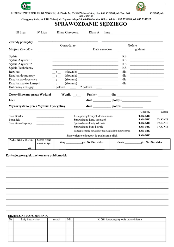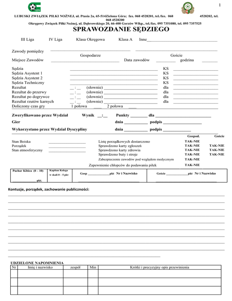 1 LUBUSKI ZWIĄZEK PIŁKI NOŻNEJ, ul. Ptasia 2a, 65-514Zielona Góra; fax. 068 4528201, tel./fax. 068 4528202, tel. 068 4528200 Okręgowy Związek Piłki Nożnej, ul. Dąbrowskiego 20, 66-400 Gorzów Wlkp., tel./fax. 095 7351080, tel. 095 7357525 SPRAWOZDANIE SĘDZIEGO III Liga Zawody pomiędzy Miejsce Zawodów IV Liga Klasa Okręgowa Klasa A _________________________________________ Inne____________________________________ __________________________________________ Gospodarze ___________________________________ Sędzia Sędzia Asystent 1 Sędzia Asystent 2 Sędzia Techniczny Rezultat Rezultat do przerwy Rezultat po dogrywce Rezultat rzutów karnych Doliczony czas gry Data zawodów Goście godzina __________ _____________________________________________ _____________________________________________ _____________________________________________ _____________________________________________ (słownie) _________________________ __ : __ (słownie) _________________________ __ : __ (słownie) _________________________ __ : __ (słownie) _________________________ __ : __ 1 połowa ____ 2 połowa ____ Zweryfikowano przez Wydział Wynik __:__ KS KS KS KS dla dla dla dla _______________________ _______________________ _______________________ _______________________ _______________________ _______________________ _______________________ _______________________ Punkty ________ dla __________________________ Gier dnia ___________ podpis __________________ Wykorzystano przez Wydział Dyscypliny dnia ___________ podpis _____________ Stan Boiska Porządek Stan atmosferyczny ___________________ ___________________ ___________________ Gospod. Goście Listę porządkowych dostarczono Sprawdzono karty zgłoszeń Sprawdzono karty zdrowia Sprawdzono buty i stroje TAK-NIE TAK-NIE TAK-NIE TAK-NIE TAK-NIE TAK-NIE TAK-NIE Zabezpieczenie zawodów pod względem medycznym TAK-NIE TAK-NIE Zapewnienie chłopców do podawania piłek Puchar Kibica (0 – 10) Kapitan Kolega w skali 0 – 5 pkt _______________ pkt. ________ Gosp ______________pkt Nr i Nazwisko Goście ______________pkt Nr i Nazwisko ________________________________________ _______________________________________ Kontuzje, porządek, zachowanie publiczności: _____________________________________________________________________________________________________ _____________________________________________________________________________________________________ _____________________________________________________________________________________________________ _____________________________________________________________________________________________________ _____________________________________________________________________________________________________ _____________________________________________________________________________________________________ _____________________________________________________________________________________________________ _____________________________________________________________________________________________________ _____________________________________________________________________________________________________ _______________________________________________________________________ UDZIELONE NAPOMNIENIA Nr Imię i nazwisko zespół Min Krótki i precyzyjny opis przewinienia 2 UDZIELONE WYKLUCZENIA Nr Imię i nazwisko zespół Min Krótki i precyzyjny opis przewinienia Inne uwagi: ________________________________________________________________________________________________ ________________________________________________________________________________________________ ________________________________________________________________________________________________ ________________________________________________________________________________________________ ________________________________________________________________________________________________ ________________________________________________________________________________________________ ________________________________________________________________________________________________ ________________________________________________________________________________________________ ________________________________________________________________________________________________ ________________________________________________________________________________________________ ________________________________________________________________________________________________ Miejscowość _______________________ Dnia___________ Podpis sędziego_________________________ Uwaga: wypełniony protokół należy zwrócić sędziemu najpóźniej na 30 minut przed rozpoczęciem zawodów Gospodarze: ______________________________________ Barwy kostiumów__________________________________ Nr Br. Kpt. Nazwisko i imię zawodnika (wpisać drukowanymi literami) Data urodzenia 3 Nr Nazwisko i imię zawodnika rezerwowego (wpisać drukowanymi literami) Data urodzenia Br. Nr Nazwisko i imię (wpisać drukowanymi literami) 1 Funkcja Trener Numer licencji trenerskiej: 2 3 4 5 6 Kapitan i kierownik drużyny, czytelnie podpisują wypełnione w sprawozdaniu z zawodów składy drużyn, poświadczając w ten sposób uprawnienia do udziału w zawodach zgłoszonych przez nich zawodników i zawodników rezerwowych. Jak również potwierdzają tożsamość wpisanych do sprawozdania osób funkcyjnych. Czytelny podpis Kapitan: numer ____ podpis ______________________ Kierownik drużyny: podpis __________________________ Zmiany zawodników (wypełnia sędzia po zakończeniu zawodów): Nr Nazwisko i imię (wpisać drukowanymi literami) Zszedł Wszedł Zszedł Wszedł Zszedł Wszedł Zszedł Wszedł Zszedł Wszedł Zszedł Wszedł Zszedł Wszedł Minuta Minuta Minuta Minuta Minuta Minuta Minuta Opieka medyczna Pieczątka lub nazwisko i numer dowodu oraz podpis Uwaga: wypełniony protokół należy zwrócić sędziemu najpóźniej na 30 minut przed rozpoczęciem zawodów, Goście: ________