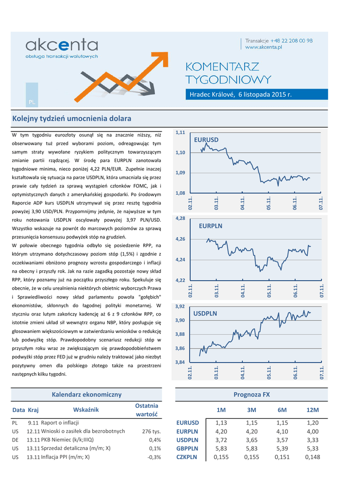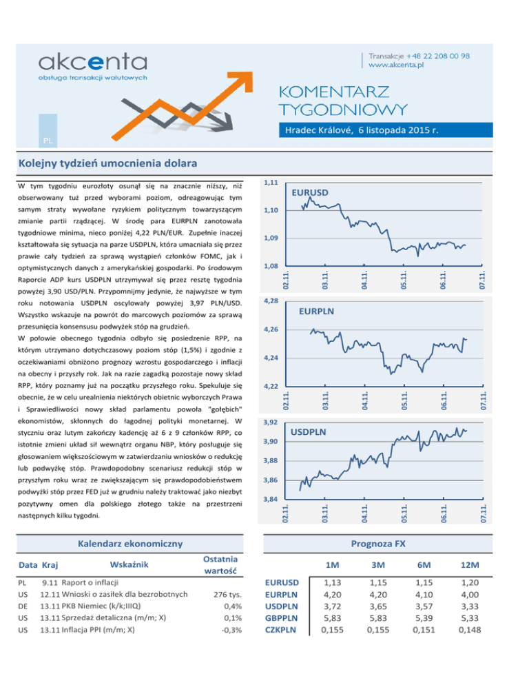 Hradec Králové, 6 listopada 2015 r. Kolejny tydzień umocnienia dolara W tym tygodniu eurozłoty osunął się na znacznie niższy, niż 1,11 EURUSD obserwowany tuż przed wyborami poziom, odreagowując tym samym straty wywołane ryzykiem politycznym towarzyszącym 1,10 zmianie partii rządzącej. W środę para EURPLN zanotowała tygodniowe minima, nieco poniżej 4,22 PLN/EUR. Zupełnie inaczej kształtowała się sytuacja na parze USDPLN, która umacniała się przez 1,09 prawie cały tydzień za sprawą wystąpień członków FOMC, jak i roku notowania USDPLN oscylowały powyżej 3,97 PLN/USD. 07.11. 06.11. 4,28 EURPLN Wszystko wskazuje na powrót do marcowych poziomów za sprawą przesunięcia konsensusu podwyżek stóp na grudzień. 05.11. powyżej 3,90 USD/PLN. Przypomnijmy jedynie, że najwyższe w tym 04.11. Raporcie ADP kurs USDPLN utrzymywał się przez resztę tygodnia 03.11. 1,08 02.11. optymistycznych danych z amerykańskiej gospodarki. Po środowym 4,26 W połowie obecnego tygodnia odbyło się posiedzenie RPP, na którym utrzymano dotychczasowy poziom stóp (1,5%) i zgodnie z oczekiwaniami obniżono prognozy wzrostu gospodarczego i inflacji 4,24 na obecny i przyszły rok. Jak na razie zagadką pozostaje nowy skład ekonomistów, skłonnych do łagodnej polityki monetarnej. W głosowaniem większościowym w zatwierdzaniu wniosków o redukcję 07.11. 06.11. 3,92 USDPLN styczniu oraz lutym zakończy kadencję aż 6 z 9 członków RPP, co istotnie zmieni układ sił wewnątrz organu NBP, który posługuje się 05.11. i Sprawiedliwości nowy skład parlamentu powoła "gołębich" 04.11. obecnie, że w celu urealnienia niektórych obietnic wyborczych Prawa 03.11. 4,22 02.11. RPP, który poznamy już na początku przyszłego roku. Spekuluje się 3,90 3,88 lub podwyżkę stóp. Prawdopodobny scenariusz redukcji stóp w Kalendarz ekonomiczny Data Kraj PL US DE US US Wskaźnik 9.11 Raport o inflacji 12.11 Wnioski o zasiłek dla bezrobotnych 13.11 PKB Niemiec (k/k;IIIQ) 13.11 Sprzedaż detaliczna (m/m; X) 13.11 Inflacja PPI (m/m; X) 07.11. 06.11. 05.11. następnych kilku tygodni. 3,84 04.11. pozytywny omen dla polskiego złotego także na przestrzeni 3,86 03.11. podwyżki stóp przez FED już w grudniu należy traktować jako niezbyt 02.11. przyszłym roku wraz ze zwiększającym się prawdopodobieństwem Prognoza FX Ostatnia wartość 276 tys. 0,4% 0,1% -0,3% EURUSD EURPLN USDPLN GBPPLN CZKPLN 1M 3M 6M 12M 1,13 4,20 3,72 5,83 0,155 1,15 4,20 3,65 5,83 0,155 1,15 4,10 3,57 5,39 0,151 1,20 4,00 3,33 5,33 0,148