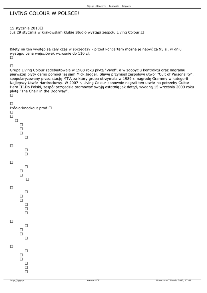 Gigs.pl - Koncerty :: Festiwale :: Imprezy LIVING COLOUR W POLSCE! 15 stycznia 2010 Już 29 stycznia w krakowskim klubie Studio wystąpi zespołu Living Colour. Bilety na ten występ są cały czas w sprzedaży - przed koncertem można je nabyć za 95 zł, w dniu występu cena wejściówek wzrośnie do 110 zł. Grupa Living Colour zadebiutowała w 1988 roku płytą "Vivid", a w zdobyciu kontraktu oraz nagraniu pierwszej płyty demo pomógł jej sam Mick Jagger. Sławę przyniósł zespołowi utwór "Cult of Personality", spopularyzowany przez stację MTV, za który grupa otrzymała w 1989 r. nagrodę Grammy w kategorii Najlepszy Utwór Hardrockowy. W 2007 r. Living Colour ponownie nagrali ten utwór na potrzeby Guitar Hero III.Do Polski, zespół przyjedzie promować swoją ostatnią jak dotąd, wydaną 15 września 2009 roku płytę "The Chair in the Doorway". źródło:knockout prod. http://gigs.pl Kreator PDF Utworzono 7 March, 2017, 17:01 Gigs.pl - Koncerty :: Festiwale :: Imprezy http://gigs.pl Kreator PDF Utworzono 7 March, 2017, 17:01 Gigs.pl - Koncerty :: Festiwale :: Imprezy http://gigs.pl Kreator PDF Utworzono 7 March, 2017, 17:01