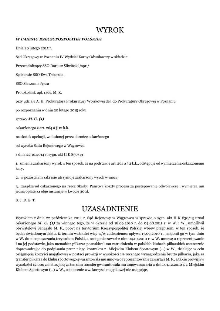 WYROK W IMIENIU RZECZYPOSPOLITEJ POLSKIEJ Dnia 20 lutego 2015 r. Sąd Okręgowy w Poznaniu IV Wydział Karny Odwoławczy w składzie: Przewodniczący SSO Dariusz Śliwiński /spr./ Sędziowie SSO Ewa Taberska SSO Sławomir Jęksa Protokolant: apl. radc. M. K. przy udziale A. H. Prokuratora Prokuratury Wojskowej del. do Prokuratury Okręgowej w Poznaniu po rozpoznaniu w dniu 20 lutego 2015 roku sprawy M. C. (1) oskarżonego z art. 264 a § 12 k.k. na skutek apelacji, wniesionej przez obrońcę oskarżonego od wyroku Sądu Rejonowego w Wągrowcu z dnia 22.10.2014 r. sygn. akt II K 830/13 1. zmienia zaskarżony wyrok w ten sposób, że na podstawie art. 264 a § 2 k.k., odstępuje od wymierzenia oskarżonemu kary, 2. w pozostałym zakresie utrzymuje zaskarżony wyrok w mocy, 3. zasądza od oskarżonego na rzecz Skarbu Państwa koszty procesu za postępowanie odwoławcze i wymierza mu jedną opłatę za obie instancje w kwocie 30 zł. S. J. D. E. T. UZASADNIENIE Wyrokiem z dnia 22 października 2014 r. Sąd Rejonowy w Wągrowcu w sprawie o sygn. akt II K 830/13 uznał oskarżonego M. C. (1) za winnego tego, że w okresie od 18.09.2010 r. do 04.08.2011 r. w W. i W., umożliwił obywatelowi Senegalu M. F., pobyt na terytorium Rzeczypospolitej Polskiej wbrew przepisom, w ten sposób, że będąc świadomym faktu, iż termin ważności wizy w/w cudzoziemca upływa 17.09.2010 r., nakłonił go w tym dniu w W. do nieopuszczania terytorium Polski, a następnie zawarł z nim 04.10.2010 r. w W. umowę o reprezentowanie i na jej podstawie, jako menadżer piłkarza poszukiwał mu zatrudnienia w polskich klubach piłkarskich ostatecznie doprowadzając do podpisania przez niego kontraktu z Miejskim Klubem Sportowym (...) w W., działając w celu osiągnięcia korzyści majątkowej w postaci prowizji w wysokości 1% rocznego wynagrodzenia brutto piłkarza, jaką za transfer piłkarza do klubu sportowego gwarantowała mu umowa o reprezentowanie zawarta z M. F., a także prowizji w wysokości 12.000 zł netto, jaką za ten sam transfer gwarantowała mu umowa zawarta w dniu 01.12.2010 r. z Miejskim Klubem Sportowym (...) w W., ostatecznie ww. korzyści majątkowej nie osiągając, tj. przestępstwa z art. 264a § 1 kk i za to przestępstwo na podstawie art. 264a § 1 kk w zw. z art. 58 § 3 kk wymierzył mu karę 100 stawek dziennych grzywny po 200 zł każda. O kosztach procesu orzeczono na podstawie art. 627 kpk oraz art. 3 ust. 1 ustawy z 23 czerwca 1973 r. o opłatach w sprawach karnych (Dz. U. t. jedn. z 1983 r. Nr 49, poz. 223 ze zm.) zasądzając od oskarżonego na rzecz Skarbu Państwa zwrot kosztów sądowych w wysokości 2205,20 zł, w tym opłatę w kwocie 2000 zł. Apelację od powyższego wyroku wniósł obrońca oskarżonego zaskarżając go w całości i zarzucając: 1) obrazę przepisów postępowania, która mogła mieć wpływ na treść zaskarżonego wyroku, a mianowicie art. 7 kpk, poprzez dokonanie dowolnej i sprzecznej z zasadami prawidłowego rozumowania i doświadczenia życiowego oceny dowodu: - z wyjaśnień oskarżonego M. C. (1), poprzez nieuprawnione i niezasadne odmówienie wyjaśnieniom oskarżonego waloru wiarygodności w części, w jakiej oskarżony twierdził, że motywem jego działania w stosunku do M. F. była wywołana prośbami M. F. chęć pomocy nie warunkowana interesem gospodarczym oskarżonego, podczas gdy wyjaśnienia oskarżonego są w tym zakresie spójne, logiczne i wiarygodne, a nadto znajdują poparcie w zgromadzonym w sprawie materiale dowodowym, - z zeznań świadka M.F.poprzez nieuprawnione i niezasadne przyznanie tym zeznaniom waloru wiarygodności, w sytuacji gdy świadek w chwili składania zeznań w placówce Straży Granicznej zdawał sobie sprawę z grożącej mu odpowiedzialności w związku z nielegalnym pobytem na terytorium RP, w związku z czym miał interes w przedstawieniu zdarzeń w sposób obciążający oskarżonego, w tym zeznając, że oskarżony w dniu 21 września 2010 r. na lotnisku O.zabrał mu bilet i nakłonił do pozostania na terytorium RP, a nadto zeznania te nie znajdują potwierdzenia w pozostałym materiale dowodowym zgromadzonym w sprawie, w tym w szczególności w dowodzie z wyjaśnień oskarżonego, zeznań świadka P.S. B.oraz M. S., - z zeznań świadka M. C. (2) poprzez nieuprawnione i niezasadne odmówienie tym zeznaniom waloru wiarygodności w części dotyczącej udziału oskarżonego w przedmiotowych zdarzeniach w wersji przedstawionej w trakcie rozprawy, w sytuacji gdy świadek brał udział w sprowadzeniu zawodnika M. F. do Klubu (...), a zeznania świadka na etapie postępowania przygotowawczego składane były w czasie, gdy świadek był stałym współpracownikiem Klubu (...) i przedstawicieli tego Klubu (...) oraz A. R., którym tak jak świadkowi groziła odpowiedzialność wykroczeniowa i karna w związku z nielegalnym pobytem M. F. na terytorium RP, w związku z czym świadek miał interes przedstawiania zdarzeń w sposób obciążający oskarżonego, w tym w zakresie udziału oskarżonego oraz M. S. w sprowadzeniu M. F. do Klubu (...) a przez to oddalenie odpowiedzialności od siebie oraz swoich zleceniodawców, który to interes w chwili składania zeznań na rozprawie już nie istniał z uwagi na brak wszczęcia postępowania wobec świadka oraz zakończenie postępowania wykroczeniowego i karnego wobec R. K. i A. R., jak też zaprzestanie ww. współpracy, 2) rażącą niewspółmierność kary orzeczonej wobec oskarżonego, polegająca na wymierzeniu oskarżonemu kary grzywny w wysokości 100 stawek dziennych, przy ustaleniu wysokości jednej stawki dziennej na kwotę 200 zł, podczas gdy prawidłowa ocena właściwości i warunków osobistych oskarżonego przemawia za wymierzeniem oskarżonemu kary znacznie łagodniejszej, a ustalenie wysokości rzeczywistych dochodów oskarżonego, jak też prawidłowa ocena warunków osobistych i rodzinnych oraz stosunków majątkowych oskarżonego, przemawia za ust