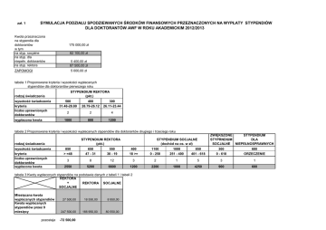 zał. 1 SYMULACJA PODZIAŁU SPODZIEWANYCH ŚRODKÓW FINANSOWYCH PRZEZNACZONYCH NA WYPŁATY STYPENDIÓW DLA DOKTORANTÓW AWF W ROKU AKADEMICKIM 2012/2013 Kwota przeznaczona na stypendia dla doktorantów w tym na styp. socjalne na styp. dla niepełn. doktorantów na styp. rektora 175 000,00 zł 82 100,00 zł 5 400,00 zł 87 500,00 zł ZAPOMOGI 5 000,00 zł tabela 1 Proponowane kryteria i wysokości wypłacanych stypendiów dla doktorantów pierwszego roku STYPENDIUM REKTORA (pkt.) rodzaj świadczenia wysokość świadczenia kryteria liczba uprawnionych doktorantów wypłacona kwota 500 31.48-28.80 400 28.79-26.12 300 26.11-23.44 2 2 4 1000 800 1200 tabela 2 Proponowane kryteria i wysokości wypłacanych stypendiów dla doktorantów drugiego i trzeciego roku STYPENDIUM REKTORA (pkt.) rodzaj świadczenia wysokość świadczenia kryteria liczba uprawnionych doktorantów wypłacona kwota STYPENDIUM SOCJALNE (dochód na os. w zł) 850 > =48 650 47 - 31 550 30 - 19 400 18 >= 1100 0 - 250 1000 251 - 400 850 401 - 618 300 0 - 618 600 ORZECZENIE 3 8 12 3 2 1 5 3 1 2550 5200 6600 1200 2200 1000 4250 900 600 tabela 3 Kwoty wypłaconych stypendiów na podstawie danych z tabeli 1 i tabeli 2 REKTORA + REKTORA SOCJALNE SOCJALNE Miesięczna kwota wypłacanych stypendiów Kwota wypłacanych stypendiów przez 9 miesięcy pozostaje ZWIĘKSZONE STYPENDIUM STYPRNDIUM DLA SOCJALNE NIEPEŁNOSPRAWNYCH 27 500,00 18 550,00 8 950,00 247 500,00 166 950,00 80 550,00 -72 500,00