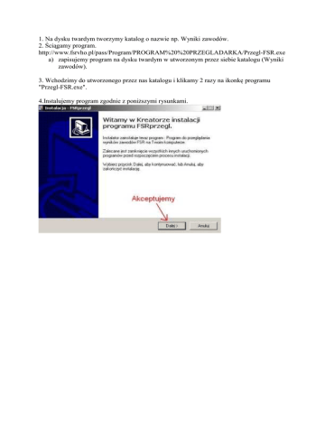 1. Na dysku twardym tworzymy katalog o nazwie np. Wyniki zawodów. 2. Ściągamy program. http://www.fsrvho.pl/pass/Program/PROGRAM%20%20PRZEGLADARKA/Przegl-FSR.exe a) zapisujemy program na dysku twardym w utworzonym przez siebie katalogu (Wyniki zawodów). 3. Wchodzimy do utworzonego przez nas katalogu i klikamy 2 razy na ikonkę programu "Przegl-FSR.exe". 4.Instalujemy program zgodnie z poniższymi rysunkami. 5.Po instalacji Programu należy ściągnąć i rozpakować pliki z wynikami z zawodów. a) Pliki z wynikami z zawodów można będzie sciągnąć ze strony w zakładce „terminarz z zawodów” po każdych z zawodów. b) Pliki z archiwalnymi wynikami do ściągnięcia poniżej. Borne Sulinowo 2011: http://www.fsrvho.pl/pass/Program/ZBIORY_SPAKOWANE/DANE%20DO%20PRZEGLADARKI/Borne%202011.exe Lińsk 2011: http://www.fsrvho.pl/pass/Program/ZBIORY_SPAKOWANE/DANE%20DO%20PRZEGLADARKI/Linsk%202011.exe Tychy 2011: http://www.fsrvho.pl/pass/Program/ZBIORY_SPAKOWANE/DANE%20DO%20PRZEGLADARKI/Tychy%202011.exe Po kliknięciu na pliki powyżej pojawi się okno w którym klikamy "zapisz". Teraz należy wybrać katalog w którym zapiszemy nasze dane. Powinien to być katalog: C:/program files/FSRprzegl/dane/ Po ściągnięciu pliku należy wejść do katalogu dane ( C:/program files/FSRprzegl/dane/) i rozpakować ściągnięty plik. Utworzy nam się nowy katalog z nazwą zawodów. 6. Otwieramy program klikając na ikonkę na pulpicie. 7.Po uruchomieniu programu :„Zawodyfsrprzegl.exe” wyświetla się ekran (rys). Klikając na ikonę wgrywamy wyniki z interesujących nas biegów oraz klas. Klikając w rozszerzenie „plik typu” mamy do wyboru otwarcie wyników z klas V (rozszerzenie *.daV) lub O (rozszerzenie *.daO). Klikając 2 razy np. na plik „V_7_5_Senior_TYCHY_2011.daV” otwieramy wyniki z grupy v 7,5 sen. Po wgraniu wyników możemy przystąpić do przeglądania wyników z poszczególnych grup oraz wyniki poszczególnych zawodników. W celu wyświetlenia wyników biegu należy wybrać Grupę lub Grupę finałową i nacisnąć zakładkę „Bieg (1,2,3,4) zamknięty” lub „Bieg FINAŁOWY wykonany” W celu wyświetlenia wyników poszczególnych zawodników w poszczególnych biegach należy klikając na danego zawodnika (podświetlenie na zielono) przejść do wyników klikając ikonkę. Pojawia się okno zawodnika. Aby wyświetlić szczegółowe wyniki należy kliknąć ikonkę Aby wyświetlić szczegółowe zawodnika z biegów eliminacyjnych należy kliknąć jedną z ikon (Uwaga. W przypadku gdy przeglądamy wyniki zawodnika z finału pojawi się jedynie ikona z numerem 1) Wyjście z szczegółowych wyników zawodnika następuję po kliknięciu na czerwony krzyżk.