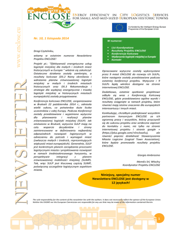 www.enclose.eu Nr. 10, 1 listopada 2014 Drogi Czytelniku, witamy w ostatnim numerze Newslettera Projektu ENCLOSE! Projekt pt.: "Efektywność energetyczna usług logistyki miejskiej dla małych i średnich miast historycznych w Europie " właśnie się zakończył. Ostateczne działania zostały zamknięte, a rezultaty końcowe (D5.2 Ramy określania i wdrażania planów zrównoważonej logistyki miejskiej w małych i średnich miastach historycznych oraz D5.3 Rekomendacje i strategie dla wydajnej energetycznie i trwałej logistyki miejskiej w historycznych miastach europejskich) zostały przygotowane. Konferencja końcowa ENCLOSE, zorganizowana w Brukseli 22 października 2014 r., odniosła wielki sukces, co potwierdza duża liczba uczestników z całej Europy. Podczas Konferencji zostały przedstawione i wyjaśnione wytyczne dla planowania i realizacji planów zrównoważonej logistyki miejskiej (SULP). Jak omówiono w Brukseli, wytyczne SULP mają na celu wsparcie decydentów i strony zainteresowane w definiowaniu najbardziej odpowiednich rozwiązań logistycznych w odniesieniu do potrzeb i wymagań miast (zwłaszcza małych i średnich, reprezentujących większość miast europejskich). Generalnie, SULP jest konkretnym planem zarządzania procesami logistycznymi miasta i projektowania rozwiązań w ramach średniookresowego horyzontu, w perspektywie integracji z planem zrównoważonej mobilności miejskiej (SUMP). Tak, więc SULP jest kluczową częścią SUMP, poświęconą szczególnie logistycznym aspektom miasta. W numerze: List Koordynatora Rezultaty Projektu ENCLOSE Konferencja Końcowa Wydarzenia logistyki miejskiej w Europie Kontakt Opracowane wytyczne zostały wykorzystane przez 9 miast ENCLOSE do rozwoju ich SULPs, które następnie zostały przedstawione podczas ostatniej konferencji projektu. Wytyczne i 9 SULPs będą wkrótce dostępne na stronie internetowej ENCLOSE. Dodatkowo, ostatnie spotkanie projektowe odbyło się wraz z Konferencją Końcową ENCLOSE, gdzie przedstawiono ogólne wyniki i rezultaty osiągnięte w ramach projektu, które również mają istotne znaczenie dla europejskich interesariuszy i innych miast. Konkludując, chciałbym podziękować wszystkim partnerom konsorcjum ENCLOSE za ich ogromną pracę i wszystkim, którzy przyczynili się do sukcesu projektu oraz serdeczne zaprosić do kontaktu z nami, nie tylko na stronie internetowej projektu i stronie google + (https://plus.google.com/+EncloseEu), ale również poprzez działalność Stowarzyszenia Miasta Logiczne (Logical Town Association), które będzie promowało rezultaty projektu ENCLOSE. Giorgio Ambrosino MemEx Srl, Włochy Koordynator Projektu ENCLOSE Niniejszy, specjalny numer Newslettera ENCLOSE jest dostępny w 12 językach! The sole responsibility for the content of this newsletter lies with the authors. It does not necessarily reflect the opinion of the European Union. Neither the EASME nor the European Commission are responsible for any use that may be made of the information contained therein. 1 www.enclose.eu Rezultaty Projektu ENCLOSE SIECI NAJLEPSZYCH PRAKTYK Doświadczenia pilotażowe ENCLOSE zostały połączone w sieć, aby zachęcić zainteresowane strony i europejskie miasta do udziału w strategii komunikacji oraz stworzenia bazy danych z ponad 750 kontaktów i 200 miast europejskich (w tym około 120 interesariuszy/miast spoza państw partnerskich). Promocja i współpraca małych i średnich historycznych miast europejskich (nawet, jeśli nie były bezpośrednio zaangażowane w projekt ENCLOSE) w kwestii zrównoważonej i energooszczędnej logistyki jest kluczowa. W ramach działań promocyjnych, partnerzy ENCLOSE zorganizowali techniczne wizyty studyjne (dla partnerów i nie tylko) oraz szereg udanych konferencji i warsztatów na temat europejskiej logistyki miejskiej i zrównoważonego planowania transportu (Lucca (IT), Norwich (GB), Växjö (SE), Bruksela(BE), itd.). Spotkania miały na celu ułatwienie wymiany doświadczeń, promowanie wdrożenia SULPs i badanie zagadnień polityk, aby określić strategie zapewnienia długoterminowej stabilności w ramach SULPs. Ponadto przeprowadzono odpowiednie działania komunikacyjne i upowszechniające: udział na targach i wystawach, imprezach międzynarodowych (Intertraffic, TRA, eComm; Forum Transportu VTI, Energy Cities, itp.), publikacja i dystrybucja specjalnego materiału komunikacyjnego i kwartalnych biuletynów ENCLOSE , które były dystrybuowane do ponad 1000 kontaktów w Europie (miasta, zainteresowane strony, operatorzy logistyczni, organizacje badawcze, eksperci branżowi). Oficjalna strona ENCLOSE, www.enclose.eu, jest dostępna i regularnie aktualizowana w 12 różnych językach. PODNOSZENIE ŚWIADOMOŚCI Celem ENCLOSE było podniesienie świadomości na temat wyzwań energooszczędnej i zrównoważonej logistyki miejskiej w małych i średnich historycznych miastach europejskich, a także informowanie, jak osiągnąć znaczące ulepszenia i korzyści poprzez wdrażanie i funkcjonowanie odpowiednich i skutecznych środków, systemów i rozwiązań ramowych skierowanych do konkretnego środowiska miejskiego. Partnerzy ENCLOSE podczas trwania projektu, zorganizowali 12 ważnych lokalnych wydarzeń promujących (ARE), których celem było zachęcenie do korzystania 2 www.enclose.eu z energooszczędnych rozwiązań logistyki miejskiej oraz wspieranie inicjatyw, związanych ze zrównoważoną logistyką miejską i mobilnością w miastach Hiszpanii (Burgos), Portugalii (Almada), Wielkiej Brytanii (Dundee), Rumunii (Alba Iulia), Bułgarii (Bałczik) i Grecji (Serres). WSPIERANIE MAŁYCH I ŚREDNICH EUROPEJSKICH MIAST HISTORYCZNYCH Projekt ENCLOSE bezpośrednio wspiera rozwój planów zrównoważonej logistyki miejskiej (SULPs) w 9 małych i średnich historycznych miastach europejskich z udziałem partnerów z 13 krajów europejskich - Austrii, Bułgarii, Grecji, Irlandii, Włoch, Norwegii, Polski, Rumunii, Portugali