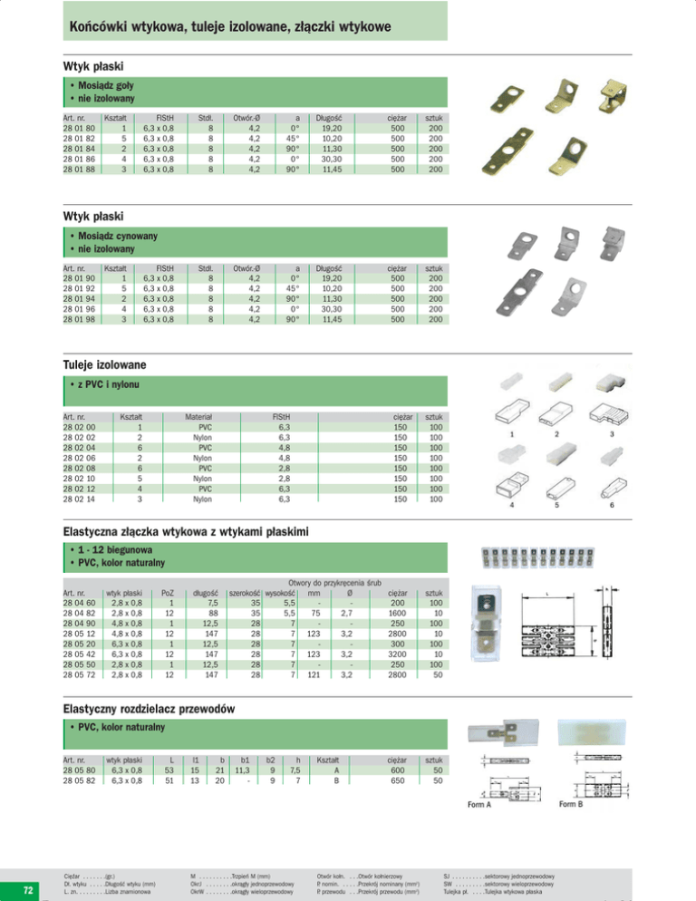 Końcówki wtykowa, tuleje izolowane, złączki wtykowe Wtyk płaski • Mosiądz goły • nie izolowany Art. nr. 28 01 80 28 01 82 28 01 84 28 01 86 28 01 88 Kształt 1 5 2 4 3 FlStH 6,3 x 0,8 6,3 x 0,8 6,3 x 0,8 6,3 x 0,8 6,3 x 0,8 Stdł. 8 8 8 8 8 Otwór.-Ø 4,2 4,2 4,2 4,2 4,2 a 0° 45° 90° 0° 90° Długość 19,20 10,20 11,30 30,30 11,45 ciężar 500 500 500 500 500 sztuk 200 200 200 200 200 Stdł. 8 8 8 8 8 Otwór.-Ø 4,2 4,2 4,2 4,2 4,2 a 0° 45° 90° 0° 90° Długość 19,20 10,20 11,30 30,30 11,45 ciężar 500 500 500 500 500 sztuk 200 200 200 200 200 Wtyk płaski • Mosiądz cynowany • nie izolowany Art. nr. 28 01 90 28 01 92 28 01 94 28 01 96 28 01 98 Kształt 1 5 2 4 3 FlStH 6,3 x 0,8 6,3 x 0,8 6,3 x 0,8 6,3 x 0,8 6,3 x 0,8 Tuleje izolowane • z PVC i nylonu Art. nr. 28 02 00 28 02 02 28 02 04 28 02 06 28 02 08 28 02 10 28 02 12 28 02 14 Kształt 1 2 6 2 6 5 4 3 Materiał PVC Nylon PVC Nylon PVC Nylon PVC Nylon FlStH 6,3 6,3 4,8 4,8 2,8 2,8 6,3 6,3 ciężar 150 150 150 150 150 150 150 150 sztuk 100 100 100 100 100 100 100 100 Elastyczna złączka wtykowa z wtykami płaskimi • 1 - 12 biegunowa • PVC, kolor naturalny Art. nr. 28 04 60 28 04 82 28 04 90 28 05 12 28 05 20 28 05 42 28 05 50 28 05 72 wtyk płaski 2,8 x 0,8 2,8 x 0,8 4,8 x 0,8 4,8 x 0,8 6,3 x 0,8 6,3 x 0,8 2,8 x 0,8 2,8 x 0,8 PoZ 1 12 1 12 1 12 1 12 długość 7,5 88 12,5 147 12,5 147 12,5 147 Otwory do przykręcenia śrub szerokość wysokość mm Ø 35 5,5 35 5,5 75 2,7 28 7 28 7 123 3,2 28 7 28 7 123 3,2 28 7 28 7 121 3,2 ciężar 200 1600 250 2800 300 3200 250 2800 sztuk 100 10 100 10 100 10 100 50 ciężar 600 650 sztuk 50 50 Elastyczny rozdzielacz przewodów • PVC, kolor naturalny Art. nr. 28 05 80 28 05 82 72 wtyk płaski 6,3 x 0,8 6,3 x 0,8 Cięźar . . . . . . .(gr.) Dł. wtyku . . . . .Długość wtyku (mm) L. zn. . . . . . . . .Lizba znamionowa L 53 51 l1 15 13 b 21 20 b1 11,3 - b2 9 9 h 7,5 7 M . . . . . . . . . .Trzpień M (mm) OkrJ . . . . . . . .okrągły jednoprzewodowy OkrW . . . . . . . .okrągły wieloprzewodowy Kształt A B Otwór kołn. . . .Otwór kołnierzowy P. nomin. . . . . .Przekrój nominany (mm2) P. przewodu . . .Przekrój przewodu (mm2) SJ . . . . . . . . . .sektorowy jednoprzewodowy SW . . . . . . . . .sektorowy wieloprzewodowy Tulejka pł. . . . .Tulejka wtykowa płaska
