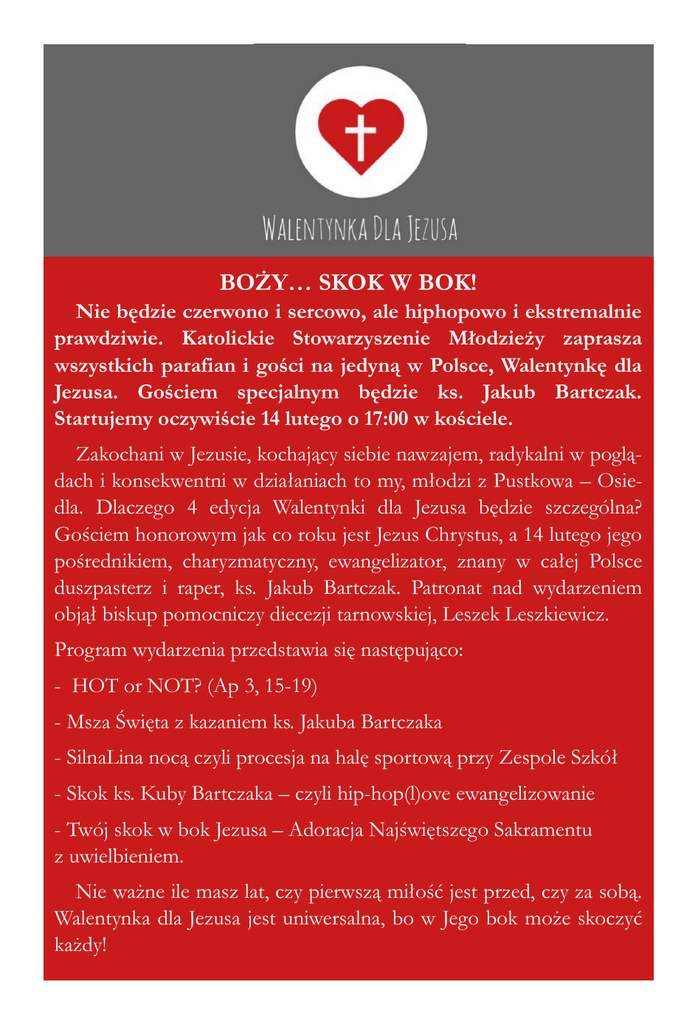 BOŻY… SKOK W BOK! Nie będzie czerwono i sercowo, ale hiphopowo i ekstremalnie prawdziwie. Katolickie Stowarzyszenie Młodzieży zaprasza wszystkich parafian i gości na jedyną w Polsce, Walentynkę dla Jezusa. Gościem specjalnym będzie ks. Jakub Bartczak. Startujemy oczywiście 14 lutego o 17:00 w kościele. Zakochani w Jezusie, kochający siebie nawzajem, radykalni w poglądach i konsekwentni w działaniach to my, młodzi z Pustkowa – Osiedla. Dlaczego 4 edycja Walentynki dla Jezusa będzie szczególna? Gościem honorowym jak co roku jest Jezus Chrystus, a 14 lutego jego pośrednikiem, charyzmatyczny, ewangelizator, znany w całej Polsce duszpasterz i raper, ks. Jakub Bartczak. Patronat nad wydarzeniem objął biskup pomocniczy diecezji tarnowskiej, Leszek Leszkiewicz. Program wydarzenia przedstawia się następująco: - HOT or NOT? (Ap 3, 15-19) - Msza Święta z kazaniem ks. Jakuba Bartczaka - SilnaLina nocą czyli procesja na halę sportową przy Zespole Szkół - Skok ks. Kuby Bartczaka – czyli hip-hop(l)ove ewangelizowanie - Twój skok w bok Jezusa – Adoracja Najświętszego Sakramentu z uwielbieniem. Nie ważne ile masz lat, czy pierwszą miłość jest przed, czy za sobą. Walentynka dla Jezusa jest uniwersalna, bo w Jego bok może skoczyć każdy!