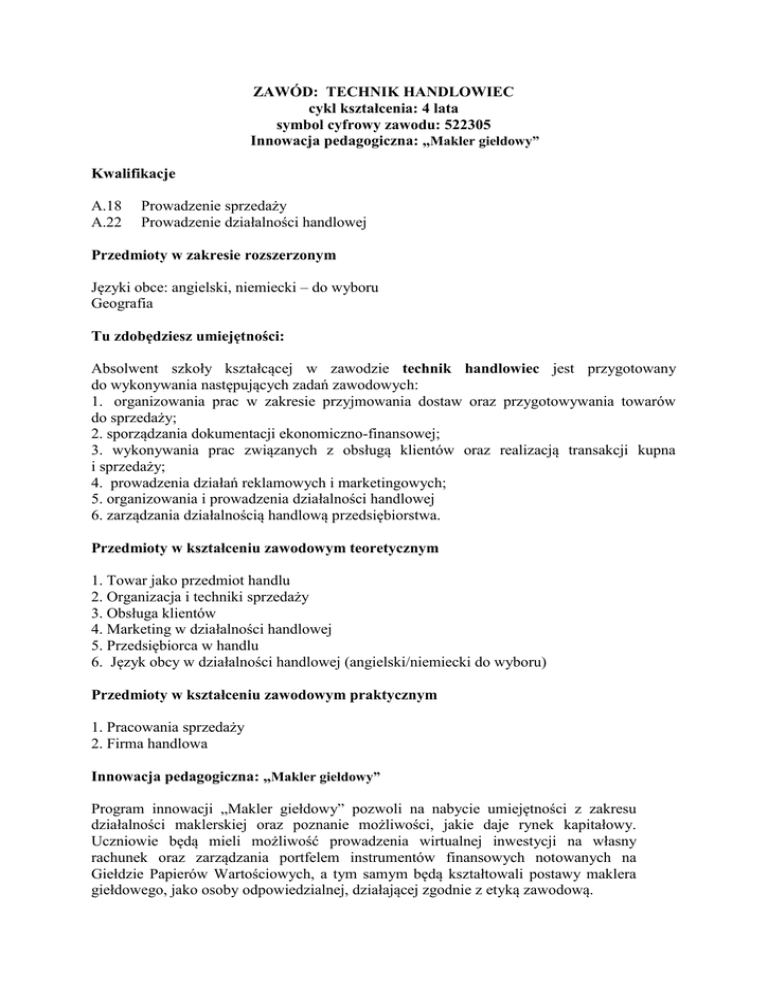 ZAWÓD: TECHNIK HANDLOWIEC cykl kształcenia: 4 lata symbol cyfrowy zawodu: 522305 Innowacja pedagogiczna: „Makler giełdowy” Kwalifikacje A.18 A.22 Prowadzenie sprzedaży Prowadzenie działalności handlowej Przedmioty w zakresie rozszerzonym Języki obce: angielski, niemiecki – do wyboru Geografia Tu zdobędziesz umiejętności: Absolwent szkoły kształcącej w zawodzie technik handlowiec jest przygotowany do wykonywania następujących zadań zawodowych: 1. organizowania prac w zakresie przyjmowania dostaw oraz przygotowywania towarów do sprzedaży; 2. sporządzania dokumentacji ekonomiczno-finansowej; 3. wykonywania prac związanych z obsługą klientów oraz realizacją transakcji kupna i sprzedaży; 4. prowadzenia działań reklamowych i marketingowych; 5. organizowania i prowadzenia działalności handlowej 6. zarządzania działalnością handlową przedsiębiorstwa. Przedmioty w kształceniu zawodowym teoretycznym 1. Towar jako przedmiot handlu 2. Organizacja i techniki sprzedaży 3. Obsługa klientów 4. Marketing w działalności handlowej 5. Przedsiębiorca w handlu 6. Język obcy w działalności handlowej (angielski/niemiecki do wyboru) Przedmioty w kształceniu zawodowym praktycznym 1. Pracowania sprzedaży 2. Firma handlowa Innowacja pedagogiczna: „Makler giełdowy” Program innowacji „Makler giełdowy” pozwoli na nabycie umiejętności z zakresu działalności maklerskiej oraz poznanie możliwości, jakie daje rynek kapitałowy. Uczniowie będą mieli możliwość prowadzenia wirtualnej inwestycji na własny rachunek oraz zarządzania portfelem instrumentów finansowych notowanych na Giełdzie Papierów Wartościowych, a tym samym będą kształtowali postawy maklera giełdowego, jako osoby odpowiedzialnej, działającej zgodnie z etyką zawodową. Zajęcia odbywać się będą w formie warsztatów w pracowni komputerowej, z wykorzystaniem dostępu do notowań giełdowych za pomocą Szkolnej Internetowej Gry Giełdowej. Planowane są wyjazdy na Warszawską Giełdę Papierów Wartościowych, do domów maklerskich, banków. Osoby znające rynek kapitałowy znajdują zatrudnienie nie tylko w domach maklerskich, ale także w funduszach inwestycyjnych, bankach, towarzystwach ubezpieczeniowych czy w firmach doradczych. Miejsca odbywania praktyk 1. Szkoła organizuje praktyki zawodowe w podmiotach zapewniających rzeczywiste warunki pracy właściwe dla nauczanego zawodu w wymiarze 4 tygodni (160 godzin). 2. Jakość świadczonych usług, profesjonalizm oraz możliwości realizowania się uczniów są priorytetem w wyborze podmiotów do odbywania praktyk zawodowych. 3. Uczniowie decydują, w którym z dostępnych podmiotów chcą odbywać praktyki. Perspektywy zatrudnienia Technik handlowiec – to odpowiedź na potrzeby rynku pracy, posiadacz dyplomu potwierdzającego kwalifikacje w zawodzie znajdzie pracę w kraju i zagranicą jako: 1. Merchandiser 2. Referent/asystent ds. zaopatrzenia 3. Referent/asystent ds. sprzedaży 4. Referent/asystent ds. obsługi klienta 5. Kupiec 6. Przedstawiciel handlowy 7. Kierownik działu handlowego 8. Zastępca kierownika działu handlowego 9. Specjalista ds. obsługi klienta 10. Specjalista ds. sprzedaży 11. Specjalista ds. zaopatrzenia Miejsca pracy 1. Własna działalność gospodarcza 2. Dział marketingowy firmy handlowej 3. Dział obsługi klienta firmy handlowej, produkcyjnej, usługowej Posiadacz dyplomu potwierdzającego kwalifikacje zawodowe w zawodzie technik handlowiec wykonuje swoje zadania zawodowe na różnych stanowiskach pracy np.: Merchandiserzy - dbają o właściwą ekspozycję i promocję towarów, zatrudniani są zwłaszcza w dużych placówkach detalicznych. Referenci/asystenci handlowi ds. zaopatrzenia organizują, w przedsiębiorstwach handlowych lub produkcyjno-usługowych zaopatrzenie w potrzebne towary, materiały lub surowce do produkcji. Referenci/asystenci ds. sprzedaży organizują sprzedaż towarów i usług w firmach handlowych lub sprzedaż wyrobów gotowych w przedsiębiorstwach produkcyjnych. Pracownicy o dłuższym stażu pracy i wyższych kompetencjach awansują na stanowiska kupców, specjalistów ds. zaopatrzenia lub sprzedaży. Pracując w dziale obsługi klienta, handlowcy koncentrują się na działaniach marketingowych firmy związanych ze sprzedażą. Handlowcy, posiadający odpowiednio wysokie kompetencje zawodowe oraz doświadczenie, zajmują stanowiska kierownicze organizując prace podległych im pracowników. W pracy przedstawiciela handlowego przydatne są umiejętności menedżerskie:, znajomość podstaw psychologii i socjologii (wyczucie intencji drugiego człowieka), matematyki (wystawianie rachunków za towar, usługę), prawa i ekonomii. Niezbędne są również takie cechy jak: uprzejmość, takt, umiejętność słuchania i panowania nad sobą, inteligencja emocjonalna, łatwość wypowiadania się na piśmie, dobra znajomość terminologii urzędowej Co po technikum? Po ukończeniu technikum uczeń może przystąpić do egzaminu maturalnego a następnie kontynuować naukę na studiach wyższych. Absolwent będzie mógł również uzupełnić swoje kwalifikacje w szkołach policealnych lub na kwalifikacyjnych kursach zawodowych. Procedura zdobywania uprawnień zawodowych W trakcie nauki w technikum uczeń zdaje egzaminy w poszczególnych kwalifikacjach. Pierwszy egzamin przeprowadzony jest pod koniec III klasy, zaś drugi w styczniu-lutym klasy IV. Po każdej zdanej kwalifikacji uczeń otrzymuje świadectwo o zdanym egzaminie. Gdy uczeń zda wszystkie egzaminy otrzyma dyplom potwierdzający kwalifikacje w zawodzie technik handlowiec. Posiadany dyplom pomoże w poszukiwaniach zatrudnienia i świadczy o umiejętnościach ucznia. Uczeń który uzyska dyplom technika handlowca, aby zdobyć drugi zawód np. technika księgarstwa będzie mógł na kwalifikacyjnym kursie zawodowym potwierdzić dodatkową kwalifikację A.21 „Prowadzenie działalności informacyjno-bibliografi