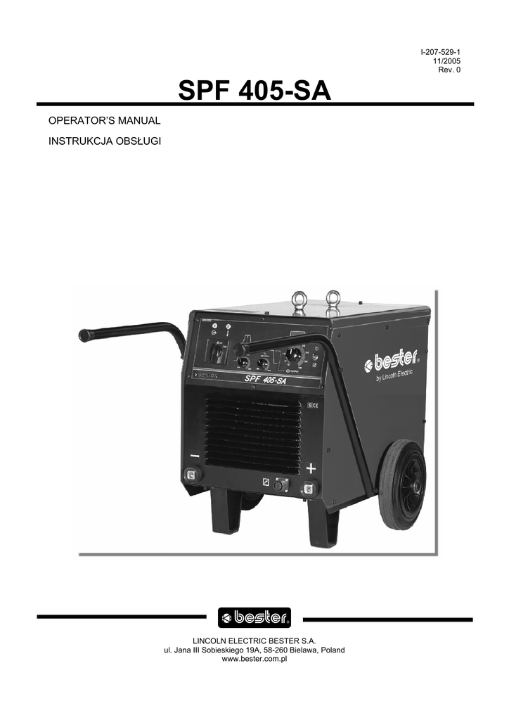 I-207-529-1 11/2005 Rev. 0 SPF 405-SA OPERATOR’S MANUAL INSTRUKCJA OBSŁUGI LINCOLN ELECTRIC BESTER S.A. ul. Jana III Sobieskiego 19A, 58-260 Bielawa, Poland www.bester.com.pl Declaration of conformity Deklaracja zgodności BESTER S.A. Declares that the welding machine: Deklaruje, że spawalnicze źródło energii: SPF 405-SA conforms to the following directives: spełnia następujące wytyczne: 73/23/CEE, 89/336/CEE and has been designed in compliance with the following standards: i że zostało zaprojektowane zgodnie z wymaganiami następujących norm: EN 60974-1, EN 60974-10 Tomasz Domagalski Operations Director LINCOLN ELECTRIC BESTER S.A., ul. Jana III Sobieskiego 19A, 58-260 Bielawa, Poland 11/04 II 02/05 THANKS! For having choosen the QUALITY of the Lincoln Electric products. • • Please Examine Package and Equipment for Damage. Claims for material damaged in shipment must be notified immediately to the dealer. For future reference record in the table below your equipment identification information. Model Name, Code & Serial Number can be found on the machine rating plate. DZIĘKUJEMY! Za docenienie JASKOŚCI produktów Lincoln Electric. • • Proszę sprawdzić czy opakownie i sprzęt nie są uszkodzone. Reklamacje uszkodzeń powstałych podczas transportu muszą być natychmiast zgłoszone do dostawcy (dystrybutora). Dla ułatwienia prosimy o zapisanie na tej stronie danych identyfikacyjnych wyrobów. Nazwa modelu, Kod i Numer Seryjny, które możecie Państwo znaleźć na tabliczce znamionowej wyrobu. Model Name, Nazwa modelu: ………………...…………………………….………………………………………………………………………………………….. Code & Serial number, Kod i numer Seryjny: ………………….……………………………………………….. …………………………………………………….…………….. Date & Where Purchased, Data i Miejsce zakupu: …………………………………………………………………... ……………………….………………………………………….. III ENGLISH INDEX Safety ...........................................................................................................................................................................A-1 Installation and Operator Instructions........................................................................................................................... A-2 Electromagnetic Compatibility (EMC) ........................................................................................................................... A-4 Technical Specifications ...............................................................................................................................................A-4 SKOROWIDZ POLSKI Bezpieczeństwo Użytkowania ......................................................................................................................................C-1 Instrukcja Instalacji i Eksploatacji .................................................................................................................................C-2 Kompatybilność Elektromagnetyczna (EMC) ...............................................................................................................C-4 Dane Techniczne .........................................................................................................................................................C-5 Spare Parts, Wykaz Części Zamiennych ........................................................................................................................ 1 Electrical Schematic, Schemat Elektryczny..................................................................................................................... 3 Accessories, Akcesoria ................................................................................................................................................... 4 IV Safety 11/04 WARNING This equipment must be used by qualified personnel. Be sure that all installation, operation, maintenance and repair procedures are performed only by qualified person. Read and understand this manual before operating this equipment. Failure to follow the instructions in this manual could cause serious personal injury, loss of life, or damage to this equipment. Read and understand the following explanations of the warning symbols. Lincoln Electric is not responsible for damages caused by improper installation, improper care or abnormal operation. WARNING: This symbol indicates that instructions must be followed to avoid serious personal injury, loss of life, or damage to this equipment. Protect yourself and others from possible serious injury or death. READ AND UNDERSTAND INSTRUCTIONS: Read and understand this manual before operating this equipment. Arc welding can be hazardous. Failure to follow the instructions in this manual could cause serious personal injury, loss of life, or damage to this equipment. ELECTRIC SHOCK CAN KILL: Welding equipment generates high voltages. Do not touch the electrode, work clamp, or connected work pieces when this equipment is on. Insulate yourself from the electrode, work clamp, and connected work pieces. ELECTRICALLY POWERED EQUIPMENT: Turn off input power using the disconnect switch at the fuse box before working on this equipment. Ground this equipment in accordance with local electrical regulations. ELECTRICALLY POWERED EQUIPMENT: Regularly inspect the input, electrode, and work clamp cables. If any insulation damage exists replace the cable immediately. Do not place the electrode holder directly on the welding table or any other surface in contact with the work clamp to avoid the risk of accidental arc ignition. ELECTRIC AND MAGNETIC FIELDS MAY BE DANGEROUS: Electric current flowing through any conductor creates electric and magnetic fields (EMF). EMF fields may interfere with some pacem