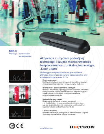 SSR-3 Aktywacja + monitorowane bezpieczeństwo Aktywacja z użyciem podwójnej technologii i czujnik monitorowanego bezpieczeństwa z unikalną technologią „Door Learn” Innowacyjny, energooszczędny czujnik umożliwia aktywację drzwi oraz niezrównane bezpieczeństwo przy wysokości montażu nawet 3,2 m Energooszczędny Możliwość inteligentnego wykrywania jednokierunkowego skraca czas otwarcia drzwi i straty energii w budynku Niezrównane bezpieczeństwo pieszych Unikalna możliwość zapamiętywania ruchu drzwi umożliwia umiejscowienie kurtyny bezpieczeństwa za poruszającymi się skrzydłami drzwiowymi, co daje niezrównane bezpieczeństwo pieszych Duża strefa wykrywania Regulowana strefa wykrywania o szerokości 4 m i głębokości 4 m zapewnia otwarcie drzwi na czas, czyniąc czujnik idealnym do stosowania na lotniskach, w supermarketach, centrach handlowych itp. Łatwość montażu Wszelkie informacje wymagane do zamontowania czujnika SSR-3 są wydrukowane na jego obudowie www.hotron.com SSR-3 Aktywacja + monitorowane bezpieczeństwo Specyfikacja techniczna Model Akcesoria UTB-HR100 Wspornik mocowany do sufitu SSR-3-COV/BL Czarna obudowa czujnika SSR-3-COV/S Srebrna obudowa czujnika WC/BL Czarna obudowa ochronna BF-1 Narzędzie instalacyjne do wyszukiwania punktowego C zujnik SSR-3 z podwójnym wyjściem przekaźnikowym — aktywacja drzwi dla osób pieszych + monitorowane bezpieczeństwo Metoda detekcji Wykrywanie ruchu za pomocą mikrofal, pasmo K 24,05 GHz + aktywne wykrywanie z użyciem podczerwieni Wysokość montażu od 2000 mm do 3200 mm (od 6,5 do 10,5 stopy) Rozmiary czujnika 265 mm (szer.), 60 mm (wys.), 43 mm (głęb.) Regulacja wzorca Regulacja szerokości: Regulacja czułości mikrofalowej (potencjometr) Regulacja głębokości: Aktywna dla podczerwieni 3 rzędy od +4° do - 8° (za pomocą śruby) Regulacja głębokości: Regulacja anteny mikrofalowej góra-dół od +15° do +51° w krokach co 3° Regulacja głębokości: Regulacja czułości mikrofalowej (potencjometr) Zegar detekcji obecności 2 s, 30 s, 1 min i nieskończoność (aktywne z użyciem podczerwieni, 3 rzędy) Stopień ochrony sprzętu IP 54 Zasilanie 12 do 24 V AC lub DC ± 10% Pobór mocy 12 V AC - 2,5 [VA] (maks.), 12 V DC - 150 [mA] (maks.) 24 V AC - 2.5 [VA] (maks.), 24 V DC - 80 [mA] (maks.) Czas zwarcia przekaźnika Aktywne wiązki podczerwieni: ok. 0,5 s Mikrofale: 0,5 lub 3 s (przełącznik typu DIP) Wskaźnik diodowy Włączony = Zielony Funkcja „uczenia się” wejścia = Zielony migający Aktywne wykrywanie z użyciem podczerwieni i mikrofal = Czerwony Detekcja z użyciem mikrofal = Niebieski Aktywne wykrywanie z użyciem podczerwieni i mikrofal = Czerwony Detekcja drzwi = Pomarańczowy Błąd wewnętrzny czujnika = Zielona/czerwona dioda migają naprzemiennie (szybko) Błąd niskiego poziomu odbicia fal = Zielona/czerwona dioda migają naprzemiennie (powoli) Zmiana ustawień przełącznika typu DIP = Pomarańczowy migający (szybko) Tryb ustawień = Pomarańczowy migający (wolno) Zakres temperatury roboczej od -20°C do +60°C (od -4°F do 140°F) Ciężar 254 g (0,56 funta) Dostępne kolory Czarny: Kod produktu = SSR-3/BL Srebrny: Kod produktu = SSR-3/S Akcesoria w komplecie Kabel łączący 2,5 m, szablon montażowy, śruby montażowe, instrukcja montażu Obszar detekcji (cale/mm) Hotron Ltd. 6 Dublin Street, Carlow, Irlandia. Tel.: +353 (0)59 914 0345 Faks: +353 (0)59 914 0543 E-mail: [email protected] 2 Strona internetowa: www.hotron.com