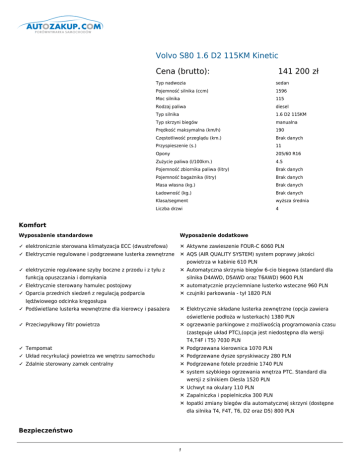 Volvo S80 1.6 D2 115KM Kinetic Cena (brutto): 141 200 zł Typ nadwozia sedan Pojemność silnika (ccm) 1596 Moc silnika 115 Rodzaj paliwa diesel Typ silnika 1.6 D2 115KM Typ skrzyni biegów manualna Prędkość maksymalna (km/h) 190 Częstotliwość przeglądu (km.) Brak danych Przyspieszenie (s.) 11 Opony 205/60 R16 Zużycie paliwa (l/100km.) 4.5 Pojemność zbiornika paliwa (litry) Brak danych Pojemność bagażnika (litry) Brak danych Masa własna (kg.) Brak danych Ładowność (kg.) Brak danych Klasa/segment wyższa średnia Liczba drzwi 4 Komfort Wyposażenie standardowe Wyposażenie dodatkowe ✓ elektronicznie sterowana klimatyzacja ECC (dwustrefowa) ✕ Aktywne zawieszenie FOUR-C 6060 PLN ✓ Elektrycznie regulowane i podgrzewane lusterka zewnętrzne ✕ AQS (AIR QUALITY SYSTEM) system poprawy jakości powietrza w kabinie 610 PLN ✓ elektrycznie regulowane szyby boczne z przodu i z tyłu z ✕ Automatyczna skrzynia biegów 6-cio biegowa (standard dla funkcją opuszczania i domykania silnika D4AWD, D5AWD oraz T6AWD) 9600 PLN ✓ Elektrycznie sterowany hamulec postojowy ✕ automatycznie przyciemniane lusterko wsteczne 960 PLN ✓ Oparcia przednich siedzeń z regulacją podparcia ✕ czujniki parkowania - tył 1820 PLN lędźwiowego odcinka kręgosłupa ✓ Podświetlane lusterka wewnętrzne dla kierowcy i pasażera ✕ Elektrycznie składane lusterka zewnętrzne (opcja zawiera oświetlenie podłoża w lusterkach) 1380 PLN ✓ Przeciwpyłkowy filtr powietrza ✕ ogrzewanie parkingowe z możliwością programowania czasu (zastępuje układ PTC),(opcja jest niedostępna dla wersji T4,T4F i T5) 7030 PLN ✓ Tempomat ✕ Podgrzewana kierownica 1070 PLN ✓ Układ recyrkulacji powietrza we wnętrzu samochodu ✕ Podgrzewane dysze spryskiwaczy 280 PLN ✓ Zdalnie sterowany zamek centralny ✕ Podgrzewane fotele przednie 1740 PLN ✕ system szybkiego ogrzewania wnętrza PTC. Standard dla wersji z silnikiem Diesla 1520 PLN ✕ Uchwyt na okulary 110 PLN ✕ Zapalniczka i popielniczka 300 PLN ✕ łopatki zmiany biegów dla automatycznej skrzyni (dostępne dla silnika T4, F4T, T6, D2 oraz D5) 800 PLN Bezpieczeństwo 1 Wyposażenie standardowe Wyposażenie dodatkowe ✓ 6 poduszek powietrznych: dla kierowcy i pasażera, dwie ✕ Laminowane szyby boczne - szyby boczne w drzwiach poduszki boczne, kurtyny powietrzne (IC) ✓ Boczne światła obrysowe przednich z powłoką hydrofobową (WRG) 2430 PLN ✕ PCC (Personal Security Communicator) z układem Keyless Drive 4240 PLN ✓ CITY SAFETY - układ wspomagania hamowania dla prędkości ✕ Skrętne reflektory biksenonowe ABL z wysokociśnieniowym poniżej 50 km/h ✓ Elektronicznie sterowany napęd na obie osie AWD (ALL układem oczyszczania lamp 6370 PLN ✕ System Collision Mitigation Support z funkcją pełnego WHEEL DRIVE) z układem Instant Traction dla D5 AWD i T6 automatycznego hamowania (Auto Brake) i ostrzegania o AWD ryzyku kolizji, układ PEDESTRIAN DEDECTION, układ ACC (Adaptive Cruise Control), utrzymujący odpowiednie odstęp czasowy od poprzedzającego samochod 9920 PLN ✓ SIPS (SIDE IMPACT PROTECTION SYSTEM) system ✕ System Drive Alert System informujący o potencjalnym zabezpieczeń przed skutkami uderzeń bocznych zmęczeniu kierowcy, wraz z układem LDW (Lane Departure Warning) ostrzegania o niezamierzonym zjechaniu z pasa jazdy. 4990 PLN ✓ Sygnalizacja niezapiętych pasów bezpieczeństwa dla ✕ Wyłącznik poduszki powietrznej pasażera PACOS 410 PLN wszystkich miejsc ✓ System mocowania fotelika ISOFIX dla zewnętrznych miejsc ✕ zaczepy fotelika dziecięcego pod schowkiem w desce tylnej kanapy pozdzielczej 0 PLN Dodatki Wyposażenie standardowe Wyposażenie dodatkowe ✓ 16" ODEN 225/55 R16 ✕ 17" PANDORA 225/50 R17 W 3640 PLN ✓ ABS (ANTI-LOCK BRAKE SYSTEM) z elektronicznym układem ✕ 17" REX 225/50 R17 W 3640 PLN rozdziału sił hamowania (EBD - Electronic Brake Distribution) ✓ Asymetrycznie dzielona kanapa tylna 60/40 ✕ 17" SADIA 225/50 R17 W 3640 PLN ✓ audio PERFORMANCE 5" kolorowy wyświetlacz LCD, ✕ 17" SAGA Black 225/50 R17 W 3640 PLN 4x20W 6 głośników (1 CD), złącze AUX ✓ Autoalarm Volvo Guard z czujnikiem przechyłu oraz ruchu ✕ 18" MAGNI 245/40 R18 Y 7560 PLN ✓ Automatycznie przyciemniane wewnętrzne lusterko ✕ 18" SLEIPNER Black Chrome 8380 PLN ✓ Barwione wsteczne szyby ✕ 18" YMIR (Light grey) 245/40 R18 Y 8930 PLN ✓ Chromowane wykończenia (z przodu, dolne listwy drzwi oraz ✕ 19" Inscription BOR Dark Grey Diamond Cut (dostępne tylne światła) ✓ DSTC (DYNAMIC STABILITY AND TRACTION CONTROL)- układ dla silnika D5 oraz T6) 12540 PLN ✕ 19" Inscription BOR Iron Stone Diamond Cut ( dostępne kontroli stabilności dynamicznej kontroli trakcji ✓ Dwie rury wydechowe (dla T6 AWD, D5, D5 AWD) dla silnika D5 oraz T6) 12540 PLN ✕ 3-ramienna kierownica wykończona skórą z elementami dekoracyjnymi 1790 PLN ✓ Dwie rury wydechowe dla T5 i D4 ✕ 8" Adaptacyjny wyświetlacz cyfrowy zegarów Active ✓ Dywaniki tekstylne ✕ Automatyczne poziomowanie nadwozia (Nivomat) 2730 PLN ✓ EBA (EMERGENCY BRAKE ASSISTANCE)- układ wspomagania ✕ automatycznie przyciemniane lusterko wsteczne z TFT 1930 PLN nagłego hamowania ✓ EBL (EMERGENCY BRAKE LIGHTS) - ostrzeganie innych kompasem 1320 PLN ✕ BLIS - układ monitorowania "martwych pól" lusterek użytkowników drogi o gwałtownym hamowaniu ✓ gniazdo 12V w tylnej części konsoli centralnej zewnętrznych 2730 PLN ✕ Brak oznaczenia modelu i wersji silnikowej 0 PLN ✓ 2 Kierownica skórzana ✕ 3 Chlapacze przednie 246 PLN 4 ✓ KIR ( KEY INTEGRATED REMOTE) klucz zintegrowany z ✕ Chlapacze tylne 246 PLN pilotem centralnego zamka ✓ Komputer pokładowy z komunikatami w języku polskim ✕ cyfrowy tuner TV (sygnał dostępny na wybranych obszarach Polski) 5020 PLN ✓ Oświetlenie asekuracyjne HOME SAFE ✕ Czujnik deszczu przedniej szyby 610 PLN ✓ Ozdobne osłony na progi ✕ czujnik wilgotności powietrza we wnętrzu 33