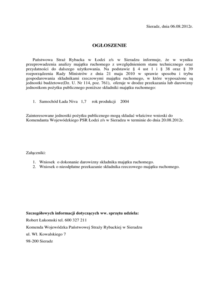Sieradz, dnia 06.08.2012r. OGŁOSZENIE Państwowa Straż Rybacka w Łodzi z/s w Sieradzu informuje, że w wyniku przeprowadzenia analizy majątku ruchomego z uwzględnieniem stanu technicznego oraz przydatności do dalszego użytkowania. Na podstawie § 4 ust 1 i § 38 oraz § 39 rozporządzenia Rady Ministrów z dnia 21 maja 2010 w sprawie sposobu i trybu gospodarowania składnikami rzeczowymi majątku ruchomego, w które wyposażone są jednostki budżetowe(Dz. U. Nr 114, poz. 761), oferuje w drodze przekazania lub darowizny jednostkom pożytku publicznego poniższe składniki majątku ruchomego: 1. Samochód Łada Niva 1,7 rok produkcji 2004 Zainteresowane jednostki pożytku publicznego mogą składać właściwe wnioski do Komendanta Wojewódzkiego PSR Łodzi z/s w Sieradzu w terminie do dnia 20.08.2012r. Załączniki: 1. Wniosek o dokonanie darowizny składnika majątku ruchomego. 2. Wniosek o nieodpłatne przekazanie składnika rzeczowego majątku ruchomego. Szczegółowych informacji dotyczących ww. sprzętu udziela: Robert Łukomski tel. 600 327 211 Komenda Wojewódzka Państwowej Straży Rybackiej w Sieradzu ul. Wł. Kowalskiego 7 98-200 Sieradz Załącznik 1 ………………………………. ( pieczątka jednostki) Komendant Wojewódzki Państwowej Straży Rybackiej w Łodzi z/s w Sieradzu WNIOSEK o dokonanie darowizny składnika majątku ruchomego (zgodnie z § 39 pkt 1 rozporządzenia Rady Ministrów z dnia 21 maja 2010 w sprawie sposobu i trybu gospodarowania składnikami rzeczowymi majątku ruchomego, w które wyposażone są jednostki budżetowe Dz. U. Nr 114, poz. 761) 1. Data zgłoszenia: …………………………………………………………………………… 2. Nazwa, siedziba i adres jednostki:…………………………………………………………. ……………………………………………………………………………………………… 3. Informacja o zadaniach publicznych realizowanych przez jednostkę: …………………….. ………………………………………………………………………………………………. ………………………………………………………………………………………………. ………………………………………………………………………………………………. 4. Wskazanie składnika majątku ruchomego, o który występuje jednostka …………………… ……………………………………………………………………………………………….. ……………………………………………………………………………………………….. 5. Uzasadnienie potrzeb i wskazanie sposobu wykorzystania składnika rzeczowego majątku ruchomego. ………………………………………………………………………………………………... ………………………………………………………………………………………………... ………………………………………………………………………………………………... a) odpis statutu 6. Zobowiązanie do pokrycia kosztów związanych z darowizną, w tym kosztów odbioru przedmiotu darowizny. ………………………………………………………………………………………………... ………………………………………………………………………………………………... ………………………………………………………………………………………………... 7. Oświadczenie, że darowany składnik majątku zostanie odebrany w terminie i w miejscu wskazanym w protokole zdawczo – odbiorczym. ………………………………………………………………………………………………... ………………………………………………………………………………………………... ………………………………………………………………………………………………... ………………………………… (podpis i pieczątka kierownika jednostki) Załącznik 2 ………………………………. ( pieczątka jednostki) Komendant Wojewódzki Państwowej Straży Rybackiej w Łodzi z/s w Sieradzu WNIOSEK o nieodpłatne przekazanie składnika rzeczowego majątku ruchomego (zgodnie z § 38 rozporządzenia Rady Ministrów z dnia 21 maja 2010 w sprawie sposobu i trybu gospodarowania składnikami rzeczowymi majątku ruchomego, w które wyposażone są jednostki budżetowe Dz. U. Nr 114, poz. 761) 1. Data zgłoszenia: …………………………………………………………………………… 2. Nazwa, siedziba i adres jednostki:…………………………………………………………. ……………………………………………………………………………………………… 3. Informacja o zadaniach publicznych realizowanych przez jednostkę: …………………….. ………………………………………………………………………………………………. ………………………………………………………………………………………………. ………………………………………………………………………………………………. 4. Wskazanie składnika majątku ruchomego, o który występuje jednostka …………………… ……………………………………………………………………………………………….. ……………………………………………………………………………………………….. 5. Uzasadnienie potrzeb i wskazanie sposobu wykorzystania składnika rzeczowego majątku ruchomego. ………………………………………………………………………………………………... ………………………………………………………………………………………………... ………