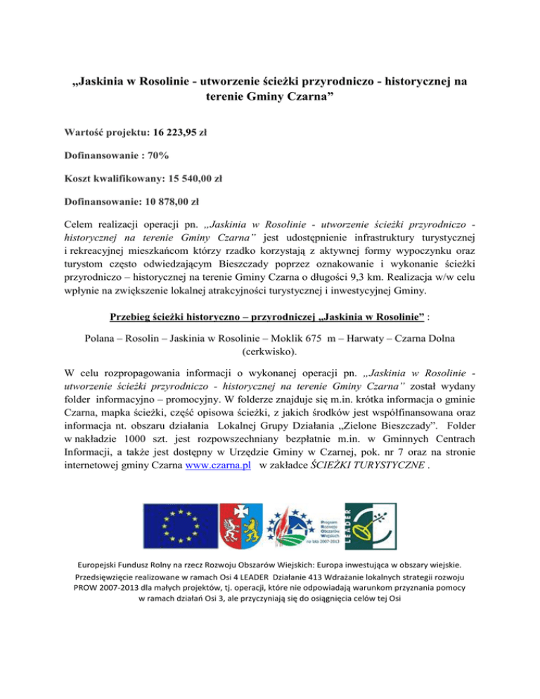 „Jaskinia w Rosolinie - utworzenie ścieżki przyrodniczo - historycznej na terenie Gminy Czarna” Wartość projektu: 16 223,95 zł Dofinansowanie : 70% Koszt kwalifikowany: 15 540,00 zł Dofinansowanie: 10 878,00 zł Celem realizacji operacji pn. „Jaskinia w Rosolinie - utworzenie ścieżki przyrodniczo historycznej na terenie Gminy Czarna” jest udostępnienie infrastruktury turystycznej i rekreacyjnej mieszkańcom którzy rzadko korzystają z aktywnej formy wypoczynku oraz turystom często odwiedzającym Bieszczady poprzez oznakowanie i wykonanie ścieżki przyrodniczo – historycznej na terenie Gminy Czarna o długości 9,3 km. Realizacja w/w celu wpłynie na zwiększenie lokalnej atrakcyjności turystycznej i inwestycyjnej Gminy. Przebieg ścieżki historyczno – przyrodniczej „Jaskinia w Rosolinie” : Polana – Rosolin – Jaskinia w Rosolinie – Moklik 675 m – Harwaty – Czarna Dolna (cerkwisko). W celu rozpropagowania informacji o wykonanej operacji pn. „Jaskinia w Rosolinie utworzenie ścieżki przyrodniczo - historycznej na terenie Gminy Czarna” został wydany folder informacyjno – promocyjny. W folderze znajduje się m.in. krótka informacja o gminie Czarna, mapka ścieżki, część opisowa ścieżki, z jakich środków jest współfinansowana oraz informacja nt. obszaru działania Lokalnej Grupy Działania „Zielone Bieszczady”. Folder w nakładzie 1000 szt. jest rozpowszechniany bezpłatnie m.in. w Gminnych Centrach Informacji, a także jest dostępny w Urzędzie Gminy w Czarnej, pok. nr 7 oraz na stronie internetowej gminy Czarna www.czarna.pl w zakładce ŚCIEŻKI TURYSTYCZNE . Europejski Fundusz Rolny na rzecz Rozwoju Obszarów Wiejskich: Europa inwestująca w obszary wiejskie. Przedsięwzięcie realizowane w ramach Osi 4 LEADER Działanie 413 Wdrażanie lokalnych strategii rozwoju PROW 2007-2013 dla małych projektów, tj. operacji, które nie odpowiadają warunkom przyznania pomocy w ramach działań Osi 3, ale przyczyniają się do osiągnięcia celów tej Osi