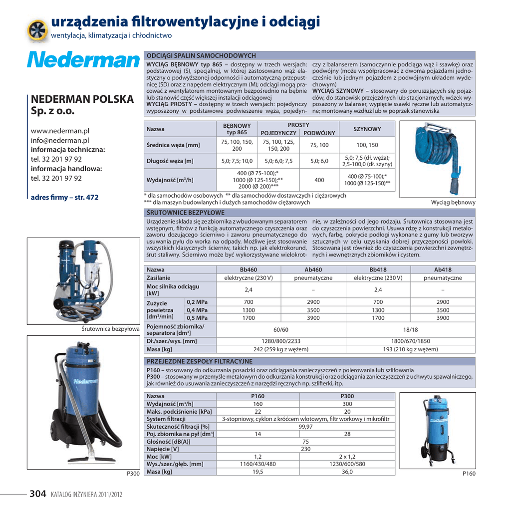 urządzenia filtrowentylacyjne i odciągi wentylacja, klimatyzacja i chłodnictwo ODCIĄGI SPALIN SAMOCHODOWYCH NEDERMAN POLSKA Sp. z o.o. Nazwa www.nederman.pl [email protected] informacja techniczna: tel. 32 201 97 92 informacja handlowa: tel. 32 201 97 92 czy z balanserem (samoczynnie podciąga wąż i ssawkę) oraz podwójny (może współpracować z dwoma pojazdami jednocześnie lub jednym pojazdem z podwójnym układem wydechowym) WYCIĄG SZYNOWY – stosowany do poruszających się pojazdów, do stanowisk przejezdnych lub stacjonarnych; wózek wyposażony w balanser, wypięcie ssawki ręczne lub automatyczne; montowany wzdłuż lub w poprzek stanowiska WYCIĄG BĘBNOWY typ 865 – dostępny w trzech wersjach: podstawowej (S), specjalnej, w której zastosowano wąż elastyczny o podwyższonej odporności i automatyczną przepustnicę (SD) oraz z napędem elektrycznym (M); odciągi mogą pracować z wentylatorem montowanym bezpośrednio na bębnie lub stanowić część większej instalacji odciągowej WYCIĄG PROSTY – dostępny w trzech wersjach: pojedynczy wyposażony w podstawowe podwieszenie węża, pojedyn- PROSTY POJEDYNCZY PODWÓJNY 75, 100, 125, 75, 100 150, 200 BĘBNOWY typ 865 Średnica węża [mm] 75, 100, 150, 200 Długość węża [m] 5,0; 7,5; 10,0 5,0; 6,0; 7,5 5,0; 6,0 SZYNOWY 100, 150 5,0; 7,5 (dł. węża); 2,5-100,0 (dł. szyny) 400 (Ø 75-100);* 400 (Ø 75-100);* 1000 (Ø 125-150);** 400 1000 (Ø 125-150)** 2000 (Ø 200)*** * dla samochodów osobowych ** dla samochodów dostawczych i ciężarowych *** dla maszyn budowlanych i dużych samochodów ciężarowych Wydajność [m3/h] adres firmy – str. 472 Wyciąg bębnowy ŚRUTOWNICE BEZPYŁOWE nie, w zależności od jego rodzaju. Śrutownica stosowana jest do czyszczenia powierzchni. Usuwa rdzę z konstrukcji metalowych, farbę, pokrycie podłogi wykonane z gumy lub tworzyw sztucznych w celu uzyskania dobrej przyczepności powłoki. Stosowana jest również do czyszczenia powierzchni zewnętrznych i wewnętrznych zbiorników i cystern. Urządzenie składa się ze zbiornika z wbudowanym separatorem wstępnym, filtrów z funkcją automatycznego czyszczenia oraz zaworu dozującego ścierniwo i zaworu pneumatycznego do usuwania pyłu do worka na odpady. Możliwe jest stosowanie wszystkich klasycznych ścierniw, takich np. jak elektrokorund, śrut staliwny. Ścierniwo może być wykorzystywane wielokrot- Śrutownica bezpyłowa Nazwa Zasilanie Moc silnika odciągu [kW] 0,2 MPa Zużycie powietrza 0,4 MPa 3 [dm /min] 0,5 MPa Pojemność zbiornika/ separatora [dm3] Dł./szer./wys. [mm] Masa [kg] Bb460 elektryczne (230 V) Ab460 pneumatyczne Bb418 elektryczne (230 V) Ab418 pneumatyczne 2,4 – 2,4 – 700 1300 1700 2900 3500 3900 700 1300 1700 2900 3500 3900 60/60 18/18 1280/800/2233 242 (259 kg z wężem) 1800/670/1850 193 (210 kg z wężem) PRZEJEZDNE ZESPOŁY FILTRACYJNE P160 – stosowany do odkurzania posadzki oraz odciągania zanieczyszczeń z polerowania lub szlifowania P300 – stosowany w przemyśle metalowym do odkurzania konstrukcji oraz odciągania zanieczyszczeń z uchwytu spawalniczego, jak również do usuwania zanieczyszczeń z narzędzi ręcznych np. szlifierki, itp. P300 304 KATALOG INŻYNIERA 2011/2012 Nazwa Wydajność [m3/h] Maks. podciśnienie [kPa] System filtracji Skuteczność filtracji [%] Poj. zbiornika na pył [dm3] Głośność [dB(A)] Napięcie [V] Moc [kW] Wys./szer./głęb. [mm] Masa [kg] P160 P300 160 300 22 20 3-stopniowy, cyklon z króćcem wlotowym, filtr workowy i mikrofiltr 99,97 14 28 75 230 1,2 2 x 1,2 1160/430/480 1230/600/580 19,5 36,0 P160 urządzenia filtrowentylacyjne i odciągi wentylacja, klimatyzacja i chłodnictwo STACJONARNE JEDNOSTKI FILTRACYJNE NISKIEGO PODCIŚNIENIA FILTERMAX System modułowy jednostek filtracyjnych przeznaczony do odciągania i filtracji dymów oraz pyłów suchych powstających podczas obróbki mechanicznej. Jednostki mogą być rozbudowywane o kolejne moduły filtracyjne. Urządzenia FilterMax mogą być elementem centralnej instalacji odciągowej. Występują również w wykonaniu dla pyłów o właściwościach wybuchowych. FILTERMAX C25 – kompaktowy filtr z zabudowanym wewnątrz wentylatorem; wyposażony w moduł sterujący pracą urządzenia oraz czyszczeniem wkładów filtracyjnych Nazwa Wkłady filtracyjne FILTERMAX F FILTERMAX DF F60 F90 DF40 DF80 DF120 1500-2750 3000-7000 4500-10 000 2200-4300 4300-8600 8600-13 000 99,0 (przy wielkości cząstek 0,5 μm) dwuwarstwowe celuloza/polipropylen – Basic PW, poliester – PolyWeb, poliester pokryty membraną teflonową (PP) PolyWeb PTFE, włókna poliestrowe pokryte aluminium (PP) PolyWeb Antystat 4 6 12 18 6 12 18 1 2 3 1 2 3 48 60 120 180 72 144 216 30 2 x 40, 2 x 100 50, 100 1,2 (2450, 2560)/ (3370, 3480, 3540)/ (4410, 4470, 4600)/ (2590, 2700)/ (3510, 3620, 3690)/ (4540, 4610, 4740)/ 2163/1527/912 1690/1160 1690/1160 1690/1160 1545/1112 1545/1112 1545/1112 Znak CE FILTERMAX C25 Wydajność [m3/h] Skuteczność filtracji [%] rodzaj ilość [szt.] Ilość modułów filtr. [szt] Powierzchnia filtracji [m2] Poj. zbiornika pyłów [dm3] Maks. podciśnienie [kPa] Wymiary (wys./szer./głęb.) [mm] Certyfikaty FILTERMAX F30, F60, F90 – filtr o dużej wydajności z wbudowanym separatorem wstępnym; stosowany do odciągania dymów i pyłów z procesów o dużej intensywności ich emisji; wyposażony w automatyczny moduł sterujący pracą filtra i czyszczeniem wkładów FILTERMAX DF40, 80, 120 – filtr o zwiększonej o 20% powierzchni filtracji, pozbawiony wewnętrznego preseparatora; przeznaczony do odciągania dymów i pyłów o stosunkowo mniejszych natężeniach emisji; wyposażony w automatyczny moduł sterujący pracą filtra i czyszczeniem wkładów F30 1500-3500 PRZEJEZDNY FILTR C10 Kompaktowy filtr wyposażony w ramię odciągowe, wymienny wkład filtracyjny (czyszczony sprężonym powietrzem) i panel kontrolny ze wskaźnikiem czasu pracy. O stopniu zabrudzenia filtra informuje ostrzegawczy s