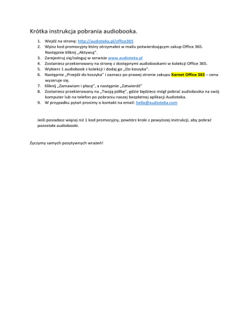 Krótka instrukcja pobrania audiobooka. 1. Wejdź na stronę: http://audioteka.pl/office365 2. Wpisz kod promocyjny który otrzymałeś w mailu potwierdzającym zakup Office 365. Następnie kliknij „Aktywuj”. 3. Zarejestruj się/zaloguj w serwisie www.audioteka.pl 4. Zostaniesz przekierowany na stronę z dostępnymi audiobookami w kolekcji Office 365. 5. Wybierz 1 audiobook z kolekcji i dodaj go „Do koszyka”. 6. Następnie „Przejdź do koszyka” i zaznacz po prawej stronie zakupu Karnet Office 365 – cena wyzeruje się. 7. Kliknij „Zamawiam i płacę”, a następnie „Zatwierdź” 8. Zostaniesz przekierowany na „Twoją półkę”, gdzie będziesz mógł pobrać audiobooka na swój komputer lub na telefon po pobraniu naszej bezpłatnej aplikacji Audioteka. 9. W przypadku pytań prosimy o kontakt na email: [email protected] Jeśli posiadasz więcej niż 1 kod promocyjny, powtórz kroki z powyższej instrukcji, aby pobrać pozostałe audiobooki. Życzymy samych pozytywnych wrażeń!