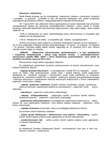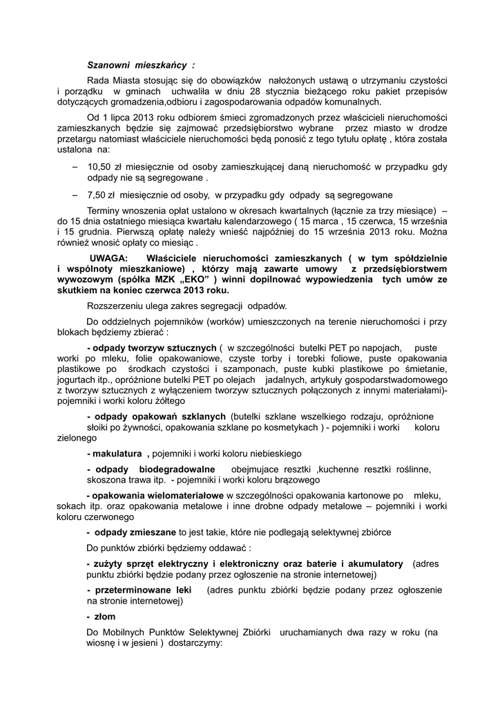 Szanowni mieszkańcy : Rada Miasta stosując się do obowiązków nałożonych ustawą o utrzymaniu czystości i porządku w gminach uchwaliła w dniu 28 stycznia bieżącego roku pakiet przepisów dotyczących gromadzenia,odbioru i zagospodarowania odpadów komunalnych. Od 1 lipca 2013 roku odbiorem śmieci zgromadzonych przez właścicieli nieruchomości zamieszkanych będzie się zajmować przedsiębiorstwo wybrane przez miasto w drodze przetargu natomiast właściciele nieruchomości będą ponosić z tego tytułu opłatę , która została ustalona na: – 10,50 zł miesięcznie od osoby zamieszkującej daną nieruchomość w przypadku gdy odpady nie są segregowane . – 7,50 zł miesięcznie od osoby, w przypadku gdy odpady są segregowane Terminy wnoszenia opłat ustalono w okresach kwartalnych (łącznie za trzy miesiące) – do 15 dnia ostatniego miesiąca kwartału kalendarzowego ( 15 marca , 15 czerwca, 15 września i 15 grudnia. Pierwszą opłatę należy wnieść najpóźniej do 15 września 2013 roku. Można również wnosić opłaty co miesiąc . UWAGA: Właściciele nieruchomości zamieszkanych ( w tym spółdzielnie i wspólnoty mieszkaniowe) , którzy mają zawarte umowy z przedsiębiorstwem wywozowym (spółka MZK „EKO” ) winni dopilnować wypowiedzenia tych umów ze skutkiem na koniec czerwca 2013 roku. Rozszerzeniu ulega zakres segregacji odpadów. Do oddzielnych pojemników (worków) umieszczonych na terenie nieruchomości i przy blokach będziemy zbierać : - odpady tworzyw sztucznych ( w szczególności butelki PET po napojach, puste worki po mleku, folie opakowaniowe, czyste torby i torebki foliowe, puste opakowania plastikowe po środkach czystości i szamponach, puste kubki plastikowe po śmietanie, jogurtach itp., opróżnione butelki PET po olejach jadalnych, artykuły gospodarstwadomowego z tworzyw sztucznych z wyłączeniem tworzyw sztucznych połączonych z innymi materiałami)pojemniki i worki koloru żółtego - odpady opakowań szklanych (butelki szklane wszelkiego rodzaju, opróżnione słoiki po żywności, opakowania szklane po kosmetykach ) - pojemniki i worki koloru zielonego - makulatura , pojemniki i worki koloru niebieskiego - odpady biodegradowalne obejmujace resztki ,kuchenne resztki roślinne, skoszona trawa itp. - pojemniki i worki koloru brązowego - opakowania wielomateriałowe w szczególności opakowania kartonowe po mleku, sokach itp. oraz opakowania metalowe i inne drobne odpady metalowe – pojemniki i worki koloru czerwonego - odpady zmieszane to jest takie, które nie podlegają selektywnej zbiórce Do punktów zbiórki będziemy oddawać : - zużyty sprzęt elektryczny i elektroniczny oraz baterie i akumulatory punktu zbiórki będzie podany przez ogłoszenie na stronie internetowej) - przeterminowane leki na stronie internetowej) (adres (adres punktu zbiórki będzie podany przez ogłoszenie - złom Do Mobilnych Punktów Selektywnej Zbiórki wiosnę i w jesieni ) dostarczymy: uruchamianych dwa razy w roku (na - odpady wielkogabarytowe , to jest takie które nie mieszczą się w otwory wrzutowe kontenerów i pojemników np. meble - odpady problematyczne to jest powstające w gospodarstwach domowych odpady niebezpieczne w rozumieniu ustawy o odpadach w tym m.in.: świetlówki, opakowania z resztkami farb i lakierów oraz impregnatów, środki ochrony roślin i opakowania po tych środkach, pojemniki po aerozolach, olejach syntetycznych i mineralnych, środkach chemicznych, przeterminowane leki i kosmetyki, tusze i opakowania po tuszach oraz zużyte tonery do drukarek. Mobilne Punkty Selektywnej Zbiórki będą odbierać odpady na zasadzie tzw „wystawek”,w terminach (dni i godziny) podanych w ogłoszeniach na stronie internetowej miasta Odpady z remontów zostaną odebrane nieodpłatnie przez przedsiębiorcę jeżeli nie będzie ich więcej niż jeden pojemnik 1100 litrów. Pojemnik będzie podstawiany i odbierany po zgłoszeniu telefonicznym. Szanowni Państwo. Produkujemy coraz więcej odpadów. Jest to cywilizacyjny uboczny aspekt naszego życia. Musimy mądrze i rozsądnie z tym problemem sobie poradzić, aby nie powodować degradacji naszego środowiska. Odpady, które wszyscy wytwarzamy, ich selekcja, zbiórka stały się problemem globalnym, naszym wspólnym, który wymaga poparcia społecznego. Stąd właśnie to wspólne działanie jest celem ochrony środowiska, w którym żyjemy dla naszego własnego dobra i bezpieczeństwa. Niestety często okazuje się, iż nie każdy z nas zdaje sobie sprawę z tego problemu, nie każdy też wie jak postępować aby włączyć się i uczestniczyć w systemie selektywnej zbiórki odpadów oraz jak stosować się do zasad jej funkcjonowania. Nie jest to rzecz trudna, ale wymaga naszego zaangażowania i wyrobienia pewnego nawyku wprowadzonego w codzienne życie. Najlepszym rozwiązaniem jest rozpoczęcie segregacji odpadów już w naszych domach i mieszkaniach. Selektywna zbiórka odpadów umożliwia ograniczenie ilości śmieci jakie trafiają na składowiska oraz umożliwia odzyskanie surowców wtórnych. Korzyści jakie płyną ze zbiórki odpadów to czyste miejsca, w których przebywamy i żyjemy, lepszy wizerunek oraz estetyka naszej okolicy. To także ograniczona eksploatacja zasobów naturalnych jak również uzyskanie oszczędności finansowych zbierającego odpady i organizatora zbiórki. Aby selektywna zbiórka przyniosła wymierne efekty konieczne jest poważne przez nas wszystkich potraktowanie tematu. Przedsięwzięcie to, obok nieocenionych korzyści ekologicznych, niesie ze sobą znaczne oszczędności ekonomiczne w naszym codziennym życiu. Na przykład wysegregowanie ze strumienia odpadów zmieszanych jednej tony odpadów opakowań szklanych lub odpadów tworzyw sztucznych lub makulatury przynosi oszczędność 279 złotych, a wysegregowanie jednej tony odpadów biodegradowalnych to oszczędność 192 złotych. Te oszczędności będą przekładać się na koszt