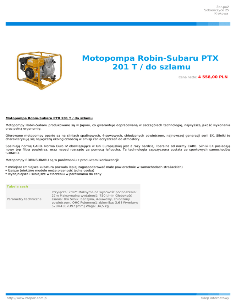Żar-poŻ Sobieńczyce 25 Krokowa Motopompa Robin-Subaru PTX 201 T / do szlamu Cena netto: 4 558,00 PLN Motopompa Robin-Subaru PTX 201 T / do szlamu Motopompy Robin-Subaru produkowane są w Japoni, co gwarantuje dopracowaną w szczegółach technologię, najwyższą jakość wykonania oraz pełną ergonomię. Oferowane motopompy oparte są na silniach spalinowych, 4-suwowych, chłodzonych powietrzem, najnowszej generacji serii EX. Silniki te charakteryzują się najwyższą ekologicznością w emisji zanieczyszczeń do atmosfery. Spełniają normę CARB. Norma Euro IV obowiązujące w Uni Europejskiej jest 2 razy bardziej liberalna od normy CARB. Silniki EX posiadają nowy typ filtra powietrza, oraz napęd rozrządu za pomocą łańcucha. Ta technologia zapożyczona została ze sportowych samochodów SUBARU. Motopompy ROBINSUBARU są w porównaniu z produktami konkurencji: mniejsze (mniejsza kubatura pozwala lepiej zagospodarować małe powierzchnie w samochodach strażackich) lżejsze (niektóre modele może przenosić jedna osoba) wydajniejsze i silniejsze w tłoczeniu w porównaniu do ceny Tabela cech Parametry techniczne http://www.zarpoz.com.pl Przyłącza: 2"x2" Maksymalna wysokość podnoszenia: 27m Maksymalna wydajność: 750 l/min Głębokość ssania: 8m Silnik: benzyna, 4-suwowy, chłodzony powietrzem, OHC Pojemność zbiornika: 3.6 l Wymiary: 570×436×397 [mm] Waga: 34,5 kg sklep internetowy Żar-poŻ Sobieńczyce 25 Krokowa Rozwiązania konstrukcyjne http://www.zarpoz.com.pl Pompa samozasysająca wymaga tylko wstępnego zalania. Samosmarujące uszczelnienie krzemowo-węglowe zapewnia wytrzymałość i trwałość i jest odporne na działanie drobinek materiałów ściernych. Wirnik i obudowa wirnika wykonane z żeliwa zapewniają wysoką trwałość i niezawodność w zmiennych warunkach pracy. Dzięki zastosowaniu aluminium obudowa pompy jest lekka i odporna na uszkodzenia Podkładki dystansowe zapewniają właściwe utrzymanie odległości wirnika i obudowy i niezbędną regulację wynikającą z naturalnego zużycia wirnika. Standardowe wyposażenie obejmuje zestaw narzędzi, przyłącza przewodów, kosz ssawny i opaski zaciskowe. zbiornik zapewnia długotrwałą pracę pomiędzy tankowaniami. Sitko w otworze wlewowym zapobiega przedostawaniu się zanieczyszczeń do paliwa. silniki Subaru wyposażone są w czujnik zapewniający wyłączenie silnika w przypadku zbyt niskiego poziomu oleju (opcja, nie dotyczy silników Diesla). Każdy tłumik zaprojektowany jest indywidualnie do każdego modelu silnika, zapewniając optymalny poziom wyciszenia. Silniki benzynowe wyposażone są w dodatkowy łapacz iskier. Zawór odcinający paliwo z przezroczystym zbiornikiem zanieczyszczeń (silniki benzynowe) Subaru udziela 3-letniej gwarancji na wszystkie swoje produkty. Szczegóły w Ogólnych Warunkach Gwarancji sklep internetowy