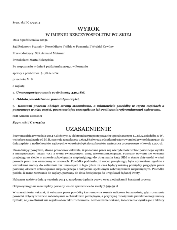 Sygn. akt I C 1794/14 WYROK W IMIENIU RZECZYPOSPOLITEJ POLSKIEJ Dnia 8 października 2015r. Sąd Rejonowy Poznań – Nowe Miasto i Wilda w Poznaniu, I Wydział Cywilny Przewodniczący: SSR Armand Meissner Protokolant: Marta Kulczyńska Po rozpoznaniu w dniu 8 października 2015r. w Poznaniu sprawy z powództwa (...) S.A. w W. przeciwko M. B. o zapłatę 1. Umarza postępowanie co do kwoty 440,18zł, 2. Oddala powództwo w pozostałym części, 3. Kosztami procesu obciąża strony stosunkowo, a mianowicie powódkę w 19/20 częściach a pozwanego w 1/20 części, pozostawiając szczegółowe ich rozliczenie referendarzowi sądowemu. SSR Armand Meissner Sygn. akt I C 1794/14 UZASADNIENIE Pozwem z dnia 2 września 2014 r. złożonym w elektronicznym postępowaniu upominawczym (...) S.A. z siedzibą w W., wniosła o zasądzenie od M. B. na swoją rzecz kwoty 7.672,86 zł wraz z odsetkami ustawowymi od 2 września 2014 r. do dnia zapłaty, a nadto kosztów sądowych w wysokości 96 zł oraz kosztów zastępstwa procesowego w kwocie 1.200 zł. Uzasadniając powyższe, strona powodowa wskazała, iż posiadana przez nią wierzytelność wobec pozwanego wynika z niezapłaconych faktur VAT z tytułu świadczonych usług telekomunikacyjnych. Pozwany bowiem nie wykonał przyjętego na siebie w umowie zobowiązania niepieniężnego do utrzymania karty SIM w stanie aktywności w sieci powoda przez czas oznaczony w umowach. Powódka podniosła, iż wobec powyższego, była uprawniona zgodnie z warunkami umowy do naliczenia kar umownych z tego tytułu za czas będący różnicą pomiędzy przyjętym przez pozwaną okresem zobowiązania niepieniężnego a faktycznie spełnionym zobowiązaniem niepieniężnym. Powódka podała, iż mimo wezwania do zapłaty, pozwany do dnia dzisiejszego do uregulował żądanej kwoty. Nakazem zapłaty z dnia 4 września 2014 r. zasądzono żądania pozwu wraz z odsetkami i kosztami procesu. Od powyższego nakazu zapłaty pozwany wniósł sprzeciw co do kwoty 7.599,99 zł. W uzasadnieniu wskazał, iż wskazana przez powódkę kara umowna została naliczona bezzasadnie, gdyż roszczenie powódki dotyczy w istocie zobowiązania o charakterze pieniężnym, a przyczyną rozwiązania przedmiotowej umowy był fakt, że jako dłużnik nie regulował on faktur w terminie. Jednocześnie wskazał, świadczenia wynikające z faktury VAT nr (...) na kwotę 33,99 zł, faktury VAT nr (...) na kwotę 2,26 zł oraz faktury VAT nr (...) na kwotę 36,72 zł zostały przez niego uiszczone. Wobec skutecznie wniesionego sprzeciwu, nakaz zapłaty wydany w elektronicznym postępowaniu upominawczym utracił moc, zaś sprawa mocą postanowienia z 24 września 2014 r. została przekazana do rozpoznania według właściwości ogólnej pozwanej Sądowi Rejonowemu Poznań – Nowe Miasto i Wilda w Poznaniu. Pismem z dnia 17 grudnia 2014 r. powódka cofnęła powództwo o kwotę 440,18 zł, wnosząc o umorzenie postępowania co do tej kwoty, jednocześnie wnosząc o zasądzenie kwoty 7.232,68 zł wraz z odsetkami ustawowymi od kwoty 7.672,86 zł od 2 września 2014 r. do 18 września 2014 r., od kwoty 7.599,89 zł od 19 września 2014 r. do 29 października 2014 r., od kwoty 7.413,77 zł od 30 października 2014 r. do 3 grudnia 2014 r. oraz od kwoty 7.232,68 zł od 4 grudnia 2014 r. do dnia zapłaty, a nadto kosztów procesu według norm przepisanych, w tym kosztów zastępstwa procesowego i opłaty od pełnomocnictwa w wysokości 17 zł. Pismem z dnia 17 marca 2015 r. pozwany wskazał, iż tytułem roszczenia powództwa dotychczas wpłacił na rzecz powoda kwotę 610,26 zł i wskazał, iż gdyby roszczenie powoda zostało przez sąd uznane, wnosi o rozłożenie pozostałej należności na równe raty, każda po 200 zł płatne w terminie do 15-tego każdego miesiąca, przy czym pierwsza z nich – płatna do 15-tego dnia miesiąca następującego po uprawomocnieniu się wyroku. Sąd ustalił następujący stan faktyczny: W dniu 24 maja 2013 r. powódka - (...) Sp. z o.o. z siedzibą w W. zawarła z pozwanym M. B. umowę o świadczenie usług telekomunikacyjnych. Warunki przedmiotowej umowy nie były indywidualnie uzgadnianie z pozwanym. Dowód: kserokopia umowy wraz z aneksami – k.37-54 Pismem z dnia 14 czerwca 2013 r. pozwany skierował do powódki prośbę o rozwiązanie podpisanych między stronami umów oraz wyliczenie kwoty, jaką jest zobowiązany zapłacić. Wskazał, iż umowy podpisywał będąc pod wpływem narkotyków, nie zdając sobie sprawy z konsekwencji swojego postępowania. W związku z powyższym wniósł o rozłożenie wyliczonej kwoty na raty płatne przez okres trzech miesięcy oraz nie naliczanie od nich odsetek. Dowód: kserokopia pisma pozwanego – k.73 Pismem z dnia 1 lipca 2013 r. powódka poinformowała pozwanego, iż przedstawione przez niego okoliczności nie stanowią podstawy do rozwiązania przedmiotowej umowy bez naliczenia kar umownych, które łącznie wynoszą 6.500 zł. Jednocześnie wskazała, iż przedmiotowe umowy zostały rozwiązane na dzień 27 lipca 2013 r. Dowód: kserokopia pisma powódki – k. 74 Pismem z dnia 30 lipca 2013 r. E. B., działając w imieniu swojego syna, zwróciła się do powódki z prośbą o zsumowanie istniejącego zadłużenia. Dowód: kserokopia pisma E. B. – k.75 W piśmie z 6 sierpnia 2013 r. powódka poinformowała E. B. o rozłożeniu zobowiązania pozwanego na 6 rat, zgodnie z przedstawionym harmonogramem. Jednocześnie wskazała, iż w przypadku braku wpłaty jakiejkolwiek raty w podanym terminie lub wysokości, zgoda na spłatę ratalną zostanie wycofana. Dowód: kserokopia pisma powódki – k.76 Pismem z 20 listopada 2013 r. pozwany oświadczył powódce, iż w chwili obecnej nie posiada środków na spłatę posiadanego zadłużenia, które zobowiązuje się spłacić, gdy tylko znajdzie jakiekolwiek źródło dochodów. Dowód: kserokopia pisma pozwanego – k.77 W dniu 11 września 2013 r. E. B. wpłaciła na rzec