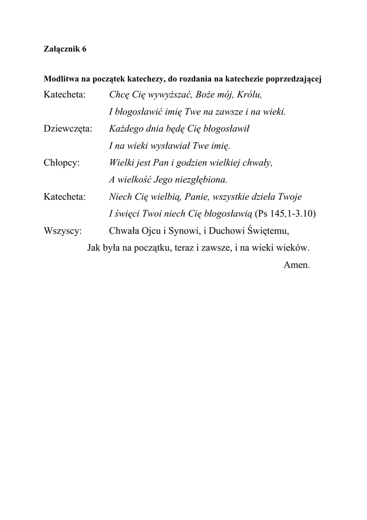 Załącznik 6 Modlitwa na początek katechezy, do rozdania na katechezie poprzedzającej Katecheta: Chcę Cię wywyższać, Boże mój, Królu, I błogosławić imię Twe na zawsze i na wieki. Dziewczęta: Każdego dnia będę Cię błogosławił I na wieki wysławiał Twe imię. Chłopcy: Wielki jest Pan i godzien wielkiej chwały, A wielkość Jego niezgłębiona. Katecheta: Niech Cię wielbią, Panie, wszystkie dzieła Twoje I święci Twoi niech Cię błogosławią (Ps 145,1-3.10) Wszyscy: Chwała Ojcu i Synowi, i Duchowi Świętemu, Jak była na początku, teraz i zawsze, i na wieki wieków. Amen.