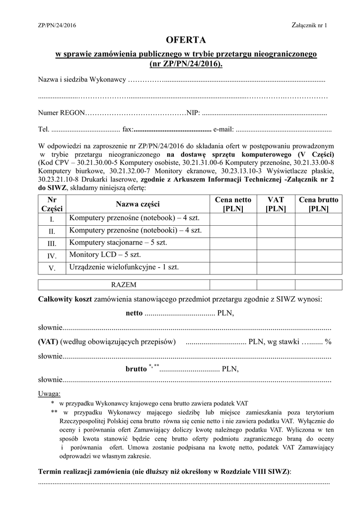 Załącznik nr 1 ZP/PN/24/2016 OFERTA w sprawie zamówienia publicznego w trybie przetargu nieograniczonego (nr ZP/PN/24/2016). Nazwa i siedziba Wykonawcy ……………......................................................................................... ......................………………….................................................................…………….……………… Numer REGON……………………………………NIP: ..................................................................... Tel. ...................................... fax:........................................... e-mail: ..................................................... W odpowiedzi na zaproszenie nr ZP/PN/24/2016 do składania ofert w postępowaniu prowadzonym w trybie przetargu nieograniczonego na dostawę sprzętu komputerowego (V Części) (Kod CPV – 30.21.30.00-5 Komputery osobiste, 30.21.31.00-6 Komputery przenośne, 30.21.33.00-8 Komputery biurkowe, 30.21.32.00-7 Monitory ekranowe, 30.23.13.10-3 Wyświetlacze płaskie, 30.23.21.10-8 Drukarki laserowe, zgodnie z Arkuszem Informacji Technicznej -Załącznik nr 2 do SIWZ, składamy niniejszą ofertę: Nr Części Cena netto [PLN] Nazwa części I. Komputery przenośne (notebook) – 4 szt. II. Komputery przenośne (notebooki) – 4 szt. III. Komputery stacjonarne – 5 szt. IV. Monitory LCD – 5 szt. V. Urządzenie wielofunkcyjne - 1 szt. VAT [PLN] Cena brutto [PLN] RAZEM Całkowity koszt zamówienia stanowiącego przedmiot przetargu zgodnie z SIWZ wynosi: netto .................................... PLN, słownie......................................................................................................................................... (VAT) (według obowiązujących przepisów) ............................... PLN, wg stawki …....... % słownie......................................................................................................................................... brutto *, **............................... PLN, słownie......................................................................................................................................... Uwaga: * w przypadku Wykonawcy krajowego cena brutto zawiera podatek VAT ** w przypadku Wykonawcy mającego siedzibę lub miejsce zamieszkania poza terytorium Rzeczypospolitej Polskiej cena brutto równa się cenie netto i nie zawiera podatku VAT. Wyłącznie do oceny i porównania ofert Zamawiający doliczy kwotę należnego podatku VAT. Wyliczona w ten sposób kwota stanowić będzie cenę brutto oferty podmiotu zagranicznego braną do oceny i porównania ofert. Umowa zostanie podpisana na kwotę netto, podatek VAT Zamawiający odprowadzi we własnym zakresie. Termin realizacji zamówienia (nie dłuższy niż określony w Rozdziale VIII SIWZ): ................................................................................................................................................................. Załącznik nr 1 ZP/PN/24/2016 Gwarancja (warunki co najmniej takie jakie określono w Załączniku Informacji Technicznej: ................................................................................................................................................................. Warunki płatności: co najmniej takie jakie określono w Rozdziale VIII SIWZ: Oświadczam, że: 1. W cenie naszej oferty uwzględniono wszystkie koszty wykonania zamówienia. 2. Uważamy się za związanych niniejszą ofertą na czas wskazany w SIWZ. 3. Zapoznaliśmy się ze Specyfikacją Istotnych Warunków Zamówienia i nie wnosimy do niej żadnych zastrzeżeń. 4. Wadium w kwocie ............................ zostało wniesione w dniu .............................. r. w formie ................................................................................................................................... . 5. W razie wybrania naszej oferty zobowiązujemy się do podpisania umowy na warunkach zawartych w dokumentacji oraz w miejscu i terminie określonych przez zamawiającego. 6. Oferta została złożona na .............. stronach, kolejno ponumerowanych od nr............. do nr............, w tym informacje zawarte na stronach od nr............. do nr............ stanowią tajemnice przedsiębiorstwa, zgodnie z art. 11 ust.4 ustawy z dnia 16 kwietnia 1993 roku o zwalczaniu nieuczciwej konkurencji (tj. Dz. U. z 2003 r Nr 153 poz. 1503 z późn. zm.) 7. Do oferty załączamy oświadczenia i dokumenty potwierdzające spełnienie wszystkich warunków określonych w SIWZ, dotyczące przedmiotu zamówienia Załącznikami do niniejszej oferty są: 1) ................................................ 5) ................................................ 2) ................................................ 6) ................................................ 3) ................................................ 7) ................................................ 4) ………………………………. 8) ………………………………. pieczęć firmowa .............................., dn. ............................ ..................................... /upełnomocniony(eni) przedstawiciel(e) Wykonawcy/ czytelny podpis(lub z pieczątką imienną) Strona 2 z 2