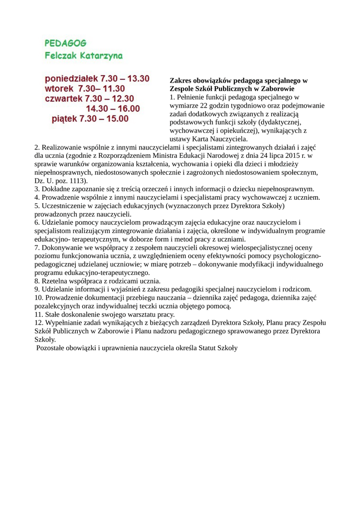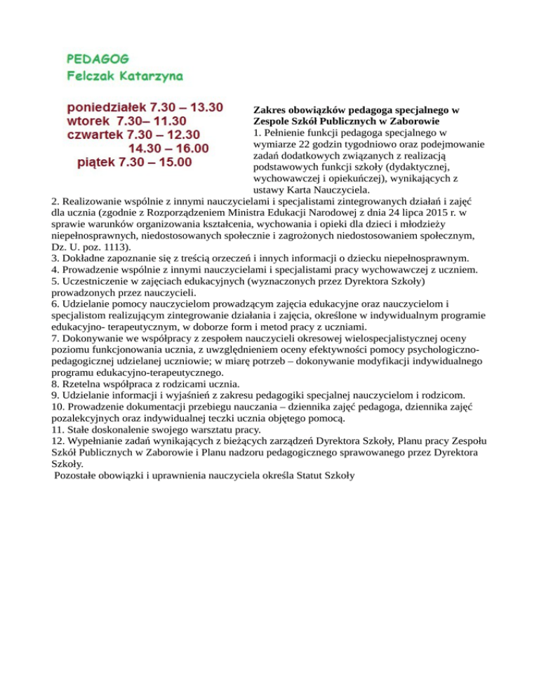 Zakres obowiązków pedagoga specjalnego w Zespole Szkół Publicznych w Zaborowie 1. Pełnienie funkcji pedagoga specjalnego w wymiarze 22 godzin tygodniowo oraz podejmowanie zadań dodatkowych związanych z realizacją podstawowych funkcji szkoły (dydaktycznej, wychowawczej i opiekuńczej), wynikających z ustawy Karta Nauczyciela. 2. Realizowanie wspólnie z innymi nauczycielami i specjalistami zintegrowanych działań i zajęć dla ucznia (zgodnie z Rozporządzeniem Ministra Edukacji Narodowej z dnia 24 lipca 2015 r. w sprawie warunków organizowania kształcenia, wychowania i opieki dla dzieci i młodzieży niepełnosprawnych, niedostosowanych społecznie i zagrożonych niedostosowaniem społecznym, Dz. U. poz. 1113). 3. Dokładne zapoznanie się z treścią orzeczeń i innych informacji o dziecku niepełnosprawnym. 4. Prowadzenie wspólnie z innymi nauczycielami i specjalistami pracy wychowawczej z uczniem. 5. Uczestniczenie w zajęciach edukacyjnych (wyznaczonych przez Dyrektora Szkoły) prowadzonych przez nauczycieli. 6. Udzielanie pomocy nauczycielom prowadzącym zajęcia edukacyjne oraz nauczycielom i specjalistom realizującym zintegrowanie działania i zajęcia, określone w indywidualnym programie edukacyjno- terapeutycznym, w doborze form i metod pracy z uczniami. 7. Dokonywanie we współpracy z zespołem nauczycieli okresowej wielospecjalistycznej oceny poziomu funkcjonowania ucznia, z uwzględnieniem oceny efektywności pomocy psychologicznopedagogicznej udzielanej uczniowie; w miarę potrzeb – dokonywanie modyfikacji indywidualnego programu edukacyjno-terapeutycznego. 8. Rzetelna współpraca z rodzicami ucznia. 9. Udzielanie informacji i wyjaśnień z zakresu pedagogiki specjalnej nauczycielom i rodzicom. 10. Prowadzenie dokumentacji przebiegu nauczania – dziennika zajęć pedagoga, dziennika zajęć pozalekcyjnych oraz indywidualnej teczki ucznia objętego pomocą. 11. Stałe doskonalenie swojego warsztatu pracy. 12. Wypełnianie zadań wynikających z bieżących zarządzeń Dyrektora Szkoły, Planu pracy Zespołu Szkół Publicznych w Zaborowie i Planu nadzoru pedagogicznego sprawowanego przez Dyrektora Szkoły. Pozostałe obowiązki i uprawnienia nauczyciela określa Statut Szkoły