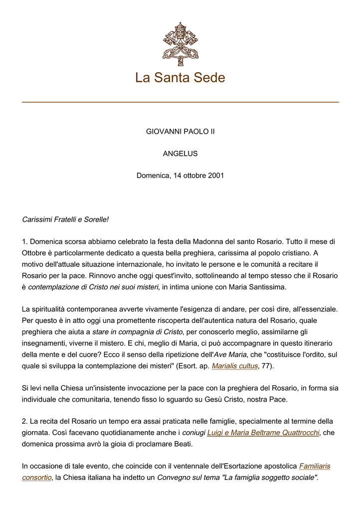 La Santa Sede GIOVANNI PAOLO II ANGELUS Domenica, 14 ottobre 2001 Carissimi Fratelli e Sorelle! 1. Domenica scorsa abbiamo celebrato la festa della Madonna del santo Rosario. Tutto il mese di Ottobre è particolarmente dedicato a questa bella preghiera, carissima al popolo cristiano. A motivo dell'attuale situazione internazionale, ho invitato le persone e le comunità a recitare il Rosario per la pace. Rinnovo anche oggi quest'invito, sottolineando al tempo stesso che il Rosario è contemplazione di Cristo nei suoi misteri, in intima unione con Maria Santissima. La spiritualità contemporanea avverte vivamente l'esigenza di andare, per così dire, all'essenziale. Per questo è in atto oggi una promettente riscoperta dell'autentica natura del Rosario, quale preghiera che aiuta a stare in compagnia di Cristo, per conoscerlo meglio, assimilarne gli insegnamenti, viverne il mistero. E chi, meglio di Maria, ci può accompagnare in questo itinerario della mente e del cuore? Ecco il senso della ripetizione dell'Ave Maria, che "costituisce l'ordito, sul quale si sviluppa la contemplazione dei misteri" (Esort. ap. Marialis cultus, 77). Si levi nella Chiesa un'insistente invocazione per la pace con la preghiera del Rosario, in forma sia individuale che comunitaria, tenendo fisso lo sguardo su Gesù Cristo, nostra Pace. 2. La recita del Rosario un tempo era assai praticata nelle famiglie, specialmente al termine della giornata. Così facevano quotidianamente anche i coniugi Luigi e Maria Beltrame Quattrocchi, che domenica prossima avrò la gioia di proclamare Beati. In occasione di tale evento, che coincide con il ventennale dell'Esortazione apostolica Familiaris consortio, la Chiesa italiana ha indetto un Convegno sul tema "La famiglia soggetto sociale". 2 Esprimo il mio apprezzamento per questa iniziativa ed auspico che la famiglia trovi nella società italiana una rinnovata centralità. Sabato prossimo, nel pomeriggio, le famiglie cristiane sono invitate per un incontro di riflessione e preghiera, in Piazza San Pietro. Il giorno dopo, domenica, si avrà il momento culminante della celebrazione con la solenne Beatificazione dei due coniugi, in coincidenza con la Giornata Missionaria Mondiale. Sarà un'occasione propizia per sottolineare il ruolo delle famiglie nella missione evangelizzatrice della Chiesa. 3. Mentre recitiamo insieme la preghiera dell'Angelus, ricordiamo l'Assemblea del Sinodo dei Vescovi, che si sta svolgendo in Vaticano; affidiamo alla Vergine tutti i missionari del Vangelo ed imploriamo per loro la forza di essere costruttori di giustizia e di pace. Per tale pace si sta pregando in tutto il mondo in quest'ora carica di gravi preoccupazioni. Uniamo la nostra fervente preghiera al Signore per intercessione di Maria, Regina della Pace. Dopo l'Angelus: Saluto in lingua polacca: Z wdzięcznością przyjmuję wiadomość, że na wniosek Fundacji "Dzieło nowego tysiąclecia" Konferencja Episkopatu Polski ogłosiła niedzielę przed 16. padziernika dniem modlitw za Papieża i refleksji nad jego posługą Kościołowi. Zawsze liczyłem na duchowe wsparcie moich Rodaków i stale je otrzymuję. Ze swej strony odwzajemniam ich życzliwość przed Panem, prosząc Go o wszelkie dobro, jakiego potrzebuje Polska i Polacy. Proszę, abyśmy nadal trwali w tej komunii modlitwy. Wiem, że ten dzień łączy się z piękną ideą wspierania przez stypendia młodych Polaków, którzy znajdują się w trudnych warunkach materialnych. Pod hasłem "Dzielmy się miłością" ich rówieśnicy - harcerze i członkowie Akcji Katolickiej - zbierają fundusze, które zostaną przeznaczone na ten cel. Dziękuję organizatorom, artystom i wszystkim, którzy włączają się w to dzieło. Niech «dzień papieski» przyniesie wszystkim Polakom głębokie przeżycia duchowe i obfite owoce łaski. Niech Wam Bóg błogosławi! Traduzione italiana del saluto in lingua polacca: Accolgo con gratitudine la notizia che alla proposta della Fondazione «Dzieło nowego tysiąclecia» (L’Opera del nuovo millennio) la Conferenza Episcopale Polacca ha proclamato la domenica precedente il giorno del 16 ottobre come giorno di preghiera per il Papa e di riflessione sul suo 3 ministero nella Chiesa. Ho sempre contato sul sostegno spirituale da parte dei miei connazionali e lo ottengo sempre. Da parte mia contraccambio la loro benevolenza davanti al Signore, chiedendo a Lui ogni bene di cui necessita la Polonia e i polacchi. Vi prego di restare ancora con me in questa comunione di preghiera. So che con questa giornata è legata la bella idea di sostenere tramite le borse di studio i giovani polacchi che si trovano in situazione economica difficile. Sotto il motto «Dzielmy się miłością» (Condividiamo l’amore) i loro coetanei - gli scout e i membri dell’Azione Cattolica - raccolgono i fondi che verranno destinati a questo scopo. Ringrazio gli organizzatori, gli artisti e tutti coloro che si impegnano in quest’opera. La «giornata papale» porti a tutti i polacchi profonde esperienze spirituali e abbondanti frutti di grazia. Dio vi benedica! © Copyright 2001 - Libreria Editrice Vaticana © Copyright - Libreria Editrice Vaticana