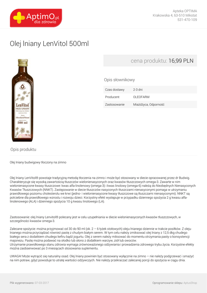 Apteka OPTIMA Krakowska 4, 63-510 Mikstat 531-470-109 Olej lniany LenVitol 500ml cena produktu: 16,99 PLN Opis słownikowy Czas dostawy 2-3 dni Producent OLEOFARM Zastosowanie Miażdżyca, Odporność Opis produktu Olej lniany budwigowy tłoczony na zimno Olej lniany LenVitol® powstaje tradycyjną metodą tłoczenia na zimno i może być stosowany w diecie opracowanej przez dr Budwig. Charakteryzuje się wysoką zawartością tłuszczów wielonienasyconych oraz kwasów tłuszczowych omega-3. Zawarte w nim wielonienasycone kwasy tłuszczowe: kwas alfa-linolenowy (omega-3) i kwas linolowy (omega-6) należą do Niezbędnych Nienasyconych Kwasów Tłuszczowych (NNKT). Zastępowanie w diecie tłuszczów nasyconych tłuszczami nienasyconymi pomaga w utrzymaniu prawidłowego poziomu cholesterolu we krwi (jedno- i wielonienasycone kwasy tłuszczowe są tłuszczami nienasyconymi). NNKT są potrzebne dla prawidłowego wzrostu i rozwoju dzieci. Korzystny efekt występuje w przypadku dziennego spożycia 2 g kwasu alfalinolenowego (ALA) i dziennego spożycia 10 g kwasu linolowego (LA). Zastosowanie: olej lniany Lenvitol® polecany jest w celu uzupełniania w diecie wielonienasyconych kwasów tłuszczowych, w szczególności kwasów omega-3. Zalecane spożycie: można przyjmować od 30 do 90 ml (ok. 2 – 6 łyżek stołowych) oleju lnianego dziennie w trakcie posiłków. Z oleju lnianego można przyrządzać również pastę z chudym białym serem. W tym celu należy zmiksować olej lniany z 12,5 dkg chudego białego sera z dodatkiem chudego kefiru bądź jogurtu. Olej z serem należy miksować do momentu otrzymania pasty o konsystencji majonezu. Pastę można podawać na słodko lub słono z dodatkiem warzyw, ziół lub owoców. Utrzymanie prawidłowego stanu zdrowia wymaga zrównoważonego odżywiania i prowadzenia zdrowego trybu życia. Korzystne efekty można zaobserwować po 3 miesiącach stosowania suplementu. UWAGA! Może wytrącić się naturalny osad. Olej lniany powinien być stosowany wyłącznie na zimno – nie należy podgrzewać i smażyć na nim potraw, gdyż powoduje to utratę wartości odżywczych. Nie należy przekraczać zalecanej porcji do spożycia w ciągu dnia. Plik wygenerowano: 07-03-2017 Oprogramowanie sklepu: AptusShop Apteka OPTIMA Krakowska 4, 63-510 Mikstat 531-470-109 Suplement diety nie może być stosowany jako substytut zróżnicowanej diety. Skład: olej lniany tłoczony na zimno wysokolinolenowy. Dzienna porcja zawiera: 2 łyżki stołowe (30 ml – 27,6 g) 6 łyżek stołowych (90 ml – 82,8 g) Kwasy tł. jednonienasycone (omega-9) 5,6 g 16,7 g Kwasy tł. wielonienasycone, w tym: - omega-3 (kwas alfa-linolenowy) - omega-6 (kwas linolowy) 13,9 g 14,8 g 4,4 g 58 g 44,7 g 13,2 g Przechowywanie: przechowywać w temp. 4-10°C, w szczelnie zamkniętej butelce, z dala od źródeł światła. Przechowywać w sposób niedostępny dla małych dzieci. Plik wygenerowano: 07-03-2017 Powered by TCPDF (www.tcpdf.org) Oprogramowanie sklepu: AptusShop