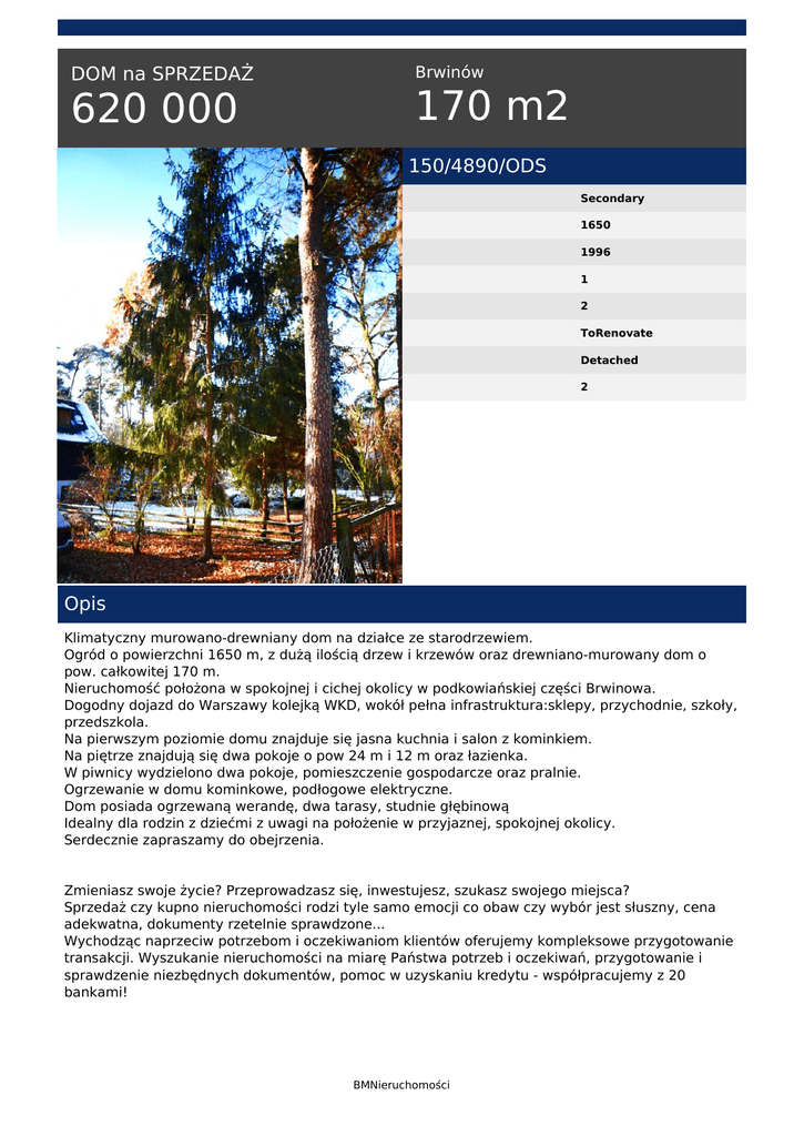 DOM na SPRZEDAŻ 620 000 Brwinów 170 m2 150/4890/ODS Secondary 1650 1996 1 2 ToRenovate Detached 2 Opis Klimatyczny murowano-drewniany dom na działce ze starodrzewiem. Ogród o powierzchni 1650 m, z dużą ilością drzew i krzewów oraz drewniano-murowany dom o pow. całkowitej 170 m. Nieruchomość położona w spokojnej i cichej okolicy w podkowiańskiej części Brwinowa. Dogodny dojazd do Warszawy kolejką WKD, wokół pełna infrastruktura:sklepy, przychodnie, szkoły, przedszkola. Na pierwszym poziomie domu znajduje się jasna kuchnia i salon z kominkiem. Na piętrze znajdują się dwa pokoje o pow 24 m i 12 m oraz łazienka. W piwnicy wydzielono dwa pokoje, pomieszczenie gospodarcze oraz pralnie. Ogrzewanie w domu kominkowe, podłogowe elektryczne. Dom posiada ogrzewaną werandę, dwa tarasy, studnie głębinową Idealny dla rodzin z dziećmi z uwagi na położenie w przyjaznej, spokojnej okolicy. Serdecznie zapraszamy do obejrzenia. Zmieniasz swoje życie? Przeprowadzasz się, inwestujesz, szukasz swojego miejsca? Sprzedaż czy kupno nieruchomości rodzi tyle samo emocji co obaw czy wybór jest słuszny, cena adekwatna, dokumenty rzetelnie sprawdzone... Wychodząc naprzeciw potrzebom i oczekiwaniom klientów oferujemy kompleksowe przygotowanie transakcji. Wyszukanie nieruchomości na miarę Państwa potrzeb i oczekiwań, przygotowanie i sprawdzenie niezbędnych dokumentów, pomoc w uzyskaniu kredytu - współpracujemy z 20 bankami! BMNieruchomości Niniejsze ogłoszenie nie stanowi oferty w rozumieniu Kodeksu Cywilnego, lecz ma charakter informacyjny. Niektóre zdjęcia mogą przedstawiać przykładowe możliwości aranżacji wnętrza lub elewacji - nie są odzwierciedleniem rzeczywistego stanu prezentowanej nieruchomości. Zapraszamy! BMNieruchomości http://www.bmn.net.pl Bożena Milewska tel. 512118911 tel. 22 3337383 email: [email protected] BMNieruchomości Powered by TCPDF (www.tcpdf.org)