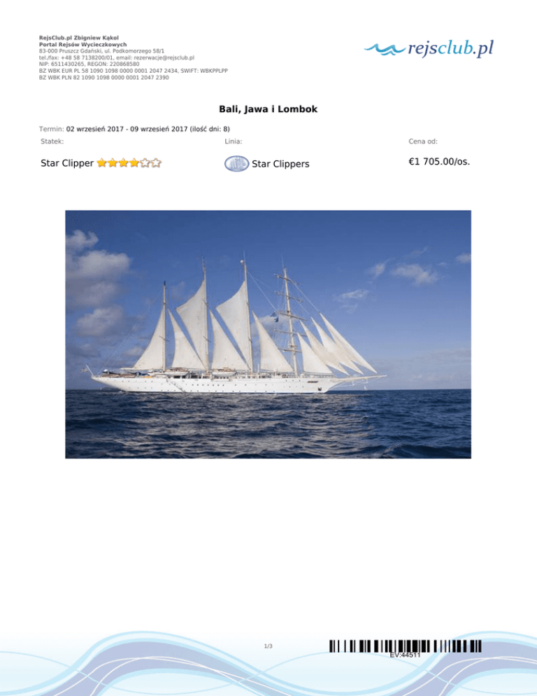 RejsClub.pl Zbigniew Kąkol Portal Rejsów Wycieczkowych 83-000 Pruszcz Gdański, ul. Podkomorzego 58/1 tel./fax: +48 58 7138200/01, email: [email protected] NIP: 6511430265, REGON: 220868580 BZ WBK EUR PL 58 1090 1098 0000 0001 2047 2434, SWIFT: WBKPPLPP BZ WBK PLN 82 1090 1098 0000 0001 2047 2390 Bali, Jawa i Lombok Termin: 02 wrzesień 2017 - 09 wrzesień 2017 (ilość dni: 8) Statek: Star Clipper Linia: Cena od: Star Clippers €1 705.00/os. 1/3 EV:44511 RejsClub.pl Zbigniew Kąkol Portal Rejsów Wycieczkowych 83-000 Pruszcz Gdański, ul. Podkomorzego 58/1 tel./fax: +48 58 7138200/01, email: [email protected] NIP: 6511430265, REGON: 220868580 BZ WBK EUR PL 58 1090 1098 0000 0001 2047 2434, SWIFT: WBKPPLPP BZ WBK PLN 82 1090 1098 0000 0001 2047 2390 TRASA REJSU Data Port Wpłynięcie Wypłynięcie sobota 02.09.2017 Benoa, Bali --:-- --:-- dzień 2 niedziela 03.09.2017 Dzień na morzu --:-- --:-- dzień 3 poniedziałek 04.09.2017 East Madura --:-- --:-- wtorek 05.09.2017 Probolinggo , Wyspy Jawa --:-- --:-- środa 06.09.2017 Lovina Beach, Bali --:-- --:-- czwartek 07.09.2017 Carik, Lombok --:-- --:-- czwartek 07.09.2017 Senggigi Beach, Lombok --:-- --:-- piątek 08.09.2017 Gili Sudak, Lombok --:-- --:-- sobota 09.09.2017 Benoa, Bali --:-- --:-- dzień 1 dzień 4 dzień 5 dzień 6 dzień 6 dzień 7 dzień 8 Legenda Indonezja Indonezja Indonezja Indonezja Indonezja Indonezja Indonezja Indonezja Godziny przypłynięcia i wypłynięcia do/z poszczególnych portów uzależnione są od warunków pogodowych. CENNIK Cena katalogowa Kabina wewnętrzna od €1 705.00 Kabina zewnętrzna z oknem od €1 900.00 Suite (apartament) €3 705.00 Kabina jednoosobowa €2 185.00 3 osoba dorosła w kabinie €635.00 dziecko do 18 lat jako 3 i 4 osoba w kabinie €635.00 Cena promocyjna 2/3 EV:44511 RejsClub.pl Zbigniew Kąkol Portal Rejsów Wycieczkowych 83-000 Pruszcz Gdański, ul. Podkomorzego 58/1 tel./fax: +48 58 7138200/01, email: [email protected] NIP: 6511430265, REGON: 220868580 BZ WBK EUR PL 58 1090 1098 0000 0001 2047 2434, SWIFT: WBKPPLPP BZ WBK PLN 82 1090 1098 0000 0001 2047 2390 Opłaty portowe €205.00 Uwaga! Ceny za osobę w kabinie dwuosobowej. Cena zawiera: zakwaterowanie w kabinie wybranej kategorii; wyżywienie - 3 główne posiłki, przekąski między posiłkami, bufet lub przekąski o północy; napoje serwowane do śniadania i w bufetach samoobsługowych; serwis bagażowy podczas wejścia i zejścia ze statku; serwis kabinowy; korzystanie ze wszystkich urządzeń sportowo - rekreacyjnych znajdujących się na pokładzie statku (basen, jacuzzi, sala fitness, itp.); udział we wszystkich imprezach organizowanych na statku (przedstawienia w teatrze, koncerty, programy animacyjne itp.). Cena nie zawiera: kosztów dojazdu do portu; ewentualnych noclegów w hotelu przed/po rejsie i transferów; wycieczek fakultatywnych w trakcie rejsu; korzystania z barów, mini baru w kabinie oraz napojów zamawianych w restauracji; korzystania z punktów usługowych (fryzjer, pralnia, fotograf, salon piękności i odnowy biologicznej, internet) i wydatków osobistych; napiwków dla obsługi na statku (kwota uzależniona od długości rejsu); ubezpieczenia KL, NNW i bagaż, kosztów wiz (tam gdzie wymagane). 3/3 EV:44511