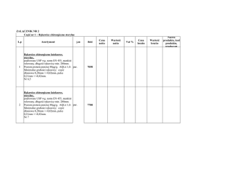 ZAŁĄCZNIK NR 2 Część nr 1 – Rękawice chirurgiczne sterylne L.p Asortyment j.m ilość 1 Rękawice chirurgiczne lateksowe, sterylne, pudrowane USP wg. norm EN 455, mankiet rolowany, długość rękawicy min. 280mm. Poziom protein poniżej 80μg/g. AQL≤ 1,0. par. Minimalne grubości rękawicy: część dłoniowa 0,20mm +/-0,02mm, palce 0,21mm +/-0,02mm. Nr 6,5 7050 2 Rękawice chirurgiczne lateksowe, sterylne, pudrowane USP wg. norm EN 455, mankiet rolowany, długość rękawicy min. 280mm. Poziom protein poniżej 80μg/g. AQL≤ 1,0. par. Minimalne grubości rękawicy: część dłoniowa 0,20mm +/-0,02mm, palce 0,21mm +/-0,02mm. Nr 7 7700 Cena netto Wartość netto Vat % Cena brutto Wartość brutto Nazwa produktu, kod produktu, producent 3 Rękawice chirurgiczne lateksowe, sterylne, pudrowane USP wg. norm EN 455, mankiet rolowany, długość rękawicy min. 280mm. Poziom protein poniżej 80μg/g. AQL≤ 1,0. par. Minimalne grubości rękawicy: część dłoniowa 0,20mm +/-0,02mm, palce 0,21mm +/-0,02mm. Nr 7,5 3550 4 Rękawice chirurgiczne lateksowe, sterylne, pudrowane USP wg. norm EN 455, mankiet rolowany, długość rękawicy min. 280mm. Poziom protein poniżej 80μg/g. AQL≤ 1,0. par. Minimalne grubości rękawicy: część dłoniowa 0,20mm +/-0,02mm, palce 0,21mm +/-0,02mm. Nr 8 4650 5 Rękawice chirurgiczne lateksowe, bezpudrowe w wenętrzną warstwą bezlateksową - polimerową, mankiet rolowany, długość rękawicy min. 290mm. Jałowe, sterylizowane radiacyjnie. par. Poziom protein poniżej 35μg/g. AQL≤ 1,0. Minimalne grubości rękawicy: część dłoniowa 0,20mm, palce 0,21mm. Nr 6 600 6 Rękawice chirurgiczne lateksowe, bezpudrowe w wenętrzną warstwą bezlateksową - polimerową, mankiet rolowany, długość rękawicy min. 290mm. Jałowe, sterylizowane radiacyjnie. par. Poziom protein poniżej 35μg/g. AQL≤ 1,0. Minimalne grubości rękawicy: część dłoniowa 0,20mm, palce 0,21mm. Nr 6,5 4600 Rękawice chirurgiczne lateksowe, bezpudrowe w wenętrzną warstwą bezlateksową - polimerową, mankiet rolowany, długość rękawicy min. 7 290mm. Jałowe, sterylizowane radiacyjnie. par. Poziom protein poniżej 35μg/g. AQL≤ 1,0. Minimalne grubości rękawicy: część dłoniowa 0,20mm, palce 0,21mm. Nr 7 3750 Rękawice chirurgiczne lateksowe, bezpudrowe w wenętrzną warstwą bezlateksową - polimerową, mankiet rolowany, długość rękawicy min. 8 290mm. Jałowe, sterylizowane radiacyjnie. par. Poziom protein poniżej 35μg/g. AQL≤ 1,0. Minimalne grubości rękawicy: część dłoniowa 0,20mm, palce 0,21mm. Nr 7,5 1850 Rękawice chirurgiczne lateksowe, bezpudrowe w wenętrzną warstwą bezlateksową - polimerową, mankiet rolowany, długość rękawicy min. 9 290mm. Jałowe, sterylizowane radiacyjnie. par. Poziom protein poniżej 35μg/g. AQL≤ 1,0. Minimalne grubości rękawicy: część dłoniowa 0,20mm, palce 0,21mm. Nr 8 3700 miejscowość i data podpis pieczatka upoważnionego przedstawiciela wykonawcy ZAŁĄCZNIK NR 2 Część 2- Rękawice diagnostyczne Lp Asortyment Rękawice diagnostyczne z winylu, bezpudrowe, jednorazowego użytku, niesterylne, nie zawierające protein lateksu, przezroczyste, pasujące na prawą i lewą rękę. Powierzchnia rękawic gładka, rant mankietu rolowany. AQL 1,5. Grubość rękawicy w części dłoniowej 0,10mm +/-0,02mm, na palcach 1 0,12mm +/-0,02mm, na mankiecie 0,09mm +/-0,02mm, minimalna długość rękawicy 240mm. Wyrób medyczny klasy I i środek ochrony osobistej Kategorii III. Rękawice zgodne z normami EN 455 część 1, 2, 3 , 4. Pakowane po 100 szt. Rozmiary: XS, S, M, L, XL - rozmiar do wyboru przez Zamawiającego. j.m ilość op. 1590 Cena netto Wartość netto Vat % Cena brutto Wartość brutto Nazwa produktu, kod produktu, producent Rękawice diagnostyczne z lateksu, bezpudrowe, jednorazowego użytku, niesterylne, o obniżónym poziomie protein - ≤35μg/g , pasujące na prawą i lewą rękę. Powierzchnia rękawic teksturowana, rant mankietu rolowany. AQL 1,5. Grubość rękawicy w części dłoniowej 0,12mm +/-0,02mm, na 2 palcach 0,14mm +/-0,02mm, na mankiecie 0,10mm +/-0,02mm, minimalna długość rękawicy 240mm. Wyrób medyczny klasy I i środek ochrony osobistej min. Kategorii I. Rękawice zgodne z normami EN 455 część 1, 2, 3 , 4. Pakowane po 100 szt. Rozmiary: XS, S, M, L, XL - rozmiar do wyboru przez Zamawiającego. op. 107 Rękawice diagnostyczne z nitrylu, bezpudrowe, jednorazowego użytku, niesterylne, nie zawierające protein lateksu, pasujące na prawą i lewą rękę. Powierzchnia rękawic teksturowana min. na końcach palców, rant mankietu rolowany. AQL 1,5. Grubość rękawicy w części dłoniowej 0,09mm +/0,02mm, na palcach 0,12mm +/-0,02mm, na mankiecie 0,08mm +/-0,02mm, minimalna długość rękawicy 240mm. Wyrób medyczny klasy I i środek ochrony osobistej Kategorii III. Rękawice zgodne z normami EN 455 część 1, 2, 3 , 4. Pakowane po 100 szt. Rozmiary: XS, S, M, L, XL - rozmiar do wyboru przez Zamawiającego. op. 6174 Rękawice foliowe, niejałowe higieniczne, z folii HDPE, teksturowanej, 4 pasujące na prawą i lewą rękę. Pakowane po 100 szt. Rozmiary: M, L - do wyboru przez Zamawiającego. op. 80 Rękawice ginekologiczno - położnicze, sterylne, z lateksu o poziomie protein poniżej 20µg/g, dł. 500mm, rozmiary 6,5; 7,5, 8,5. Pakowane parami. par. 100 3 5 miejscowość i data podpis pieczatka upoważnionego przedstawiciela wykonawcy ZAŁĄCZNIK NR 2 Część nr 3 - Rękawice chirurgiczne operacyjne Lp Asortyment j.m ilość 1 Rękawice chirurgiczne lateksowe, sterylne, bezpudrowe, powlekane polimerami i silikonowane, z niską zawartością protein par. poniżej 50μg/g, wolne od MTB, DPG, mankiet bez rulonu z taśmą przyklejaną, długość rękawicy min. 290mm. AQL≤ 1,0. Nr 6,5 5280 2 Rękawice chirurgiczne lateksowe, sterylne, bezpudrowe, powlekane polimerami i silikonowane, z niską zawartością protein par. poniżej 50μg/g, wolne od MTB, DPG, mankiet bez ru