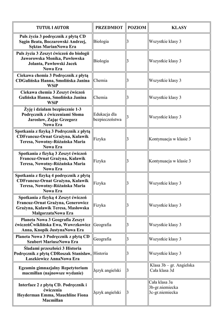 TUTUŁ I AUTOR Puls życia 3 podręcznik z płytą CD Sągin Beata, Boczarowski Andrzej, Sęktas MarianNowa Era Puls życia 3 Zeszyt ćwiczeń do biologii Jaworowska Monika, Pawłowska Jolanta, Pawłowski Jacek Nowa Era Ciekawa chemia 3 Podręcznik z płytą CDGulińska Hanna, Smolińska Janina WSiP Ciekawa chemia 3 Zeszyt ćwiczeń Gulińska Hanna, Smolińska Janina WSiP Żyję i działam bezpiecznie 1-3 Podręcznik z ćwiczeniami Słoma Jarosław, Zając Grzegorz Nowa Era Spotkania z fizyką 3 Podręcznik z płytą CDFrancuz-Ornat Grażyna, Kulawik Teresa, Nowotny-Różańska Maria Nowa Era Spotkania z fizyką 3 Zeszyt ćwiczeń Francuz-Ornat Grażyna, Kulawik Teresa, Nowotny-Różańska Maria Nowa Era Spotkania z fizyką 4 podręcznik z płytą CDFrancuz-Ornat Grażyna, Kulawik Teresa, Nowotny-Różańska Maria Nowa Era Spotkania z fizyką 4 Zeszyt ćwiczeń Francuz-Ornat Grażyna, Generowicz Grażyna, Kulawik Teresa, Masłowska MałgorzataNowa Era Planeta Nowa 3 Geografia Zeszyt ćwiczeńĆwiklińska Ewa, Wawrzkowicz Anna, Knopik JustynaNowa Era Planeta Nowa 3 Podręcznik z płytą CD Szubert MariuszNowa Era Śladami przeszłości 3 Historia Podręcznik z płytą CDRoszak Stanisław, Łaszkiewicz AnnaNowa Era Egzamin gimnazjalny Repetytorium macmillan (najnowsze wydanie) Interface 2 z płytą CD. Podręcznik i ćwiczenia Heyderman Emma, Mauchline Fiona Macmillan PRZEDMIOT POZIOM KLASY Biologia 3 Wszystkie klasy 3 Biologia 3 Wszystkie klasy 3 Chemia 3 Wszystkie klasy 3 Chemia 3 Wszystkie klasy 3 Edukacja dla bezpieczeństwa 3 Wszystkie klasy 3 Fizyka 3 Kontynuacja w klasie 3 Fizyka 3 Kontynuacja w klasie 3 Fizyka 3 Wszystkie klasy 3 Fizyka 3 Wszystkie klasy 3 Geografia 3 Wszystkie klasy 3 Geografia 3 Wszystkie klasy 3 Historia 3 Wszystkie klasy 3 3 Klasa 3b – gr. Angielska Cała klasa 3d 3 Cała klasa 3a 3b-gr.niemiecka 3c-gr.niemiecka Język angielski Język angielski Interface 3 ćwiczenia Emma Heyderman, Fiona Mauchline Macmillan Język angielski 3 3c – gr. Angielska (kontynuacja z klasy 2) FCE Gold Język angielski 3 3c – gr. Angielska (kontynuacja z klasy 2) New Exam Connections 2 Wydawnictwo Oxford Kompass 3 neu Książka ćwiczeń do języka niemieckiego dla gimnazjum z płytą CD Jezierska-Wiejak Małgorzata, Sibiga Agnieszka, Reymont Elżbieta Wydawnictwo Szkolne PWN Kompass 3 neu Podręcznik do języka niemieckiego dla gimnazjum z płytą CD Jezierska-Wiejak Małgorzata, Sibiga Agnieszka, Reymont Elżbieta Wydawnictwo Szkolne PWN Kompass 4 neuKsiążka ćwiczeń do języka niemieckiego dla gimnazjum z płytą CD Reymont Elżbieta, Sibiga Agnieszka, Jezierska-Wiejak Małgorzata Wydawnictwo Szkolne PWN Kompass 4 neu Podręcznik do języka niemieckiego dla gimnazjum z płytą CD Reymont Elżbieta, Sibiga Agnieszka, Jezierska-Wiejak Małgorzata Wydawnictwo Szkolne PWN Świat w słowach i obrazach 3 Język polski PodręcznikBobiński Witold WSiP Gramatyka i stylistyka 3 Język polski Podręcznik Czarniecka-Rodzik Zofia WSiP Słowa na czasie 3 Podręcznik do kształcenia literackiego i kulturowego Słowa na czasie 3 Podręcznik do kształcenia językowego z ćwiczeniami Wilga Herman, Grabarczyk Anna Egzamin gimnazjalny z matematyki Aksjomat Piotr Nodzyński Matematyka z plusem 3 Podręcznik GWO Tak niech świeci wasze światło ks. Piotr Tomasik Dziś i jutro 2 Podręcznik z ćwiczeniami Janicka Iwona, Janicki Arkadiusz, Kucia Aleksandra, Maćkowski Tomasz Nowa Era Technika w praktyce 1-3 Zajęcia mechaniczno-motoryzacyjne Podręcznik Język angielski 3 Cała klasa 3e Język niemiecki 3 Cała klasy 3a 3d 3e klasa 3b,3c ( grupy podstawowe) Język niemiecki 3 Cała klasy 3a 3d 3e klasa 3b,3c ( grupy podstawowe) Język niemiecki 3 klasa 3b 3c ( grupy zaawansowane) Język niemiecki 3 klasa 3b 3c ( grupy zaawansowane) Język polski 3 Klasa 3a, 3d,3e Język polski 3 Klasa 3a, 3d,3e Język polski 3 Klasa 3b Klasa3c Język polski 3 Klasa 3b Klasa3c Matematyka 3 Wszystkie klasy 3 Matematyka 3 Wszystkie klasy 3 Religia 3 Wszystkie klasy 3 Wiedza o społeczeństwie 3 Wszystkie klasy 3 Zajęcia techniczne 3 Wszystkie klasy 3 Czyżewski Waldemar, Lib Waldemar, Walat Wojciech Nowa Era