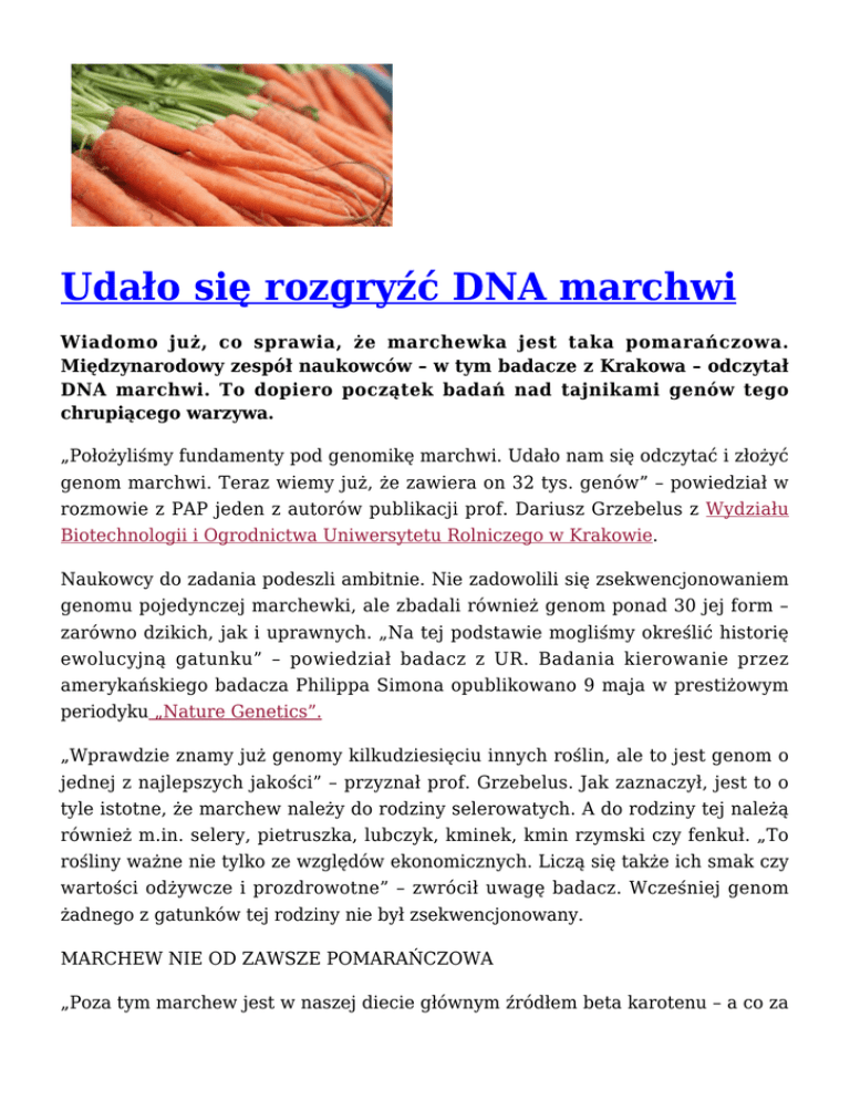 Udało się rozgryźć DNA marchwi Wiadomo już, co sprawia, że marchewka jest taka pomarańczowa. Międzynarodowy zespół naukowców – w tym badacze z Krakowa – odczytał DNA marchwi. To dopiero początek badań nad tajnikami genów tego chrupiącego warzywa. „Położyliśmy fundamenty pod genomikę marchwi. Udało nam się odczytać i złożyć genom marchwi. Teraz wiemy już, że zawiera on 32 tys. genów” – powiedział w rozmowie z PAP jeden z autorów publikacji prof. Dariusz Grzebelus z Wydziału Biotechnologii i Ogrodnictwa Uniwersytetu Rolniczego w Krakowie. Naukowcy do zadania podeszli ambitnie. Nie zadowolili się zsekwencjonowaniem genomu pojedynczej marchewki, ale zbadali również genom ponad 30 jej form – zarówno dzikich, jak i uprawnych. „Na tej podstawie mogliśmy określić historię ewolucyjną gatunku” – powiedział badacz z UR. Badania kierowanie przez amerykańskiego badacza Philippa Simona opublikowano 9 maja w prestiżowym periodyku „Nature Genetics”. „Wprawdzie znamy już genomy kilkudziesięciu innych roślin, ale to jest genom o jednej z najlepszych jakości” – przyznał prof. Grzebelus. Jak zaznaczył, jest to o tyle istotne, że marchew należy do rodziny selerowatych. A do rodziny tej należą również m.in. selery, pietruszka, lubczyk, kminek, kmin rzymski czy fenkuł. „To rośliny ważne nie tylko ze względów ekonomicznych. Liczą się także ich smak czy wartości odżywcze i prozdrowotne” – zwrócił uwagę badacz. Wcześniej genom żadnego z gatunków tej rodziny nie był zsekwencjonowany. MARCHEW NIE OD ZAWSZE POMARAŃCZOWA „Poza tym marchew jest w naszej diecie głównym źródłem beta karotenu – a co za tym idzie – witaminy A, która jest ważna dla naszego zdrowia. Podstawowym pytaniem było to, jak w roślinie wyewoluowała zdolność akumulacji tego pomarańczowego barwnika” – opowiedział naukowiec. Jak podkreślił, w publikacji w „Nature Genetics” wyjaśniono genetyczny mechanizm, który sprawił, że marchew gromadzi barwniki karotenoidowe w korzeniach. „A przecież zdolność ta wcale nie jest obecna u dzikich przodków marchwi jadalnych” – zwrócił uwagę naukowiec. Jak przyznał, marchwie, które kupujemy dziś w sklepach, to tak naprawdę organizmy zmodyfikowane genetycznie. „Pomarańczowa barwa tych warzyw pojawiła się dopiero ok. XV-XVI wieku. Wcześniej korzenie tej rośliny były zwykle żółte albo purpurowe” – opowiedział prof. Grzebelus. Jak wyjaśnił badacz z UR, wiele wskazuje na to, że marchew została udomowiona ok. 5 tys. lat temu w Azji Centralnej. „Ciągle jednak nie wiemy, jak doszło do wytworzenia w marchwi cechy umożliwiającej formowanie jadalnego korzenia spichrzowego. Dzika marchew ma bowiem jedynie włóknisty korzeń palowy” – uznaje badacz i stwierdza, że zsekwencjonowanie genomu marchwi ułatwi takie badania. Odczytano DNA marchwi Źródło Wikimedia Commons, licencja CC0 BIOINFORMATYCZNE PUZZLE Jednym z zadań Polaków w projekcie było sprawdzenie metodami cytogenetycznymi (pod mikroskopem), czy poszczególne fragmenty DNA zostały poprawnie – dzięki bioinformatyce – połączone w coraz większe całości i przyporządkowane do właściwych chromosomów. Genom marchwi składa się z 473 mln par nukleotydów (podstawowych cegiełek tworzących DNA). Trzeba było je ułożyć we właściwym porządku, dysponując krótkimi fragmentami liczącymi zaledwie ok. 100 par nukleotydów. Prace trwały aż cztery lata. Zespół z UR w kolejnych badaniach chce teraz odpowiedzieć na pytanie, z czego wynika kształt korzenia marchwi. „Są różne typy korzenia marchwi: niektóre są cylindryczne, inne – stożkowate, a w starszych odmianach bywają i korzenie okrągłe, podobne do rzodkiewki. Chcemy sprawdzić, jak kształt ten ewoluował” – mówi Grzebelus. Naukowcy chcieliby też sprawdzić, jakie geny odpowiadają za odporność rośliny na niekorzystne warunki środowiska – np. niedobór wody czy nadmierne zasolenie gleby. Źródło: www.naukawpolsce.pap.pl Data publikacji: 13.05.2016r.