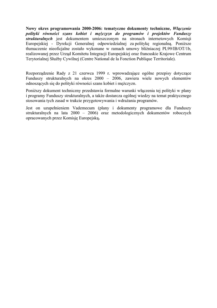 Nowy okres programowania 2000-2006: tematyczne dokumenty techniczne, Włączenie polityki równości szans kobiet i mężczyzn do programów i projektów Funduszy strukturalnych jest dokumentem umieszczonym na stronach internetowych Komisji Europejskiej - Dyrekcji Generalnej odpowiedzialnej za politykę regionalną. Poniższe tłumaczenie nieoficjalne zostało wykonane w ramach umowy bliźniaczej PL99/IB/OT/1b, realizowanej przez Urząd Komitetu Integracji Europejskiej oraz francuskie Krajowe Centrum Terytorialnej Służby Cywilnej (Centre National de la Fonction Publique Territoriale). Rozporządzenie Rady z 21 czerwca 1999 r. wprowadzające ogólne przepisy dotyczące Funduszy strukturalnych na okres 2000 – 2006, zawiera wiele nowych elementów odnoszących się do polityki równości szans kobiet i mężczyzn. Poniższy dokument techniczny przedstawia formalne warunki włączenia tej polityki w plany i programy Funduszy strukturalnych, a także dostarcza ogólnej wiedzy na temat praktycznego stosowania tych zasad w trakcie przygotowywania i wdrażania programów. Jest on uzupełnieniem Vademecum (plany i dokumenty programowe dla Funduszy strukturalnych na lata 2000 – 2006) oraz metodologicznych dokumentów roboczych opracowanych przez Komisję Europejską. Nowy okres programowania 2000-2006: tematyczne dokumenty techniczne DOKUMENT TECHNICZNY NR 3 Włączenie polityki równości szans kobiet i mężczyzn do programów i projektów Funduszy strukturalnych Marzec 2000 1 Spis treści 1. LISTA KONTROLNA DOTYCZĄCA WŁĄCZENIA KWESTII RÓWNOŚCI SZANS DO PLANÓW I PROGRAMÓW FUNDUSZY STRUKTURALNYCH...................................................................................... 3 2. WŁĄCZENIE KWESTII RÓWNOŚCI SZANS DO FUNDUSZY STRUKTURALNYCH 2000 - 2006.. 5 2.1. CEL DOKUMENTU ......................................................................................................................................... 5 2.2. WŁĄCZENIE RÓWNOŚCI SZANS: ZOBOWIĄZANIE ZAPISANE W TRAKTACIE ................................................... 5 2.3. WKŁAD RÓWNOŚCI SZANS DO CELÓW FUNDUSZY STRUKTURALNYCH ......................................................... 6 3. WKŁAD FUNDUSZY STRUKTURALNYCH W WYRÓWNYWANIE SZANS KOBIET I MĘŻCZYZN ......................................................................................................................................................... 7 3.1 DEFINIOWANIE CELÓW W DZIEDZINIE RÓWNOŚCI SZANS ............................................................................... 7 3.2 PRZEDSTAWIENIE WKŁADU PROGRAMÓW FUNDUSZY STRUKTURALNYCH W POLITYKĘ NA RZECZ RÓWNOŚCI SZANS.................................................................................................................................................................. 9 4. WŁĄCZANIE RÓWNOŚCI SZANS W OPRACOWYWANIE PLANÓW I DOKUMENTÓW PROGRAMOWANIA ........................................................................................................................................ 11 4.1 INFORMACJE, KTÓRE NALEŻY ZAWRZEĆ W PLANACH WSPÓLNOTOWYCH RAM WSPARCIA ORAZ JEDNOLITYCH DOKUMENTACH PROGRAMOWYCH ............................................................................................ 11 4.2 EWALUACJA EX-ANTE RÓWNOŚCI SZANS KOBIET I MĘŻCZYZN .................................................................... 13 4.3 INFORMACJE O RÓWNOŚCI SZANS DO WŁĄCZENIA DO PROPOZYCJI PROGRAMU OPERACYJNEGO ................ 15 4.4 INFORMACJE O RÓWNOŚCI SZANS DO WŁĄCZENIA DO UZUPEŁNIAJĄCEGO DOKUMENTU PROGRAMOWEGO 16 4.5 OCENA OCZEKIWANEGO ODDZIAŁYWANIA PLANU ALBO PROGRAMU .......................................................... 16 5. ZARZĄDZANIE PROGRAMAMI MAJĄCYMI NA CELU ZAPEWNIENIE RÓWNOŚCI SZANS DLA MĘŻCZYZN I KOBIET........................................................................................................................... 18 5.1 STWORZENIE ZRÓWNOWAŻONEGO I KOMPETENTNEGO PARTNERSTWA ....................................................... 18 5.2 KLASYFIKACJA I WYBÓR PROJEKTÓW MAJĄCYCH NA CELU ZAPEWNIENIE RÓWNOŚCI SZANS ...................... 19 5.3 MONITOROWANIE I EWALUACJA ................................................................................................................. 24 5.4 INFORMACJA I PROMOCJA ............................................................................................................................ 27 ANEKS 1: GLOSARIUSZ ................................................................................................................................. 29 2 1. LISTA KONTROLNA DOTYCZĄCA WŁĄCZENIA KWESTII RÓWNOŚCI SZANS DO PLANÓW I PROGRAMÓW FUNDUSZY STRUKTURALNYCH Poniższa lista podsumowuje podstawowe wymagania dotyczące włączenia polityki równości szans kobiet i mężczyzn do europejskich funduszy strukturalnych. Może ona zostać użyta do sprawdzenia, czy plany i programy respektują rozwiązania zawarte w rozporządzeniu1 i czy zawierają podstawowe elementy, których celem jest wsparcie włączenia polityki równości szans do wdrażania pomocy. Wymagania, jakie należy spełnić: 1. Istnieje wyraźne odniesienie do założeń, że pomoc finansowana przez fundusze ma się przyczyniać się do eliminowania nierówności i promowania równego traktowania kobiet i mężczyzn (art. 1, ust. 2 i art. 12) 2. Istnieje wyraźne wskazanie, że operacje funduszy będą spójne z innego rodzaju politykami i działaniami wspólnotowymi w dziedzinie równego traktowania kobiet i mężczyzn (artykuł 2, ust. 5) 3. Przewidziane są globalne skwantyfikowane cele na rzecz zmniejszenia nierówności i promowania równego traktowania kobiet i mężczyzn w podstawach wsparcia wspólnoty i/lub w jednolitym dokumencie programowym (artykuły 16, ust. 1; art. 17, ust.2, art. 18, ust. 2 i art. 19, ust.3). 4. W przypadku planów i ram odniesienia dla zasobów ludzkich dla Celu 3 są one wyraźnie spójn