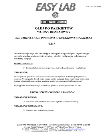 Réf. 3/0218/03/14 PL FICHE TECHNIQUE E OLEJ DO PARKIETÓW WODNY BEZBARWNY NIE ZMIENIA I NIE POCIEMNIA POSTARZONEGO DREWNA 0218 Oleista emulsja oleju nie zawierająca żadnego lotnego związku organicznego, pozwala uzyskać wykończenie wysokiej jakości, zachowując jednocześnie naturalny wygląd. PRZYGOTOWANIE: ! Postarzałe lub nie drewno powinno być suche, odkurzone i wygładzone. NAKŁADANIE: Do wszystkich gatunków drewna stosowanych we wnętrzach. Nakładać jedną lub dwie warstwy. W przypadku dwóch warst ważne jest by nakładać drugą warstwę na poprzednią jeszcze wilgotną (druga warstwa nałożona na pierwszą suchą może źle przylegać). W przypadku drewna twardego rozcieńczyć pierwszą warstwę w wodzie do 10% PRZED UŻYCIEM DOBRZE WYMIESZAC NAKŁADANIE RĘCZNE: ! Nakładać wałkiem lub natryskowo regularne, cienkie warstwy NAKŁADANIE PRZEMSŁOWE: ! Nanosić wałkiem lub natryskowo LES BONS PRODUITS St ANTOINE - ANCIENNE PROVENCE - EUROWOOD LASURE 21, rue André Chénier 69120 Vaulx en Velin (Grand Lyon) - France Tel. 33 (0) 4 72 35 16 27 - Fax. 33 (0) 4 78 54 53 71 - E-Mail : [email protected] Internet : www.easylabfinish.com - RCS LYON B 349 783 712 00046 - NAF : 245 C Réf. 3/0218/03/14 PL FICHE TECHNIQUE E WYKOŃCZENIE: ! Po wyschnięciu można przeciągnąć BIAŁYM PADEM, nada to drewnu połysk. CZYSZCZENIE NARZĘDZI: wodą ZUŻYCIE: 1 litr na 8 do 10m2 w zależności od porowatości drewna. OPAKOWANIA: 1L – 5L – 30L i więcej ŚRODKI OSTROŻNOŚCI Pracować w dobrze wentylowanym pomieszczeniu Pracować w gumowych rękawicach Nie połykać Nie pozostawiać w zasięgu dzieci Informacje udzielone w dobrej wierze, nie pociągają za sobą odpowiedzialności LES BONS PRODUITS St ANTOINE - ANCIENNE PROVENCE - EUROWOOD LASURE 21, rue André Chénier 69120 Vaulx en Velin (Grand Lyon) - France Tel. 33 (0) 4 72 35 16 27 - Fax. 33 (0) 4 78 54 53 71 - E-Mail : [email protected] Internet : www.easylabfinish.com - RCS LYON B 349 783 712 00046 - NAF : 245 C