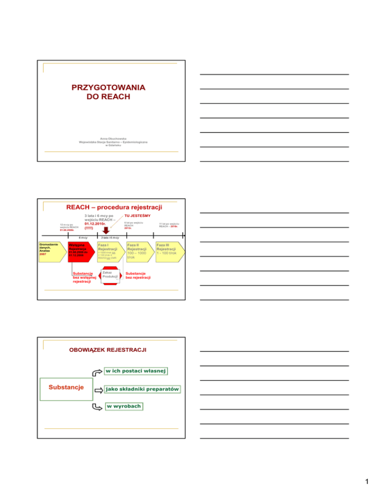 PRZYGOTOWANIA DO REACH Anna Obuchowska Wojewódzka Stacja Sanitarno – Epidemiologiczna w Gdańsku REACH – procedura rejestracji 3 lata i 6 mcy po wejściu REACH – 01.12.2010r. (!!!!!) 12 m-cy po wejściu REACH 01.06.2008r. 6 m-cy Gromadzenie danych, Analiza 2007 Wstępna Rejestracja 01.06.2008 do 01.12.2008 Substancje bez wstępnej rejestracji TU JESTEŚMY 6 lat po wejściu REACH 2013r. 11 lat po wejściu REACH – 2018r. 3 lata i 6 m-cy Faza I Rejestracji > 1000 t/rok lub > 100 t/rok + R50/53 lub CMR Zakaz Produkcji Faza II Rejestracji 100 – 1000 t/rok Faza III Rejestracji 1 - 100 t/rok Substancje bez rejestracji OBOWIĄZEK REJESTRACJI w ich postaci własnej Substancje jako składniki preparatów w wyrobach 1 FILOZOFIA SYSTEMU REACH w nowym systemie analizujemy produkt - jego skład chemiczny lub surowce które są bazą do jego produkcji zrozumienie zmian i nowych zasad ułatwi wdrożenie procedur wymaganych w rozporządzeniu REACH należy już teraz rozpocząć przygotowanie zmian organizacyjnych w firmie oraz wdrożyć system ułatwiający generowanie danych, niezbędnych do rejestracji konkretnych substancji REJESTRACJA konsekwencja wejścia w życie REACH – substancje nie będą mogły być produkowane lub importowane w ilości powyżej 1 tony rocznie, jeżeli ich producenci lub importerzy nie przedłożą kompletnej rejestracji substancji w Europejskiej Agencji Chemicznej zasada określona w art. 5 REACH – Brak danych = brak obrotu konsekwencją nie dokonania rejestracji wstępnej zgodnie z art. 28 pkt. 1, jest brak uzyskania prawa do okresów przejściowych (art. 23) (3,5; 6; 11 lat) dla substancji już produkowanych i w konsekwencji wycofanie tych substancji z rynku KOGO DOTYCZY REACH producentów substancji w UE importerów chemikaliów spoza UE (substancje, preparaty, wyroby) dalszych użytkowników chemikaliów (DU) dystrybutorów chemikaliów 2 PLAN WDROŻENIA REACH W UE Przygotowania na poziomie przedsiębiorstwa rejestracja wstępna substancji chemicznych w postaci własnej, w preparatach, w wyrobach utworzenie SIEF (Forum Wymiany Informacji o Substancji Chemicznej) zbieranie wymaganych informacji przygotowywania do rejestracji właściwej przekazanie dokumentów rejestracyjnych do Europejskiej Agencji Chemicznej uaktualnianie danych po rejestracji (!!!!!), zwłaszcza tych dotyczących tonażu Co należy wiedzieć przed rejestracją? Należy określić status firmy zgodnie REACH producent substancji producent preparatu producent wyrobu importer substancji importer preparatu importer wyrobu Jedna firma - w rozumieniu REACH może być jednocześnie P-I-DU Co należy wiedzieć przed rejestracją? rejestracja wstępna - czy należy jej dokonać? rejestracja właściwa – jaki termin (3,5 roku, 6, 11 lat)? ustalenie zakresu pakietu informacyjnego niezbędnego do dokonania rejestracji właściwej 3 INWENTARYZACJA PREPARATÓW CHEMICZNYCH Sporządzenie wykazu substancji chemicznych w postaci czystej i substancji w preparatach chemicznych/wyrobach, będących przedmiotem obrotu w firmie z podziałem na dostawców (z UE i z poza UE) z uwzględnieniem statusu dostawców - producent, importer, DU (!!!!!) Należy pamiętać, że łańcuch dostaw działa w „górę i w dół” PRZYGOTOWANIA NA POZIOMIE PRZEDSIĘBIORSTWA analiza substancji wchodzących w skład produktów po analizie - określenie potencjalnych obowiązków w REACH wobec tych substancji przeprowadzenie analizy jaki wpływ będzie miał REACH na firmę w łańcuchu dostaw określenie przyszłych działań w firmie IDENTYFIKACJA SUBSTANCJI nazwa substancji (zgodnie nomenklaturą IUPAC - Międzynarodowej Unii Chemii Czystej i Stosowanej wg nazwa preparatu, w którym znajduje się substancja identyfikacja substancji (CAS, EINECS, ELINCS, NLP „no-longer polymer”, nr indeksowy) Klasyfikacja klasyfikacja oparta na klasyfikacji urzędowej, od 1 grudnia 2010 roku obowiązuje dla substancji klasyfikacja zgodna z CLP (!!!!!) jeżeli klasyfikacja oparta na informacji z innych baz danych – należy wskazać źródła stężenia graniczne dla substancji w preparatach (bardzo ważne!!) 4 IDENTYFIKACJA SUBSTANCJI sprawdzenie czy dana substancja znajduje się w załącznikach IV, V wskazanie innych inwentarzy, w których może znajdować się substancja (np. zał. 1, 2, 3 Rozp. WE 2032/2003 i 1048/2005 dot. Substancji czynnych dla produtów biobójczych) określenie obrotu rocznego preparatu – „rocznie” obecnie przyjęto „średnia z trzech lat” wyliczenie tonażu rocznego dla danej substancji (< od 1 tony – nie podlega rejestracji) wstępne określenie terminów rejestracji DZIAŁANIA PO PRZEPROWADZONEJ ANALIZIE wytypowanie substancji w ilości mniejszej od 1 tony – brak rejestracji producent preparatów - może dokonać zmian w recepturach wycofanie z produkcji substancji/preparatu z powodu „kłopotliwego” składnika (koszty w przypadku substancji unikatowej) – (konsekwencje dla firmy - gdy to jest preparat stosowany technologii firmy – brak dostaw) decyzja o zmniejszeniu produkcji, tak aby produkcja substancji która podlega rejestracji nie przekraczała 1 tony zmiana dostawcy (w przypadku dostawcy spoza UE) monitorowanie łańcucha dostaw określenie krytycznych punktów w firmie, gdzie REACH może okazać się problemem Gdzie REACH „dotknie” nas jako firmę? OSOBA ODPOWIEDZIALNA ZA WDRAŻANIE REACH Wyznaczenie w firmie osoby lub zespołu osób odpowiedzialnych za wdrożenie REACH Wyznaczona osoba/zespół gromadzi wiedzę o REACH uczestniczy w szkoleniach/szkoli pracowników firmy monitoruje stan magazynowy produktów, które będą podlegały obowiązkowi rejestracji 5 DZIAŁANIA PO REJESTRACJI WSTĘPNEJ Po zakończeniu rejestracji wstępnej Agencja opublikowała na swojej stronie internetowej listę tych, którzy dokonali rejestracji wstępnej od stycznia 2009 rozpoczęły działania Fora SIEF (Fora Wymiany Informacji o Substancji Chemicznej) wszyscy, którzy dokonali rejestracji wstęp