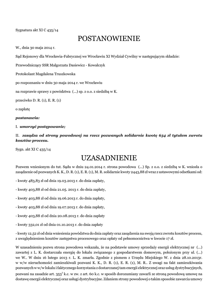 Sygnatura akt XI C 435/14 POSTANOWIENIE W., dnia 30 maja 2014 r. Sąd Rejonowy dla Wrocławia-Fabrycznej we Wrocławiu XI Wydział Cywilny w następującym składzie: Przewodniczący SSR Małgorzata Dasiewicz - Kowalczyk Protokolant Magdalena Truszkowska po rozpoznaniu w dniu 30 maja 2014 r. we Wrocławiu na rozprawie sprawy z powództwa (...) sp. z o.o. z siedzibą w K. przeciwko D. R. (1), E. R. (1) o zapłatę postanawia: I. umorzyć postępowanie; II. zasądza od strony powodowej na rzecz pozwanych solidarnie kwotę 634 zł tytułem zwrotu kosztów procesu. Sygn. akt XI C 435/14 UZASADNIENIE Pozwem wniesionym do tut. Sądu w dniu 24.01.2014 r. strona powodowa (...) Sp. z o.o. z siedzibą w K. wniosła o zasądzenie od pozwanych K. K., D. R. (1), E. R. (1), M. R. solidarnie kwoty 2443,88 zł wraz z ustawowymi odsetkami od: - kwoty 483,83 zł od dnia 19.03.2013 r. do dnia zapłaty, - kwoty 403,88 zł od dnia 21.05. 2013 r. do dnia zapłaty, - kwoty 403,88 zł od dnia 19.06.2013 r. do dnia zapłaty, - kwoty 403,88 zł od dnia 19.07.2013 r. do dnia zapłaty, - kwoty 403,88 zł od dnia 20.08.2013 r. do dnia zapłaty - kwoty 332,01 zł od dnia 01.10.2013 r. do dnia zapłaty - kwoty 12,52 zł od dnia wniesienia powództwa do dnia zapłaty oraz zasądzenia na swoją rzecz zwrotu kosztów procesu, z uwzględnieniem kosztów zastępstwa procesowego oraz opłaty od pełnomocnictwa w kwocie 17 zł. W uzasadnieniu pozwu strona powodowa wskazała, że na podstawie umowy sprzedaży energii elektrycznej nr (...) zawartej z L. K. dostarczała energię do lokalu związanego z gospodarstwem domowym, położonym przy ul. (...) we W.. W dniu 16 lutego 2013 r. L. K. zmarła. Zgodnie z pismem z Urzędu Miejskiego W. z dnia 28.10.2013r. w w/w nieruchomości zamieszkiwali pozwani K. K., D. R. (1), E. R. (1), M. R.. Z uwagi na fakt zamieszkiwania pozwanych w w/w lokalu i faktycznego korzystania z dostarczanej tam energii elektrycznej oraz usług dystrybucyjnych, pozwani na zasadzie art. 3531 k.c. w zw. z art. 60 k.c. w sposób dorozumiany zawarli ze stroną powodową umowę na dostawę energii elektrycznej oraz usługi dystrybucyjne. Zdaniem strony powodowej o takim sposobie zawarcia umowy świadczy fakt, iż pozwani przez długi okres korzystali ze świadczonych przez stronę powodową usług w postaci dostawy energii elektrycznej oraz usług dystrybucyjnych. Pozwani nie kwestionowali istnienia zobowiązania wobec powoda zarówno co do zasady, jak i co do wysokości. Strona powodowa pismami z dnia 13.11.2013 r. wzywała pozwanych do zapłaty wynikających z poszczególnych faktur VAT należności z tytułu dostarczanej energii elektrycznej, wyznaczając im dodatkowy 7 dniowy termin do zapłaty w dniu 19.11.2013 r., jednakże bezskutecznie. Pozwani do dnia sporządzenia pozwu nie uregulowali dochodzonych pozwem należności. W dniu 04.02.2014 r. Sąd Rejonowy dla Wrocławia - Fabrycznej we Wrocławiu XI Wydział Cywilny nakazem zapłaty w postępowaniu upominawczym na skutek pozwu wniesionego przez stronę powodową (...) Sp. z o.o. w K. orzekł, że pozwani K. K., D. R. (2), E. R. (1), M. R. w ciągu dwóch tygodni od daty doręczenia niniejszego nakazu powinni zapłacić stronie powodowej kwotę 2443,88 zł wraz z odsetkami ustawowymi liczonymi: - kwoty 483,83 zł od dnia 19.03.2013 r. do dnia zapłaty, - kwoty 403,88 zł od dnia 21.05. 2013 r. do dnia zapłaty, - kwoty 403,88 zł od dnia 19.06.2013 r. do dnia zapłaty, - kwoty 403,88 zł od dnia 19.07.2013 r. do dnia zapłaty, - kwoty 403,88 zł od dnia 20.08.2013 r. do dnia zapłaty, - kwoty 332,01 zł od dnia 01.10.2013 r. do dnia zapłaty, - kwoty 12,52 zł od dnia 24 stycznia 2014 r. do dnia zapłaty oraz kwotę 642,00 zł tytułem zwrotu kosztów procesu, w tym kwotę 600 zł tytułem zwrotu kosztów zastępstwa procesowego i kwotę 17,00 zł tytułem opłaty skarbowej od pełnomocnictwa procesowego albo wnieść w tymże terminie do tutejszego Sądu sprzeciw. Pozwani K. K. oraz E. R. (1) nie odebrali przesyłki zawierającej w/w nakaz oraz odpis pozwu, skutkiem czego uznano je za doręczone: wobec K. K. z dniem 28.02.2014r., wobec E. R. (1) z dniem 28.02.2014r. (k.72, 73). Pozwany D. R. (1) w dniu 28.02.2014 r. za pośrednictwem pełnomocnika procesowego w osobie radcy prawnego J. G. wniósł sprzeciw od nakazu zapłaty z dnia 04.02.2014r. W jego uzasadnieniu wskazano, że pozwany nigdy nie był stroną umowy z powódką, gdyż nie zamieszkiwał w przedmiotowym lokalu mieszkalnym w okresie objętym żądaniem pozwu. Zaprzeczył również, by zawarł z powódką umowę na dostawę energii w sposób dorozumiany. Pozwany podał, że od czerwca 2012 r. zamieszkuje na stałe przy ul. (...) we W. i od tamtego czasu do chwili obecnej nie zamieszkiwał ani nie przebywał w lokalu mieszkalnym przy ul. (...) we W.. Ponadto pozwany podniósł zarzut nieistnienia względem pozwanego, stanowiącej przedmiot żądania pozwu wierzytelności powoda z uwagi na niezaistnienie materialnoprawnej podstawy powstania tej wierzytelności. Ponadto pozwany D. R. (1) wniósł o zasądzenie na swoją rzecz kosztów procesu w wysokości 617,00 zł w tym kosztów zastępstwa procesowego w kwocie 600,00 zł oraz kosztów opłaty skarbowej od pełnomocnictwa w kwocie 17,00 zł. Pozwana E. R. (1) w dniu 28.02.2014 r. za pośrednictwem pełnomocnika procesowego w osobie radcy prawnego J. G. wniosła sprzeciw od nakazu zapłaty z dnia 04.02.2014r. o treści tożsamej, jak pozwany D. R. (1), a ponadto wniosła o zasądzenie na swoją rzecz kosztów procesu w wysokości 617,00 zł w tym kosztów zastępstwa procesowego w kwocie 600,00 zł oraz kosztów opłaty skarbowej od pełnomocnictwa w kwocie 17,00 zł. Pismem wniesionym do tut. Sądu w dniu 05.05.2014 r. strona powodowa podała, że w odpowiedzi na pismo z dnia 18 kwietnia 2014 r. z uwagi na omyłkowe skierowanie powództwa przeciwko D. R. (1) i E. R. (1) cofa powództwo w stosunku do w/w pozwanych wraz ze zrzeczeniem się roszcze