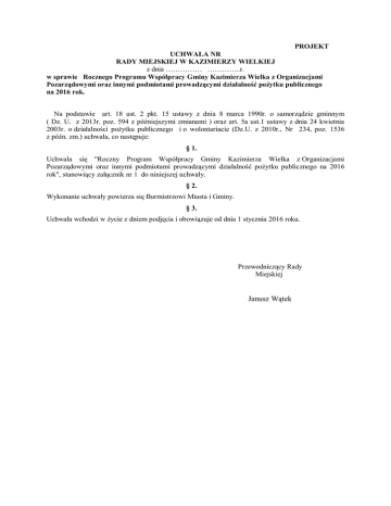 PROJEKT UCHWAŁA NR RADY MIEJSKIEJ W KAZIMIERZY WIELKIEJ z dnia …………… …………..r. w sprawie Rocznego Programu Współpracy Gminy Kazimierza Wielka z Organizacjami Pozarządowymi oraz innymi podmiotami prowadzącymi działalność pożytku publicznego na 2016 rok. Na podstawie art. 18 ust. 2 pkt. 15 ustawy z dnia 8 marca 1990r. o samorządzie gminnym ( Dz. U. z 2013r. poz. 594 z późniejszymi zmianami ) oraz art. 5a ust.1 ustawy z dnia 24 kwietnia 2003r. o działalności pożytku publicznego i o wolontariacie (Dz.U. z 2010r., Nr 234, poz. 1536 z późn. zm.) uchwala, co następuje: § 1. Uchwala się "Roczny Program Współpracy Gminy Kazimierza Wielka z Organizacjami Pozarządowymi oraz innymi podmiotami prowadzącymi działalność pożytku publicznego na 2016 rok", stanowiący załącznik nr 1 do niniejszej uchwały. § 2. Wykonanie uchwały powierza się Burmistrzowi Miasta i Gminy. § 3. Uchwała wchodzi w życie z dniem podjęcia i obowiązuje od dnia 1 stycznia 2016 roku. Przewodniczący Rady Miejskiej Janusz Wątek UZASADNIENIE DO PROJEKTU UCHWAŁY RADY MIEJSKIEJ W KAZIMIERZY WIELKIEJ w sprawie Rocznego Programu Współpracy Gminy Kazimierza Wielka z Organizacjami Pozarządowymi oraz innymi podmiotami prowadzącymi działalność pożytku publicznego na 2016 rok. Organy administracji publicznej prowadzą działalność w sferze zadań publicznych we współpracy z organizacjami pozarządowymi oraz podmiotami wymienionymi w art. 3 ust. 3. Współpraca odbywa się m.in w formie zlecania organizacjom pozarządowym oraz podmiotom wymienionym w art. 3 ust. 3 realizacji zadań publicznych na zasadach określonych w ustawie W świetle z art. 5a ustawy o działalności pożytku publicznego i o wolontariacie, koniecznym jest podjęcie uchwały w sprawie Rocznego Programu Współpracy Gminy Kazimierza Wielka z Organizacjami Pozarządowymi oraz innymi podmiotami prowadzącymi działalność pożytku publicznego na 2016 rok. Zadania wskazane w projekcie uchwały mieszczą się w poszczególnych sferach działalności pożytku publicznego, wymienionych w art. 4 ust. 1 ustawy o działalności pożytku publicznego i o wolontariacie. Precyzyjne określenie wysokości środków na zadania realizowane w 2016 roku przez organizacje pożytku publicznego zostanie ustalone w uchwale budżetowej Rady Miejskiej w Kazimierzy Wielkiej na 2016 rok. Przyjmując do realizacji Roczny Program Współpracy z Organizacjami Pozarządowymi i innymi podmiotami, Miasto i Gmina deklaruje budowanie dialogu obywatelskiego, chęć umocnienia lokalnych działań, stworzenia warunków do powstawania inicjatyw i struktur funkcjonujących na rzecz społeczności lokalnej oraz wyraża chęć realizacji zadań ustawowych w ścisłym współdziałaniu z podmiotami III sektora. W związku z powyższym podjęcie wyżej wymienionej uchwały jest w pełni uzasadnione Załącznik nr 1 do Uchwały Nr ………………… Rady Miejskiej w Kazimierzy Wielkiej z dnia ………….. …………..r. Roczny Program Współpracy Gminy Kazimierza Wielka z Organizacjami Pozarządowymi oraz innymi podmiotami prowadzącymi działalność pożytku publicznego na 2016 rok. § 1. Przepisy ogólne 1. Ilekroć w Programie Współpracy Miasta Kazimierza Wielka z Organizacjami Pozarządowymi w roku 2016 mowa jest o: 1) ustawie- należy przez to rozumieć ustawę z dnia 24 kwietnia 2003 roku o działalności pożytku publicznego i o wolontariacie ( Dz. U. z 2010 r., Nr 234, poz.1536 z późn. zm.); 2) programie – należy przez to rozumieć Roczny Program Współpracy Gminy Kazimierza Wielka z Organizacjami Pozarządowymi oraz innymi podmiotami prowadzącymi działalność pożytku publicznego na 2016 rok; 3) Mieście – należy przez to rozumieć Miasto Kazimierza Wielka; 4) organizacjach pozarządowych – należy przez to rozumieć organizacje, osoby prawne i jednostki organizacyjne, o których mowa w art. 3 ust.2 i 3 ustawy; 5) organizacjach pożytku publicznego- należy przez to rozumieć organizacje, osoby prawne i jednostki organizacyjne, o których mowa w art. 20 ustawy. 2. Program określa cele, zasady, przedmiot, formy współpracy, zadania publiczne, okres realizacji, sposób realizacji i sposób oceny realizacji programu, informację o wysokości środków przeznaczonych na realizację programu, informację o sposobie tworzenia programu oraz o przebiegu konsultacji, a także tryb powoływania i zasady działania komisji konkursowych do opiniowania ofert w otwartych konkursach ofert. § 2. Cele Programu 1. Celem głównym programu jest zapewnienie efektywnego wykonywania zadań publicznych Gminy wynikających z przepisów prawa poprzez włączenie w ich realizację organizacji pozarządowych. 2. Cele szczegółowe programu wynikają z założonego celu głównego i są to: 1) umacnianie w świadomości społecznej poczucia odpowiedzialności za siebie, swoje otoczenie, wspólnotę lokalną oraz jej tradycje; 2) tworzenie warunków do zwiększenia aktywności społecznej, w szczególności wspieranie wolontariatu; 3) budowanie społeczeństwa obywatelskiego, poprzez aktywizację społeczności lokalnej; 4) prowadzenie nowatorskich i efektywnych działalna rzecz mieszkańców; 5) zwiększenie udziału mieszkańców w rozwiązywaniu lokalnych problemów; 6) poprawa jakości życia poprzez pełniejsze zaspokojenie potrzeb społecznych; 7) pobudzanie aktywności gospodarczej mieszkańców, kształtowanie postaw sprzyjających przedsiębiorczości; 8) tworzenie systemowych rozwiązań – ważnych dla funkcjonowania Gminy. § 3. Zasady współpracy 1. Współpraca Gminy z organizacjami pozarządowymi odbywa się na zasadach: pomocniczości, suwerenności stron, partnerstwa, efektywności, uczciwej konkurencji oraz jawności. 2. Zasada pomocniczości jest zasadą o charakterze ustrojowym. Wskazuje podział zadań między sektorem publicznym a obywatelskim, ukierunkowanych na umacnianie roli obywateli, ich wspólnot i organizacji