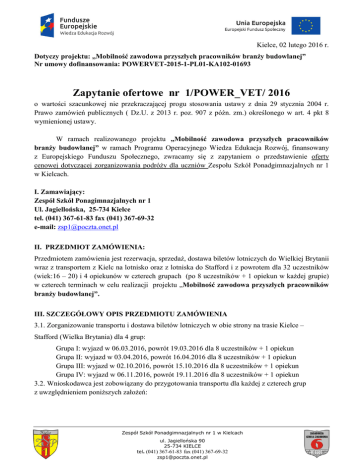 Kielce, 02 lutego 2016 r. Dotyczy projektu: „Mobilność zawodowa przyszłych pracowników branży budowlanej” Nr umowy dofinansowania: POWERVET-2015-1-PL01-KA102-01693 Zapytanie ofertowe nr 1/POWER_VET/ 2016 o wartości szacunkowej nie przekraczającej progu stosowania ustawy z dnia 29 stycznia 2004 r. Prawo zamówień publicznych ( Dz.U. z 2013 r. poz. 907 z późn. zm.) określonego w art. 4 pkt 8 wymienionej ustawy. W ramach realizowanego projektu „Mobilność zawodowa przyszłych pracowników branży budowlanej” w ramach Programu Operacyjnego Wiedza Edukacja Rozwój, finansowany z Europejskiego Funduszu Społecznego, zwracamy się z zapytaniem o przedstawienie oferty cenowej dotyczącej zorganizowania podróży dla uczniów Zespołu Szkół Ponadgimnazjalnych nr 1 w Kielcach. I. Zamawiający: Zespół Szkół Ponagimnazjalnych nr 1 Ul. Jagiellońska, 25-734 Kielce tel. (041) 367-61-83 fax (041) 367-69-32 e-mail: [email protected] II. PRZEDMIOT ZAMÓWIENIA: Przedmiotem zamówienia jest rezerwacja, sprzedaż, dostawa biletów lotniczych do Wielkiej Brytanii wraz z transportem z Kielc na lotnisko oraz z lotniska do Stafford i z powrotem dla 32 uczestników (wiek:16 – 20) i 4 opiekunów w czterech grupach (po 8 uczestników + 1 opiekun w każdej grupie) w czterech terminach w celu realizacji projektu „Mobilność zawodowa przyszłych pracowników branży budowlanej”. III. SZCZEGÓŁOWY OPIS PRZEDMIOTU ZAMÓWIENIA 3.1. Zorganizowanie transportu i dostawa biletów lotniczych w obie strony na trasie Kielce – Stafford (Wielka Brytania) dla 4 grup: Grupa I: wyjazd w 06.03.2016, powrót 19.03.2016 dla 8 uczestników + 1 opiekun Grupa II: wyjazd w 03.04.2016, powrót 16.04.2016 dla 8 uczestników + 1 opiekun Grupa III: wyjazd w 02.10.2016, powrót 15.10.2016 dla 8 uczestników + 1 opiekun Grupa IV: wyjazd w 06.11.2016, powrót 19.11.2016 dla 8 uczestników + 1 opiekun 3.2. Wnioskodawca jest zobowiązany do przygotowania transportu dla każdej z czterech grup z uwzględnieniem poniższych założeń: Zespół Szkół Ponadgimnazjalnych nr 1 w Kielcach ul. Jagiellońska 90 25-734 KIELCE tel. (041) 367-61-83 fax (041) 367-69-32 [email protected] a. Wyjazd obejmuje: - transport uczestników z Kielc, siedziba zamawiającego do portu lotniczego (środkiem komunikacji lądowej np.: autobus lub bus) - transport lotniczy do portu w Londynie, Wielka Brytania - transport z portu lotniczego w Londynie do Stafford (autobus lub bus) b. Powrót obejmuje: - transport uczestników z Stafford do portu lotniczego w Londynie (autobus lub bus) - transport lotniczy do Polski - transport z portu lotniczego do Kielc, siedziba zamawiającego (autobus lub bus) 3.3. Cena obejmuje łącznie wszystkie opłaty: - opłaty lotniskowe, - opłaty paliwowe itp., - opłaty bagażowe, - opłaty transferowe, - opłaty manipulacyjne. 3.4. Listy uczestników zostaną przekazana Wykonawcy na 14 dni przed wylotem każdej grupy. 3.5. Porty lotniczy w Polsce: Warszawa, Kraków lub Pyrzowice. 3.6. Porty lotnicze w Wielkiej Brytanii: Londyn (Stansted, Luton, Gatwick, Heathrow) 3.7. Każdy z uczestników może zabrać bagaż o wadze 25 kg (odprawiany + podręczny). IV. WARUNKI UDZIAŁU 4.1. Przygotowanie oferty: a. Cenę za przedmiot zamówienia Wykonawca przedstawia w formie formularza oferty stanowiącej załącznik 1 do niniejszego zapytania. b. Wszystkie ceny jednostkowe i wartości należy podać z dokładnością do dwóch miejsc po przecinku. c. Cena oferty musi być podana w walucie polskiej w kwocie brutto (tj. z uwzględnieniem wszelkich ewentualnych należności publicznoprawnych w państwie w którym będzie wykonywany transport) i wyliczona na jednego uczestnika, dla każdej grupy z osobna jak również wyliczona łącznie dla czterech grup. d. Wykonawca może zaproponować tylko jedną cenę i nie może jej zmienić po złożeniu oferty. Negocjacje co do ceny nie będą prowadzone. 4.2. Wszystkie koszty związane z realizacją niniejszego zamówienia powinny być wliczone w cenie oferty z uwzględnieniem kosztów dojazdu do miejsca odbywania praktyki/siedziby, z uwzględnieniem opłat wymaganych prawem krajowym i międzynarodowym, w szczególności opłaty lotniskowe, paliwowe, rezerwacyjne, podatkowe i ewentualnych upustów i rabatów. 4.3. Oferta zostanie uznana za spełniającą warunki, jeżeli będzie: a. zgodna w kwestii sposobu jej przygotowania, oferowanego przedmiotu i warunków zamówienia ze wszystkimi wymogami niniejszego zapytania b. złożona w wyznaczonym terminie składania ofert. 4.4. O zamówienie mogą ubiegać się Wykonawcy, którzy: a. złożą oświadczenie zgodnie z art. 22 ust. 1 ustawy o spełnieniu warunków podmiotowych Zespół Szkół Ponadgimnazjalnych nr 1 w Kielcach ul. Jagiellońska 90 25-734 KIELCE tel. (041) 367-61-83 fax (041) 367-69-32 [email protected] b. posiadają wiedzę i doświadczenia, na potwierdzenie należy złożyć wykaz wykonanych głównych usług w okresie ostatnich trzech lat przed upływem terminu składania ofert, a jeżeli okres prowadzenia działalności jest krótszy - w tym okresie, wraz z podaniem ich wartości, przedmiotu, dat wykonania i podmiotów, na rzecz których usługi zostały wykonane, oraz załączeniem dowodów, czy zostały wykonane należycie. Zamawiający uzna warunek za spełniony jeżeli Wykonawca wykaże, że wykonał: 2 usługi polegającymi na rezerwacji, sprzedaży, dostawie biletów lotniczych wraz z transportem na lotnisko dla min 30 osób. V. ORZUCENIE OFERT Z POSTĘPOWANIA 5.1. Z postępowania zostaje odrzucona oferta: a. jeżeli oferent nie spełnia warunków udziału w postępowaniu określonych w niniejszym zapytaniu ofertowym, b. jeżeli oferent nie złożył wyjaśnień dotyczących treści złożonych ofert bądź ich uzupełnień w wyznaczonym terminie, c. jeżeli oferta nie jest zgodna z treścią zapytania ofertowego, d. jeżeli w stosunku do oferenta otwarto postępowanie likwidacyjne lub ogłoszono upadłość, e. 