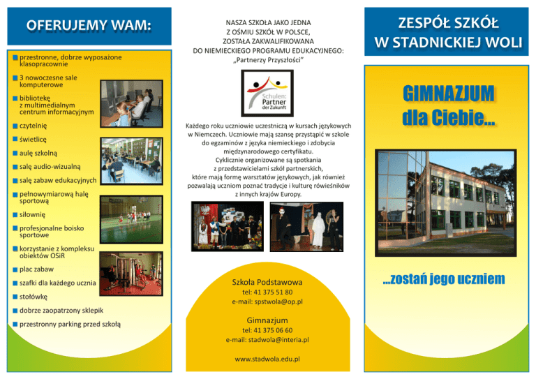 OFERUJEMY WAM: przestronne, dobrze wyposa¿one klasopracownie NASZA SZKO£A JAKO JEDNA Z OŒMIU SZKÓ£ W POLSCE, ZOSTA£A ZAKWALIFIKOWANA DO NIEMIECKIEGO PROGRAMU EDUKACYJNEGO: „Partnerzy Przysz³oœci” 3 nowoczesne sale komputerowe bibliotekê z multimedialnym centrum informacyjnym czytelniê œwietlicê aulê szkoln¹ salê audio-wizualn¹ salê zabaw edukacyjnych pe³nowymiarow¹ halê sportow¹ Ka¿dego roku uczniowie uczestnicz¹ w kursach jêzykowych w Niemczech. Uczniowie maj¹ szansê przyst¹piæ w szkole do egzaminów z jêzyka niemieckiego i zdobycia miêdzynarodowego certyfikatu. Cyklicznie organizowane s¹ spotkania z przedstawicielami szkó³ partnerskich, które maj¹ formê warsztatów jêzykowych, jak równie¿ pozwalaj¹ uczniom poznaæ tradycje i kulturê rówieœników z innych krajów Europy. ZESPÓ£ SZKÓ£ W STADNICKIEJ WOLI GIMNAZJUM dla Ciebie... si³owniê profesjonalne boisko sportowe korzystanie z kompleksu obiektów OSiR plac zabaw szafki dla ka¿dego ucznia Szko³a Podstawowa sto³ówkê tel: 41 375 51 80 e-mail: [email protected] dobrze zaopatrzony sklepik przestronny parking przed szko³¹ Gimnazjum tel: 41 375 06 60 e-mail: [email protected] www.stadwola.edu.pl ...zostañ jego uczniem SZKO£A TO NIE TYLKO NAUKA... Zespó³ Szkó³ w Stadnickiej Woli W szkole aktywnie prowadz¹ dzia³alnoœæ organizacje uczniowskie, m.in.: Klub Europejski, Szkolny Klub Fotograficzny, gazetka internetowa IntroSTW, zespó³ wokalno - instrumentalny, Szkolny Klub Sportowy, Klub 4H, Ko³o PCK, przedmiotowe ko³a zainteresowañ. dysponuje nowoczesnym obiektem o ciekawym projekcie architektonicznym. Budynek sk³ada siê z dwóch skrzyde³ po³¹czonych tzw. ³¹cznikiem socjalnym. Ka¿de ze skrzyde³ posiada osobne wejœcie. Skrzyd³o zachodnie zajmuje Szko³a Podstawowa, skrzyd³o po³udniowe Gimnazjum, ca³oœæ uzupe³nia hala sportowa. O wysokim poziomie kszta³cenia w naszej szkole œwiadcz¹ sukcesy osi¹gane przez naszych uczniów w konkursach przedmiotowych, artystycznych, w dziedzinie sportu, na szczeblu wojewódzkim i ogólnopolskim. NASZE MOCNE STRONY: Nowoczeœnie wyposa¿ona placówka Bezpieczne po³o¿enie szko³y Przyjazna atmosfera Ambitna, dobrze przygotowana kadra Cyklicznie organizowane s¹: ZAPEWNIAMY KSZTA£CENIE DOSTOSOWANE DO POTRZEB, ZAINTERESOWAÑ I MO¯LIWOŒCI UCZNIÓW zawody sportowe, dyskoteki, rajdy piesze i rowerowe, wycieczki po³¹czone z warsztatami edukacyjnymi, zimowiska, kolonie, przedstawienia teatralne, koncerty muzyczne, plenery fotograficzne.