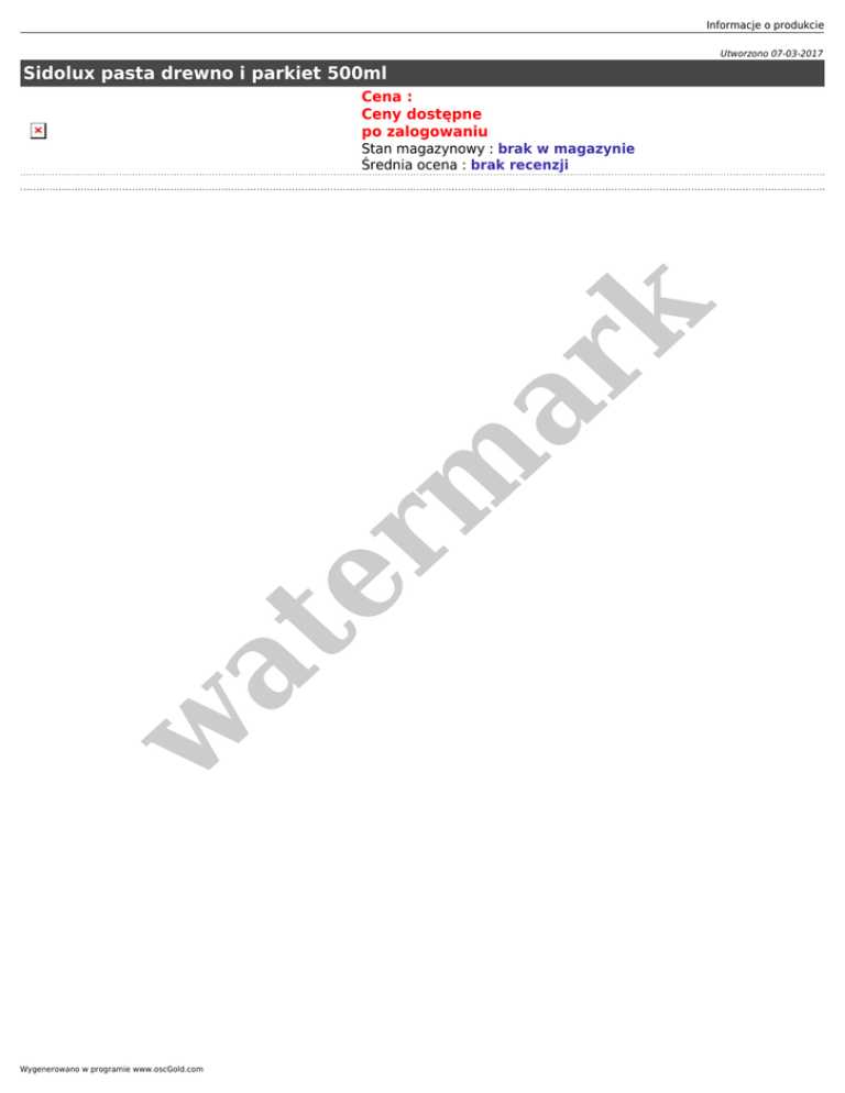 Informacje o produkcie Utworzono 07-03-2017 Sidolux pasta drewno i parkiet 500ml Cena : Ceny dostępne po zalogowaniu w at er m ar k Stan magazynowy : brak w magazynie Średnia ocena : brak recenzji Wygenerowano w programie www.oscGold.com