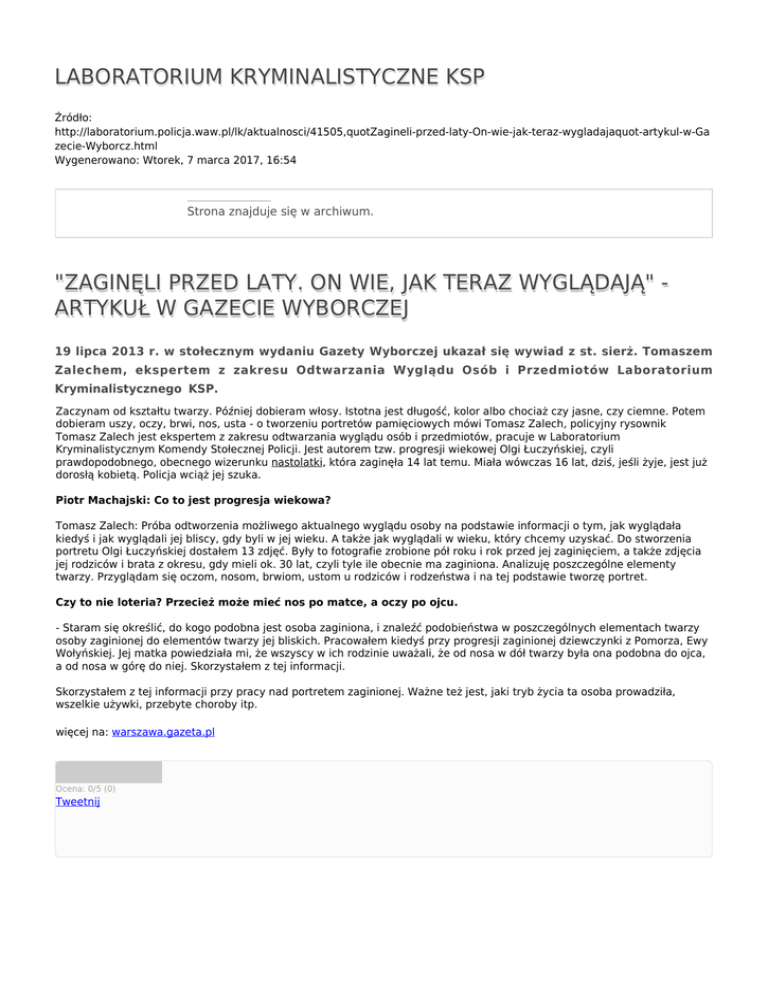 LABORATORIUM KRYMINALISTYCZNE KSP Źródło: http://laboratorium.policja.waw.pl/lk/aktualnosci/41505,quotZagineli-przed-laty-On-wie-jak-teraz-wygladajaquot-artykul-w-Ga zecie-Wyborcz.html Wygenerowano: Wtorek, 7 marca 2017, 16:54 Strona znajduje się w archiwum. "ZAGINĘLI PRZED LATY. ON WIE, JAK TERAZ WYGLĄDAJĄ" ARTYKUŁ W GAZECIE WYBORCZEJ 19 lipca 2013 r. w stołecznym wydaniu Gazety Wyborczej ukazał się wywiad z st. sierż. Tomaszem Zalechem, ekspertem z zakresu Odtwarzania Wyglądu Osób i Przedmiotów Laboratorium Kryminalistycznego KSP. Zaczynam od kształtu twarzy. Później dobieram włosy. Istotna jest długość, kolor albo chociaż czy jasne, czy ciemne. Potem dobieram uszy, oczy, brwi, nos, usta - o tworzeniu portretów pamięciowych mówi Tomasz Zalech, policyjny rysownik Tomasz Zalech jest ekspertem z zakresu odtwarzania wyglądu osób i przedmiotów, pracuje w Laboratorium Kryminalistycznym Komendy Stołecznej Policji. Jest autorem tzw. progresji wiekowej Olgi Łuczyńskiej, czyli prawdopodobnego, obecnego wizerunku nastolatki, która zaginęła 14 lat temu. Miała wówczas 16 lat, dziś, jeśli żyje, jest już dorosłą kobietą. Policja wciąż jej szuka. Piotr Machajski: Co to jest progresja wiekowa? Tomasz Zalech: Próba odtworzenia możliwego aktualnego wyglądu osoby na podstawie informacji o tym, jak wyglądała kiedyś i jak wyglądali jej bliscy, gdy byli w jej wieku. A także jak wyglądali w wieku, który chcemy uzyskać. Do stworzenia portretu Olgi Łuczyńskiej dostałem 13 zdjęć. Były to fotografie zrobione pół roku i rok przed jej zaginięciem, a także zdjęcia jej rodziców i brata z okresu, gdy mieli ok. 30 lat, czyli tyle ile obecnie ma zaginiona. Analizuję poszczególne elementy twarzy. Przyglądam się oczom, nosom, brwiom, ustom u rodziców i rodzeństwa i na tej podstawie tworzę portret. Czy to nie loteria? Przecież może mieć nos po matce, a oczy po ojcu. - Staram się określić, do kogo podobna jest osoba zaginiona, i znaleźć podobieństwa w poszczególnych elementach twarzy osoby zaginionej do elementów twarzy jej bliskich. Pracowałem kiedyś przy progresji zaginionej dziewczynki z Pomorza, Ewy Wołyńskiej. Jej matka powiedziała mi, że wszyscy w ich rodzinie uważali, że od nosa w dół twarzy była ona podobna do ojca, a od nosa w górę do niej. Skorzystałem z tej informacji. Skorzystałem z tej informacji przy pracy nad portretem zaginionej. Ważne też jest, jaki tryb życia ta osoba prowadziła, wszelkie używki, przebyte choroby itp. więcej na: warszawa.gazeta.pl Ocena: 0/5 (0) Tweetnij