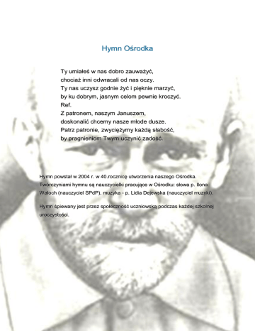 Hymn Ośrodka Ty umiałeś w nas dobro zauważyć, chociaż inni odwracali od nas oczy. Ty nas uczysz godnie żyć i pięknie marzyć, by ku dobr ym, jasn ym celom pewnie kroczyć. Ref. Z patronem, naszym Januszem, doskonalić chcemy nasze młode dusze. Patrz patronie, zwyciężym y każdą słabość, by pragnieniom Twym uczynić zadość. Hymn powstał w 2004 r. w 40.rocznicę utworzenia naszego Ośrodka. Twórczyniami hymnu są nauczycielki pracujące w Ośrodku: słowa p. Ilona W aloch (nauczyciel SPdP), muzyka - p. Lidia Dejewska (nauczyciel muzyki). Hymn śpiewany jest przez społeczność uczniowską podczas każdej szkolnej uroczystości.