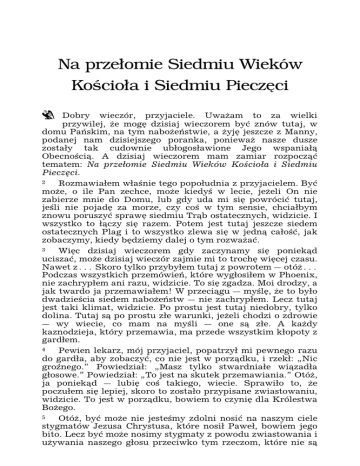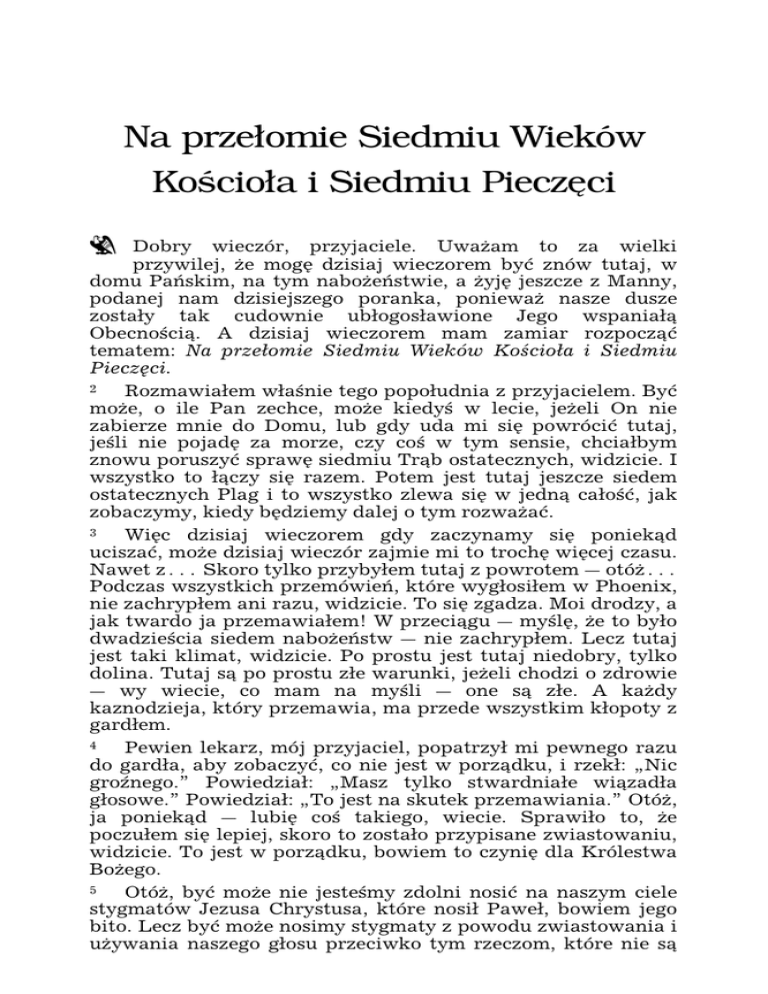 NA PRZE~OMIE SIEDMIU WIEKÓW KOCIO~A I SIEDMIU PIECZ£CI 65 Na przeomie Siedmiu Wieków Ko·cioa i Siedmiu Pieczci ` Dobry wieczór, przyjaciele. Uwaam to za wielki przywilej, e mog dzisiaj wieczorem byø znów tutaj, w domu Pa§skim, na tym naboe§stwie, a yj jeszcze z Manny, podanej nam dzisiejszego poranka, poniewa nasze dusze zostay tak cudownie ubogosawione Jego wspania Obecnoci. A dzisiaj wieczorem mam zamiar rozpoczø tematem: Na przeomie Siedmiu Wieków Kocioa i Siedmiu Pieczci. Rozmawiaem wanie tego popoudnia z przyjacielem. Byø moe, o ile Pan zechce, moe kiedy w lecie, jeeli On nie zabierze mnie do Domu, lub gdy uda mi si powróciø tutaj, jeli nie pojad za morze, czy co w tym sensie, chciabym znowu poruszyø spraw siedmiu Trb ostatecznych, widzicie. I wszystko to czy si razem. Potem jest tutaj jeszcze siedem ostatecznych Plag i to wszystko zlewa si w jedn caoø, jak zobaczymy, kiedy bdziemy dalej o tym rozwaaø. Wic dzisiaj wieczorem gdy zaczynamy si poniekd uciszaø, moe dzisiaj wieczór zajmie mi to troch wicej czasu. Nawet z^ Skoro tylko przybyem tutaj z powrotem _ otó^ Podczas wszystkich przemówie§, które wygosiem w Phoenix, nie zachrypem ani razu, widzicie. To si zgadza. Moi drodzy, a jak twardo ja przemawiaem! W przecigu _ myl, e to byo dwadziecia siedem naboe§stw _ nie zachrypem. Lecz tutaj jest taki klimat, widzicie. Po prostu jest tutaj niedobry, tylko dolina. Tutaj s po prostu ze warunki, jeeli chodzi o zdrowie _ wy wiecie, co mam na myli _ one s ze. A kady kaznodzieja, który przemawia, ma przede wszystkim kopoty z gardem. Pewien lekarz, mój przyjaciel, popatrzy mi pewnego razu do garda, aby zobaczyø, co nie jest w porzdku, i rzek: Nic gronego. Powiedzia: Masz tylko stwardniae wizada gosowe. Powiedzia: To jest na skutek przemawiania. Otó, ja poniekd _ lubi co takiego, wiecie. Sprawio to, e poczuem si lepiej, skoro to zostao przypisane zwiastowaniu, widzicie. To jest w porzdku, bowiem to czyni dla Królestwa Boego. Otó, byø moe nie jestemy zdolni nosiø na naszym ciele stygmatów Jezusa Chrystusa, które nosi Pawe, bowiem jego bito. Lecz byø moe nosimy stygmaty z powodu zwiastowania i uywania naszego gosu przeciwko tym rzeczom, które nie s 66 OBJAWIENIE SIEDMIU PIECZ£CI waciwe. Jestemy wic wdziczni, e ju wicej nie musimy byø bici; przynajmniej nie bylimy do tego czasu. Zatem, my jestemy^ Ilu z was tutaj czytao: Panowie, czy to jest znak ko§ca? Wzgldnie suchalicie tego, wiecie: Panowie, czy to jest znak ko§ca? Oto, co mnie dosyø martwio. Jeeli tego jeszcze nie suchalicie, pragn, abycie to jako zdobyli i mogli tego wysuchaø. Troch mnie to martwio. Chciaem po prostu powiedzieø o tym par sów przed rozpoczciem naboe§stwa. Moe tydzie§ lub dziesiø dni temu byem tak zaniepokojony, e po prostu nie^ Ja po prostu nie^ Nie podejmowaem si usugiwania czy czegokolwiek, poniewa ja _ ja tego nie wiedziaem. Wydawao si, e by to mogo byø co niedobrego, a ja po prostu nie wiedziaem, co to jest. Wic ja^ Obudziem si wic pewnego wczesnego poranka i udaem si do kanionu Sabino, przy czym z domu jest to tylko okoo trzydziestu, albo czterdziestu minut jazdy do wylotu kanionu Sabino, a potem jest tam droga, która biegnie trzydzieci mil w gb gór. Jest tam dziwna kraina. Mog byø na pustyni, gdzie jest w tej chwili 80°F do 90°F, a za trzydzieci minut mog byø na szczycie góry, gdzie jest osiem stóp niegu. Wanie niedawno bylimy w Phoenix, gdzie byo 20 i par, 28°F. Oni tam mieli ogrzewany basen kpielowy, ludzie pywali, a po mniej wicej czterdziestu minutach jazdy stamtd, w Flagstaf, byo 40°F poniej zera. Widzicie? Ta rónica powstaje na skutek prdów powietrza na wyynie i na pustyni. Jest tam bardzo zdrowo dla astmatyków, itp. Szedem wic tym kanionem i wspinaem si drog pod gór tak wysoko, jak tylko potrafiem iø, i pytaem si Pana, kiedy usiadem tam na górze, co to ma wszystko znaczyø, i tak dalej. Byem poniekd zakopotany i nie wiedziaem po prostu, co robiø. A wic, kiedy si modliem, wydarzya si dziwna rzecz. Pragn byø szczerym. Otó, ja mogem zasnø, mogem byø jak w transie, albo moga to byø wizja. Jestem mniej wicej skonny wierzyø, e to bya wizja. Podniosem swoje rce do góry i powiedziaem: Panie, jakie znaczenie ma ta eksplozja? A jakie znaczenie ma tych siedmiu anioów, tworzcych konstelacj piramidy, którzy mnie podnieli z ziemi do góry i skierowali w kierunku wschodnim _ co to wszystko znaczy? Staem tam, pogrony w modlitwie, i co si wydarzyo. A oto _ co wpado mi do rki. Wiem, e jeli nie rozumiecie duchowych spraw, moe si to wydaje bardzo dziwne, lecz co mi wpado do rki. A kiedy spojrzaem, by to miecz. Jego rkojeø bya wykonana z pere, z najpikniejszych pere, jakie NA PRZE~OMIE SIEDMIU WIEKÓW KOCIO~A I SIEDMIU PIECZ£CI 67 widziaem kiedykolwiek. Osona rki, wiecie, która, jak przypuszczam, suy do tego, by osoniø wasz rk przed ciciami podczas pojedynku, bya ze zota. Brzeszczot tego miecza nie by zbyt dugi, lecz by ostry jak brzytwa i byszcza jak srebro. By to najpikniejszy przedmiot, jaki kiedykolwiek widziaem. On po prostu dokadnie pasowa do mojej rki i ja go trzymaem. Powiedziaem: Czy on nie jest liczny? Patrzyem na niego i pomylaem: Lecz wiesz, ty si zawsze bae miecza. Ucieszyem si poniekd z tego, e nie yj w tych dniach, kiedy ich uywano, bo ja _ ja si boj noa. Pomylaem wic: Co ja z nim zrobi? A kiedy trzymaem go w mojej rce, usyszaem Gos, który nie wiadomo skd powiedzia: To jest miecz Króla. A potem mnie to opucio. Otó, zastanawiaem si, co to znaczy: To jest miecz Króla. Pomylaem: Gdyby zostao powiedziane królewski miecz, byø moe rozumiabym to, lecz Gos powiedzia: Miecz Króla. Otó, ja byø moe nie mam racji, lecz pomylaem: Istnieje tylko Jeden Król, jest nim Bóg. A To jest Jego miecz _ ostrzejszy ni obosieczny miecz, rozumiecie. Jeli we Mnie mieszkaø bdziecie, a Sowa Moje w was^ Rozumiecie? I ja pomylaem^ Podczas pojedynku, wiecie, nie znam si na tym ani troch, lecz _ wzgldnie na zasadach pojedynku. Lecz wedug mego najlepszego zrozumienia