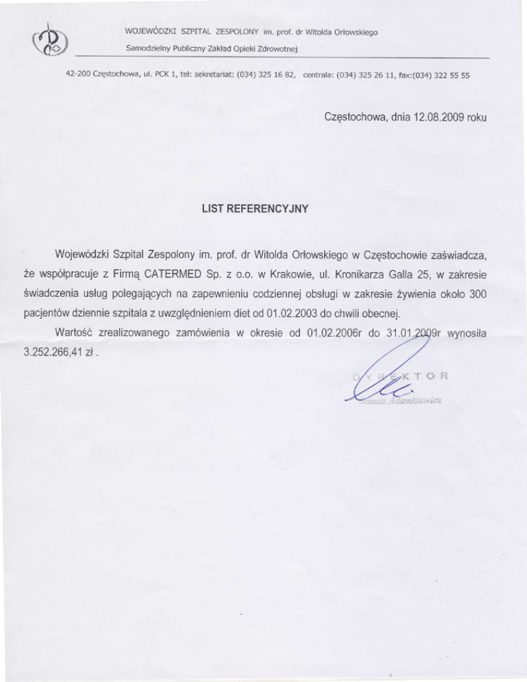 WoJEWoDzKISZPITALzEsPoLoNY im.prof.dr Wito|daorłowskiego samodzie|ny Pub|iczny zakładopiekizdrowotnej 42.200częstochowa, u|'PcK 1,te|:seketańat:(034)3251682, centra|a; (o34)32526 11,rax:(o34) 32255 55 Częstochowa, dnia12.08'2009 roku LISTREFERENCYJNY . WojewÓdzki Szpita| Zespo|ony im.prof'drWito|da orłowskiego w Częstochowie zaświadcza, żewspołpracuje z FirmąCATERMED Sp,z o'o.w Krakowie, ul,Kronikaza 25,w zakresie Ga||a po|egających świadczenia usług nazapewnieniu codziennej obsługi w zakresie żywienia około 300 pacjentów dz|ennie szpita|a z uvrzg|ędnieniem dietod01.02.2003 dochwili obecnej' Wańość zrea|izowanego zamÓwienia w okresie od 01.02'2006r do 31.01 3,252'266,41zł . wynosiła