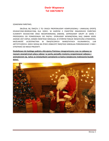 Dwór Wapowce Tel 166710672 SZANOWNI PAŃSTWO, ZBLIŻAJĄ SIĘ ŚWIĘTA Z TEJ OKAZJI PROPONUJEMY KOMPLEKSOWĄ I UNIKALNĄ OFERTĘ EDUKACYJNO-REKREACYJNĄ DLA DZIECI. W KAŻDYM Z PAKIETÓW ZNAJDZIEJCIE PAŃSTWO ELEMENTY EDUKACYJNE ORAZ NIEZAPOMNIANĄ ZABAWĘ. ZAPRASZAMY GRUPY ZE SZKÓŁ I PRZEDSZKOLI OD PONIEDZIAŁKU DO PIĄTKU. OFERUJEMY WEWNĘTRZNĄ SALĘ ZABAW GDZIE ZAWSZE JEST CIEPŁO, DOMEK ŚWIETEGO MIKOŁAJA, W KTÓRYM PANUJE ŚWIĄTECZNA ATMOSFERA, MOŻLIWOŚĆ UCZESTNICTWA W ŚWIĄTECZNYCH WARSZTATACH KULINARNYCH, LUB ARTYSTYCZNYCH. DZIECI MOGĄ NA ŻYWO ZOBACZYĆ ŚWIĘTEGO MIKOŁAJA POROZMAWIAĆ Z NIM I OTRZYMAĆ OD NIEGO PREZENTY. Dodatkowo do każdego pakietu oferujemy Państwu nieograniczony czas na zabawę na naszym zewnętrznym placu zabaw i w parku ponadto możemy zorganizować zabawy z animatorem np. tańce ze śnieżynkami zamykanie w bańce świąteczne malowanie buziek dzieci. Strona 1 Dwór Wapowce Tel 166710672 Pakiet na Świąteczne wypieki /4-5 godzin/ 25 zł/dziecko Wypiekanie pierniczków oraz zdobienie ich Obiad dla dzieci w Dworze Wapowce 1 godzina na sali zabaw Koliberek Spotkanie ze Świętym Mikołajem - rozdawanie przez niego prezentów, zabawy z nim (prezenty nie są wliczone w cenę, możemy je zakupić dla Państwa lub Państwo mogą je przynieść albo Mikołaj może rozdawać cukierki) Pakiet Mikołajowy/2-3 godzin/ 20 zł/dziecko 1 godzina na sali zabaw Koliberek Obiad dla dzieci w Dworze Wapowce Spotkanie ze Świętym Mikołajem - rozdawanie przez niego prezentów, zabawy z nim (prezenty nie są wliczone w cenę, możemy je zakupić dla Państwa lub Państwo mogą je przynieść albo Mikołaj może rozdawać cukierki) Pakiet mały kucharz /2-2,5 godzin/ 17 zł/dziecko robienia słodkich rogalików (dzieci mogą potem zjeść to co wykonały) 1 godzina na sali zabaw Koliberek Spotkanie ze Świętym Mikołajem - rozdawanie przez niego prezentów, zabawy z nim (prezenty nie są wliczone w cenę, możemy je zakupić dla Państwa lub Państwo mogą je przynieść albo Mikołaj może rozdawać cukierki) Pakiet artystyczny /4-5 godzin/ 27 zł/dziecko Warsztaty robienia stroików świątecznych 1 godzina na sali zabaw Koliberek Obiad dla dzieci w Dworze Wapowce Spotkanie ze Świętym Mikołajem - rozdawanie przez niego prezentów, zabawy z nim (prezenty nie są wliczone w cenę, możemy je zakupić dla Państwa lub Państwo mogą je przynieść albo Mikołaj może rozdawać cukierki) Strona 2