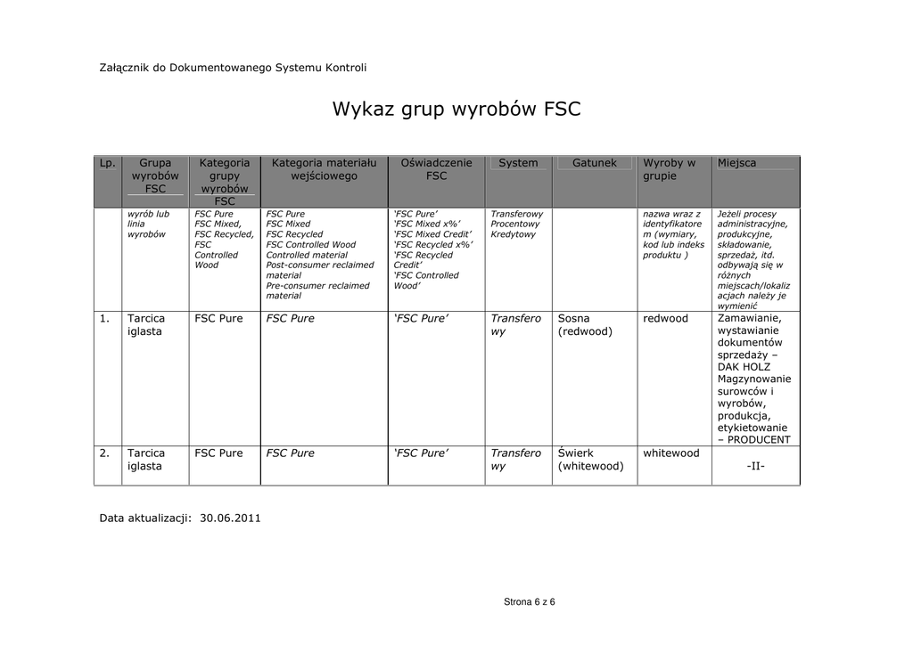 Załącznik do Dokumentowanego Systemu Kontroli Wykaz grup wyrobów FSC Lp. Grupa wyrobów FSC Kategoria grupy wyrobów FSC Kategoria materiału wejściowego Oświadczenie FSC System Gatunek Wyroby w grupie Miejsca nazwa wraz z identyfikatore m (wymiary, kod lub indeks produktu ) Jeżeli procesy administracyjne, produkcyjne, składowanie, sprzedaż, itd. odbywają się w różnych miejscach/lokaliz acjach należy je wymienić Zamawianie, wystawianie dokumentów sprzedaży – DAK HOLZ Magzynowanie surowców i wyrobów, produkcja, etykietowanie – PRODUCENT wyrób lub linia wyrobów FSC Pure FSC Mixed, FSC Recycled, FSC Controlled Wood FSC Pure FSC Mixed FSC Recycled FSC Controlled Wood Controlled material Post-consumer reclaimed material Pre-consumer reclaimed material ‘FSC Pure’ ‘FSC Mixed x%’ ‘FSC Mixed Credit’ ‘FSC Recycled x%’ ‘FSC Recycled Credit’ ‘FSC Controlled Wood’ Transferowy Procentowy Kredytowy 1. Tarcica iglasta FSC Pure FSC Pure ‘FSC Pure’ Transfero wy Sosna (redwood) redwood 2. Tarcica iglasta FSC Pure FSC Pure ‘FSC Pure’ Transfero wy Świerk (whitewood) whitewood Data aktualizacji: 30.06.2011 Strona 6 z 6 -II-