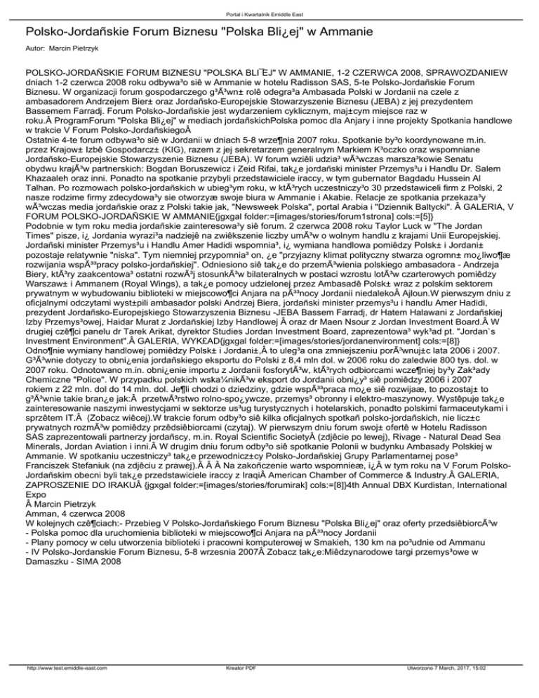 POLSKO-JORDAÑSKIE FORUM BIZNESU "POLSKA BLI¯EJ" W AMMANIE, 1-2 CZERWCA 2008, SPRAWOZDANIEW