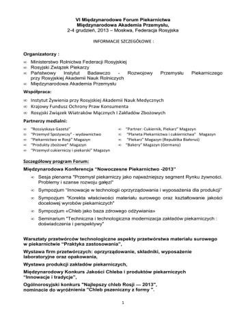 VI Międzynarodowe Forum Piekarnictwa Międzynarodowa Akademia Przemysłu, 2-4 grudzień, 2013 – Moskwa, Federacja Rosyjska INFORMACJE SZCZEGÓŁOWE : Organizatorzy : • • • • Ministerstwo Rolnictwa Federacji Rosyjskiej Rosyjski Związek Piekarzy Instytut Badawczo Rozwojowy Państwowy przy Rosyjskiej Akademii Nauk Rolniczych Międzynarodowa Akademia Przemysłu Przemysłu Piekarniczego Współpraca: • Instytut Żywienia przy Rosyjskiej Akademii Nauk Medycznych • Krajowy Fundusz Ochrony Praw Konsumenta • Rosyjski Związek Wiatraków Mącznych I Zakładów Zbożowych Partnerzy medialni: • • • • • “Rossiyskaya Gazeta” “Przemysł Spożywczy” - wydawnictwo “Piekarnictwo w Rosji” Magazyn “Produkty zbożowe” Magazyn “Przemysł cukierniczy i piekarski” Magazyn • • • • “Partner: Cukiernik, Piekarz” Magazyn “Planeta PIekarnictwa i cukiernictwa" Magazyn “Piekarz” Magazyn (Republika Białoruś) “Bakery” Magazyn (Germany) Szczegółowy program Forum: Międzynarodowa Konferencja “Nowoczesne Piekarnictwo -2013” • Sesja plenarna "Przemysł piekarniczy jako najważniejszy segment Rynku żywności. Problemy i szanse rozwoju gałęzi" • Sympozjum “Innowacje w technologii oprzyrządowania i wyposażenia dla produkcji” • Sympozjum "Korekta właściwości materiału surowego oraz kształtowanie jakości docelowej wyrobów piekarniczych" • Sympozjum «Chleb jako baza zdrowego odżywiania» • Seminarium "Techniczna i technologiczna modernizacja zakładów piekarniczych : doświadczenia i perspektywy" Warsztaty przetwórców technologiczne aspekty przetwórstwa materiału surowego w piekarnictwie “Praktyka zastosowania”, Wystawa firm przetwórczych: oprzyrządowanie, składniki, wyposażenie laboratoryjne oraz opakowania, Wystawa produkcji zakładów piekarniczych, Międzynarodowy Konkurs Jakości Chleba i produktów piekarniczych “Innowacje i tradycje”, Ogólnorosyjski konkurs "Najlepszy chleb Rosji — 2013", nominacie do wyróżnienia "Chleb pszeniczny z formy ". 1 Forum adresowane jest do : szefów firm i holdingów, dyrektorów zarządzających i handlowych, zarządzających, dyrektorów koncernów piekarniczych, top managementu federalnych i regionalnych legislacyjnych i nadzorczych, głównych inżynierów produkcji, głównych technologów żywności, specjalistów ds. małych i średnich przedsiębiorstw piekarniczych, reprezentantów rosyjskich i zagranicznych firm, związków i stowarzyszeń branży piekarniczej, naukowców, studentów studiów podyplomowych, przedstawicieli prasy i mediów. Opłaty rejestracyjne (bez VAT) • 1 uczestnik forum • Stoisko wystawowe plus 1 uczestnik forum €400 €1,000 Możliwości patronatu sponsorskiego Gold sponsor (bez VAT) €4,000 Korzysci: - Logo banner w holu głównym forum - Logo firmy umieszczone w przewodnim filmie reklamowym otwierającycm forum (video clip – duży ekran) - Logo firmy umieszczone na oficjalnych materiałach forum - Film promocyjny - ekran LCD - Stiosko wystawowe - 3 dodatkowe wejściówki - Prezentacja firmy na forum Silver sponsor (bez VAT) €3,000 Korzysci: - Logo banner w holu głównym forum - Logo firmy umieszczone w przewodnim filmie reklamowym otwierającycm forum (video clip – duży ekran) - Stiosko wystawowe - 1 dodatkowa wejściówka - Prezentacja firmy na forum Warunki zgłoszenia i zapłaty • W celu wzięcia udziału w forum prosimy o wypełnienie formularza rejestracyjnego – w załączeniu - (application form) i przesłanie go do Komitetu Organizacyjnego forum • Faktura zostanie wystawiona po otrzymaniu należycie wypełnionego formularza rejestracyjnego a następnie przesłana do uczestnika forum faxem lub pocztą E-mail Publikacja materiałów, prezentacji • W celu publikacji Państwa prezentacji w materiałach z forum podsumowania / streszczenia prezentacji max 4 strony (Word Format: Times New Roman 14) prosimy przekazywać Komitetowi Organizacyjnemu forum w terminie nie przekraczającym 15 listopada , 2013 Lokalizacja forum • 20, Pervy Shchipkovsky pereulok, Moskwa, 115093 (najbliższa stacja metro : Serpukhovskaya and Paveletskaya). 2 Referencje i zgłoszenia • Dr. Vladimir I. Dashevsky, Director, Int’l Cooperation, • Tel./Fax: +7 (499) 235-4281, (495) 959-6669 • E-mail: [email protected], [email protected] • Website: www.grainfood.ru Zakwaterowanie (nie uwzględnione w opłacie rejestracyjnej): • Zaleca się dokonywanie rezerwacji w hotelu Ibis Moscow Paveletskaya , oficjalnego partnera forum, zlokalizowanym bezpośrednio na przeciwko miejsca forum na ulicy Shchipok nr. 22, budynek. 1, Moskwa 115093, Rosja • Hotel oferuje zniżkę w wysokości 10% oficjalnie publikowanej ceny pokoi • Hotel oferuje pomoc w uzyskaniu wizy rosyjskiej Osoba do kontaktu w Hotelu Ibis Moscow Paveletskaya : Mr. Alexey Savelyev, Reservations Manager Tel: +7 (495) 661-8500, fax: +7 (495) 661-8501, e-mail: [email protected] Uwaga: w celu otrzymania zniżki podczas dokonywania rezerwacji pokoju prosimy powołac się na uczestnictwo w forum organizowanym przez Międzynarodową Akademię Przemysłu (International Industrial Academy) Program 2 grudzień, 2013, Poniedziałek 9.00 – 16.00 Przyjazd i rejestracja uczestników, zakwaterowanie w hotelu 10.00 – 15.00 "Krajowa degustacja" próbki chleba – finaliści ogólnorosyjskiego konkursu "Najlepszy chleb Rosji — 2013", nominacje do wyróżnienia "Chleb pszeniczny z formy ". 12.00 – 17.00 14.00 – 17.00 14.00 – 17.00 Spotkanie z członkami komisji testującej w Międzynarodowym Konkursie jakości chleba i produktów piekarniczych Seminarium producentów oprzyrządowania piekarniczego Warsztaty przetwórców technologiczne aspekty przetwórstwa materiału surowego w piekarnictwie “Praktyka zastosowania” 3 grudzień, 2013, Wtorek 9.00 – 10.00 Rejestracja uczestników 9.00 – 17.00 Wystawa firm przetwórczych: oprzyrządowanie, składniki, wyposażenie laboratoryj